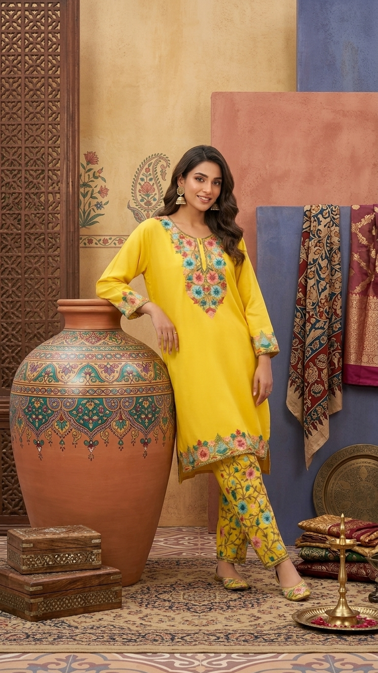 Modern Kashmir resonates with the amalgamation of fashion and culture . So we bring to you the ethos of Kashmir with a twirl of modernity and novelty .