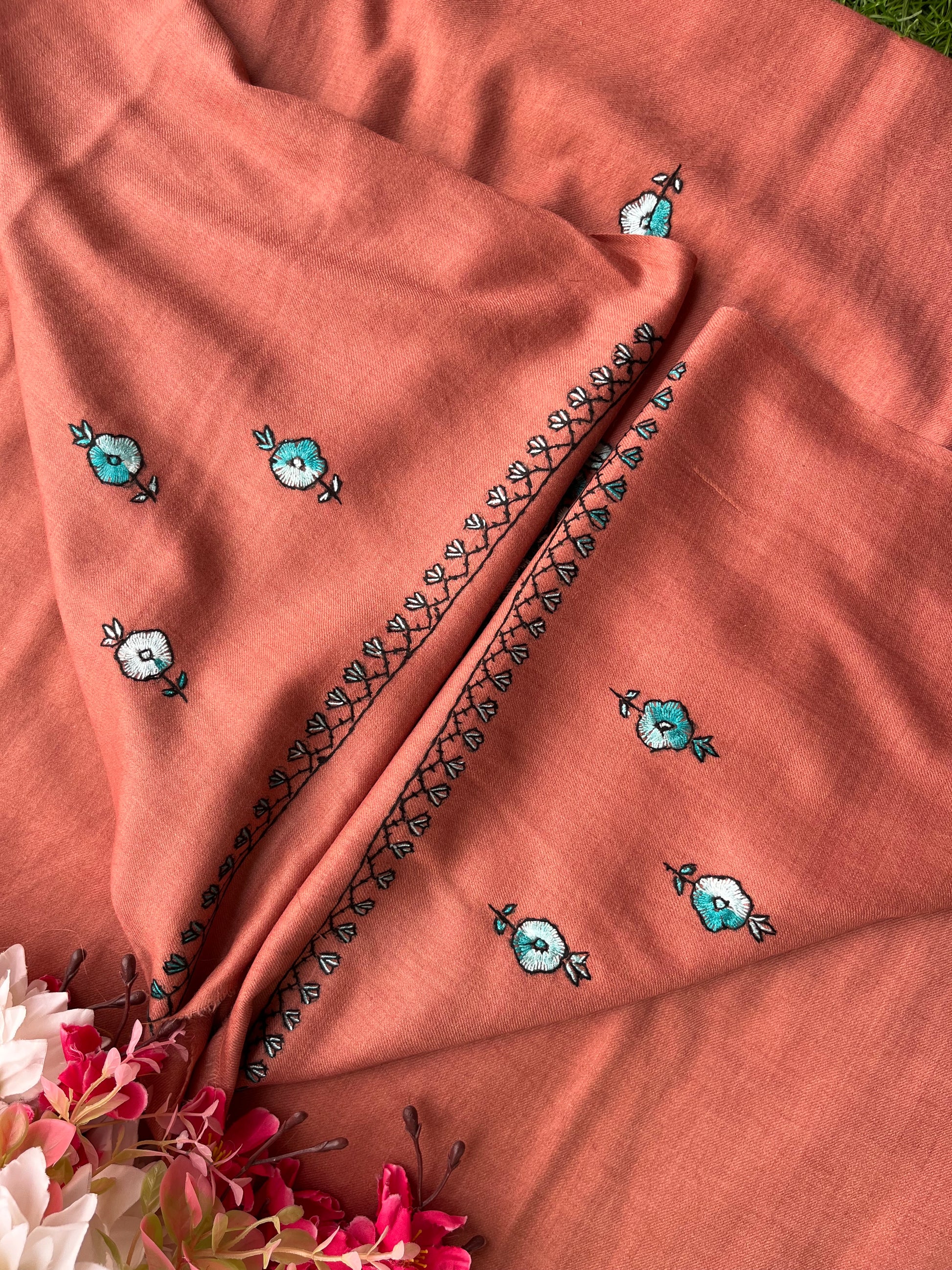 Peach Fine Wool Sozni Embroidered 3pc Suit Stole