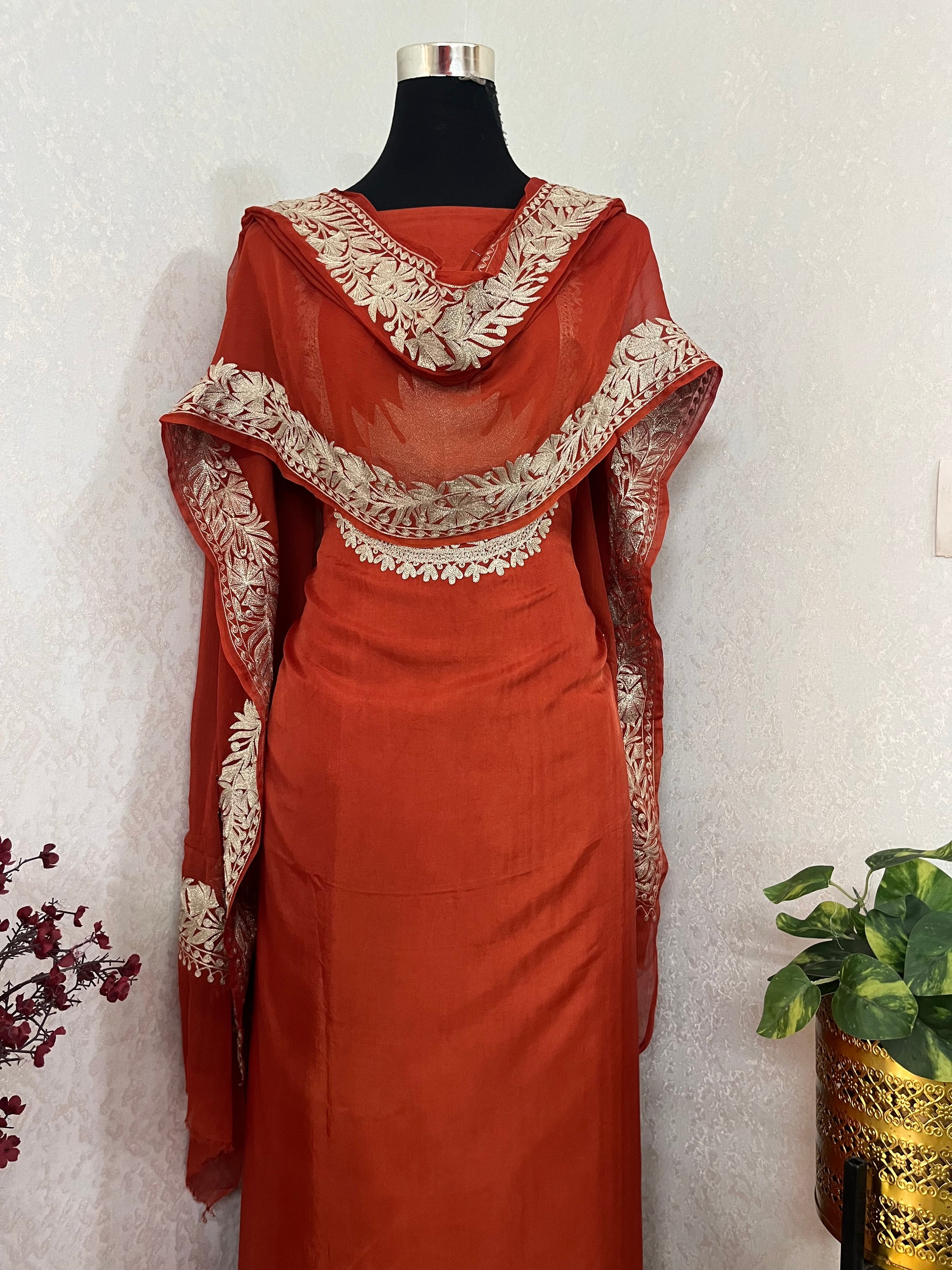 Indulge in the epitome of elegance with this luxury Kashmiri Tilla embroidered suit. Meticulously handcrafted with intricate details , this opulent ensemble exudes regality and showcases the rich cultural heritage of Kashmir.