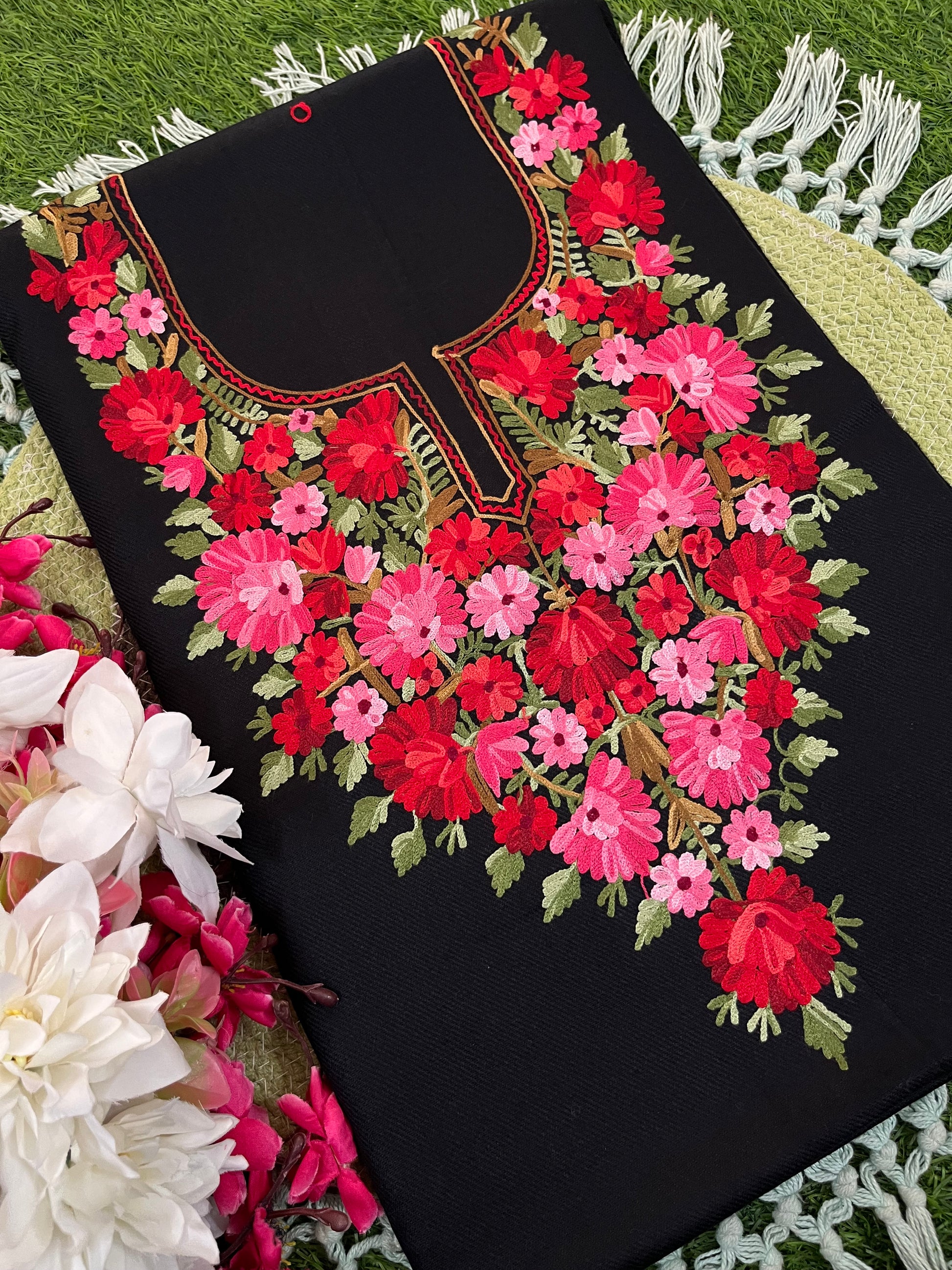 "Indulge in the timeless allure of Kashmiri embroidered cashmilon suits, a harmonious blend of intricate craftsmanship and the comforting warmth of wool. Embrace tradition and elegance while cocooned in luxurious, handcrafted ensembles, perfect for chilly days."