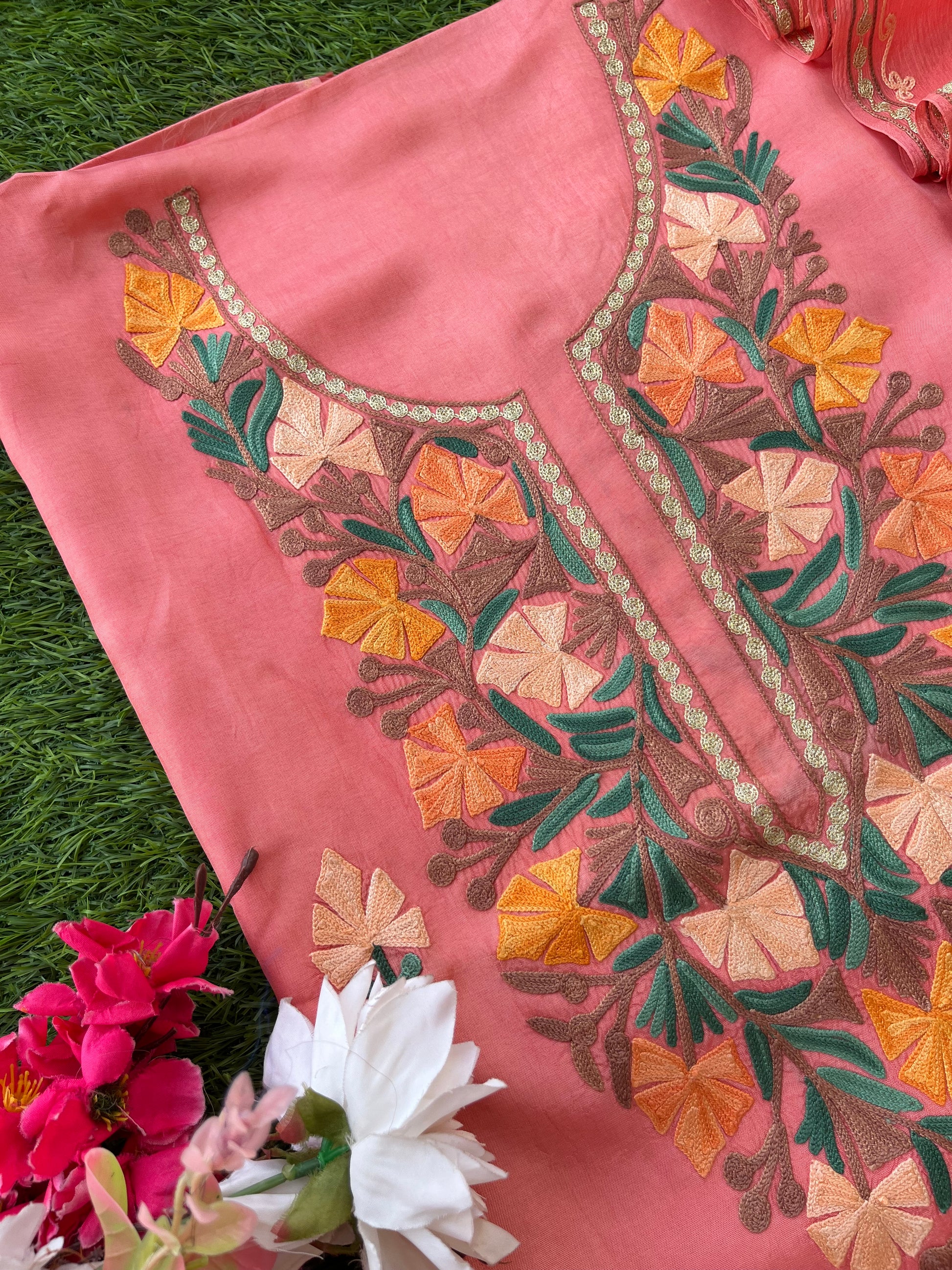 “Elegance meets tradition in this exquisite Kashmiri silk suit. Adorned with intricate embroidery, it exudes grace. Paired with a stunning heavy-embroidered dupatta, it’s a timeless ensemble of sophistication.”