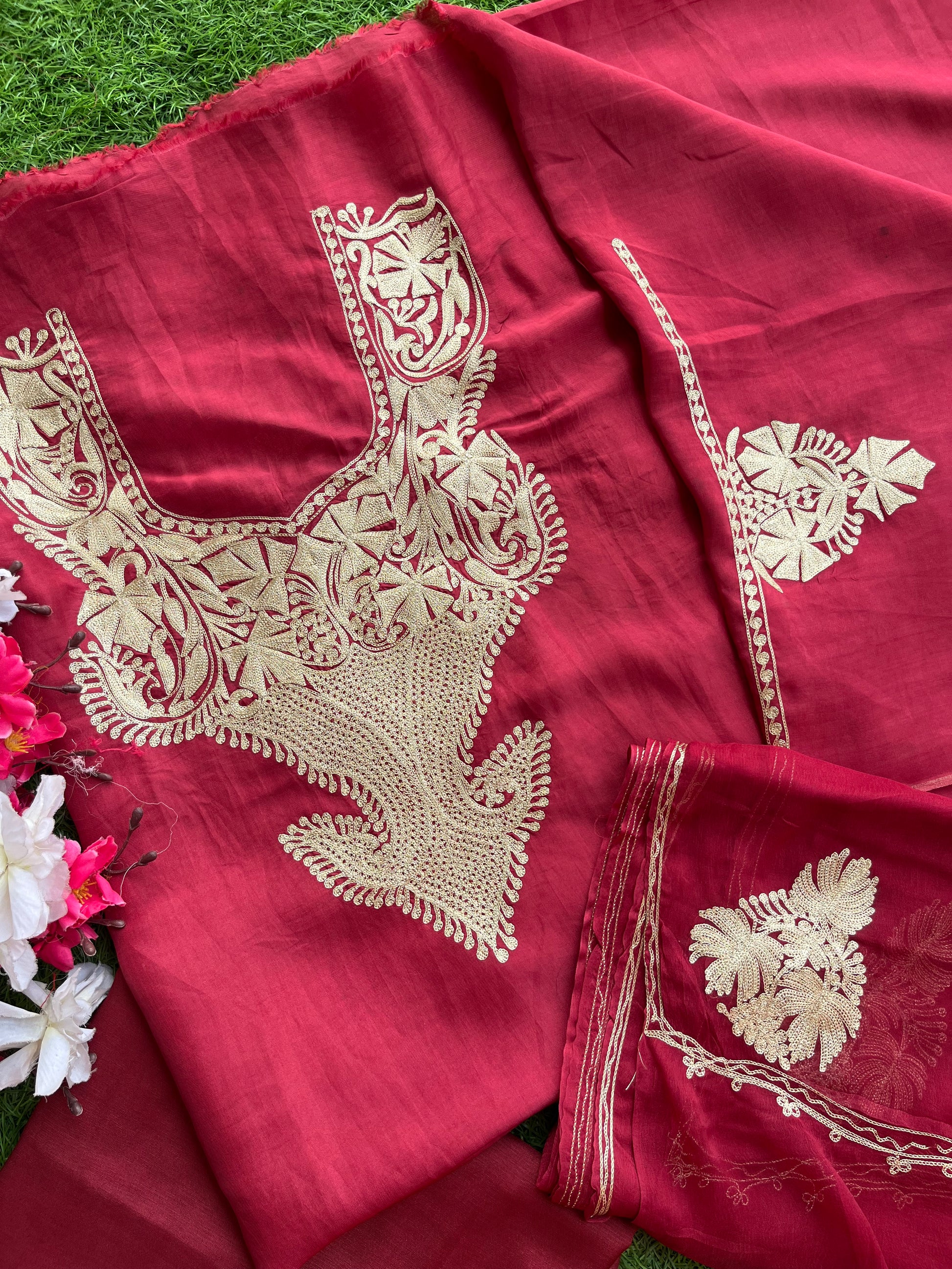 Experience the exquisite artistry of Kashmiri tilla embroidery .Each stitch tells a tale of craftsmanship, tradition, and intricate beauty. Elevate your wardrobe with this timeless treasure.