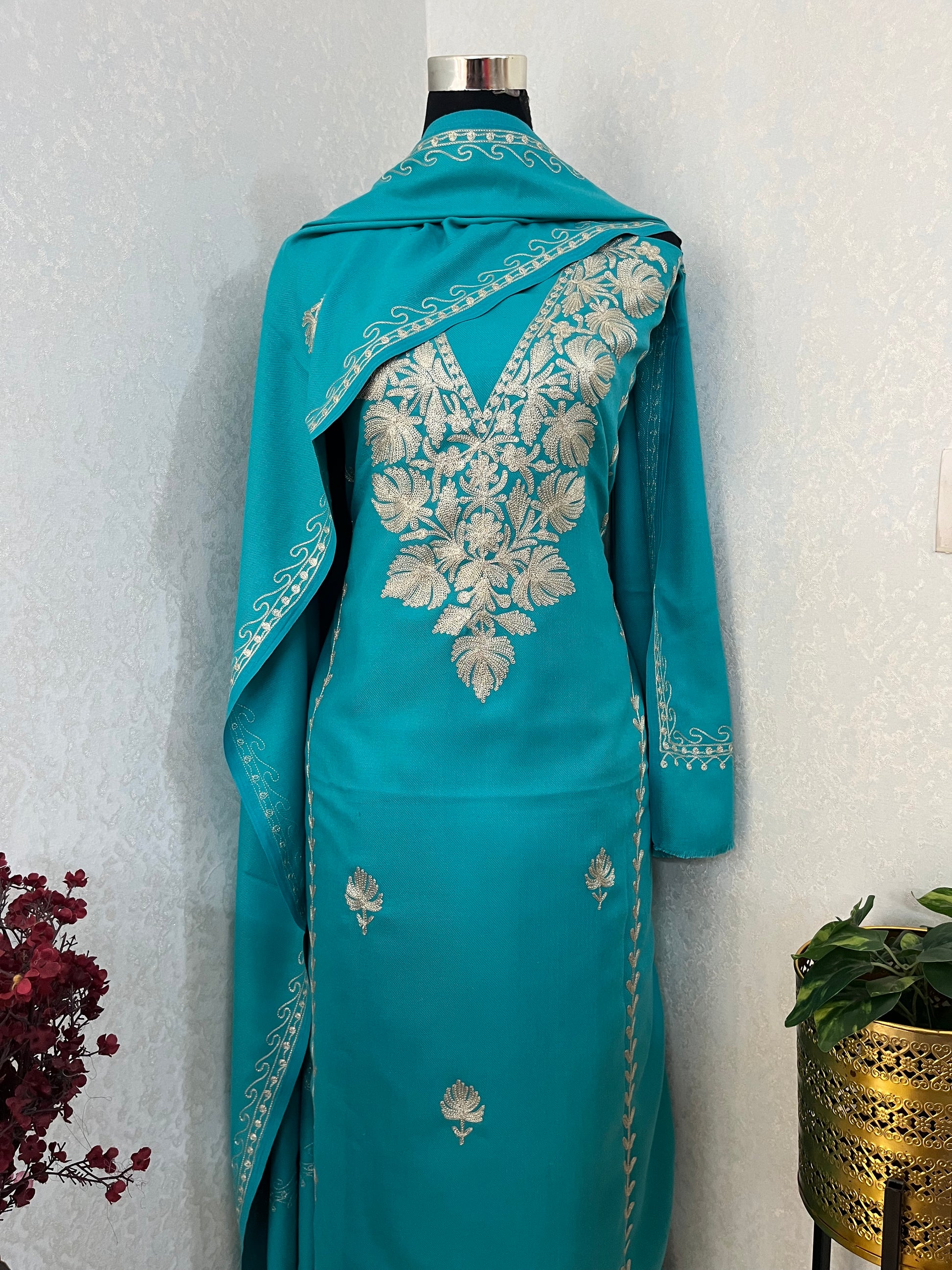 Be winter ready this season with these warm woollen three piece sets in contrasting colors and complementing embroidery !
