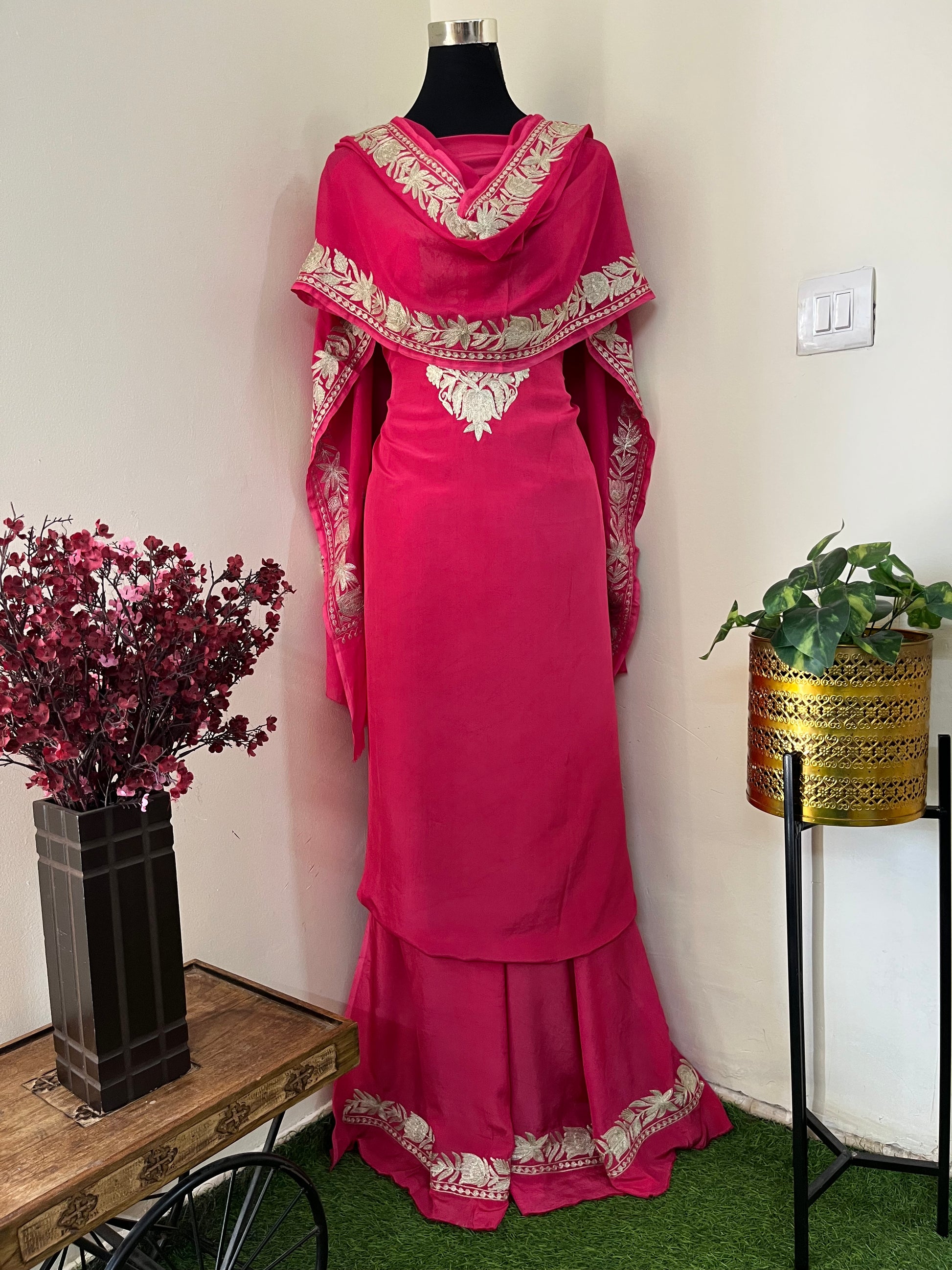 Elevate your style with this exquisite Kashmiri crape suit, adorned with intricate tilla and aari embroidery. Paired with a heavily embellished dupatta, this elegant ensemble beautifully blends traditional craftsmanship with timeless sophistication, perfect for festive and special occasions.