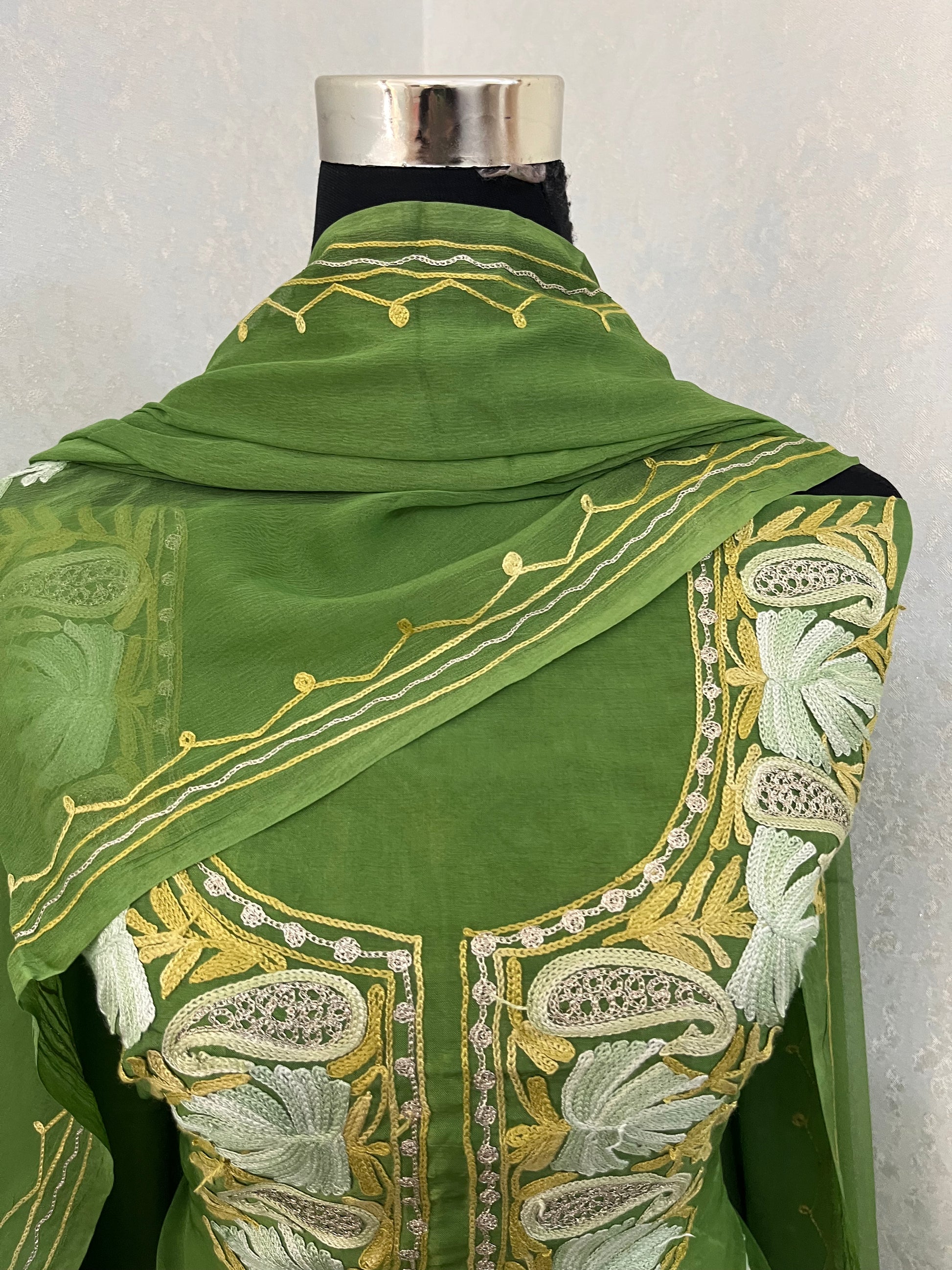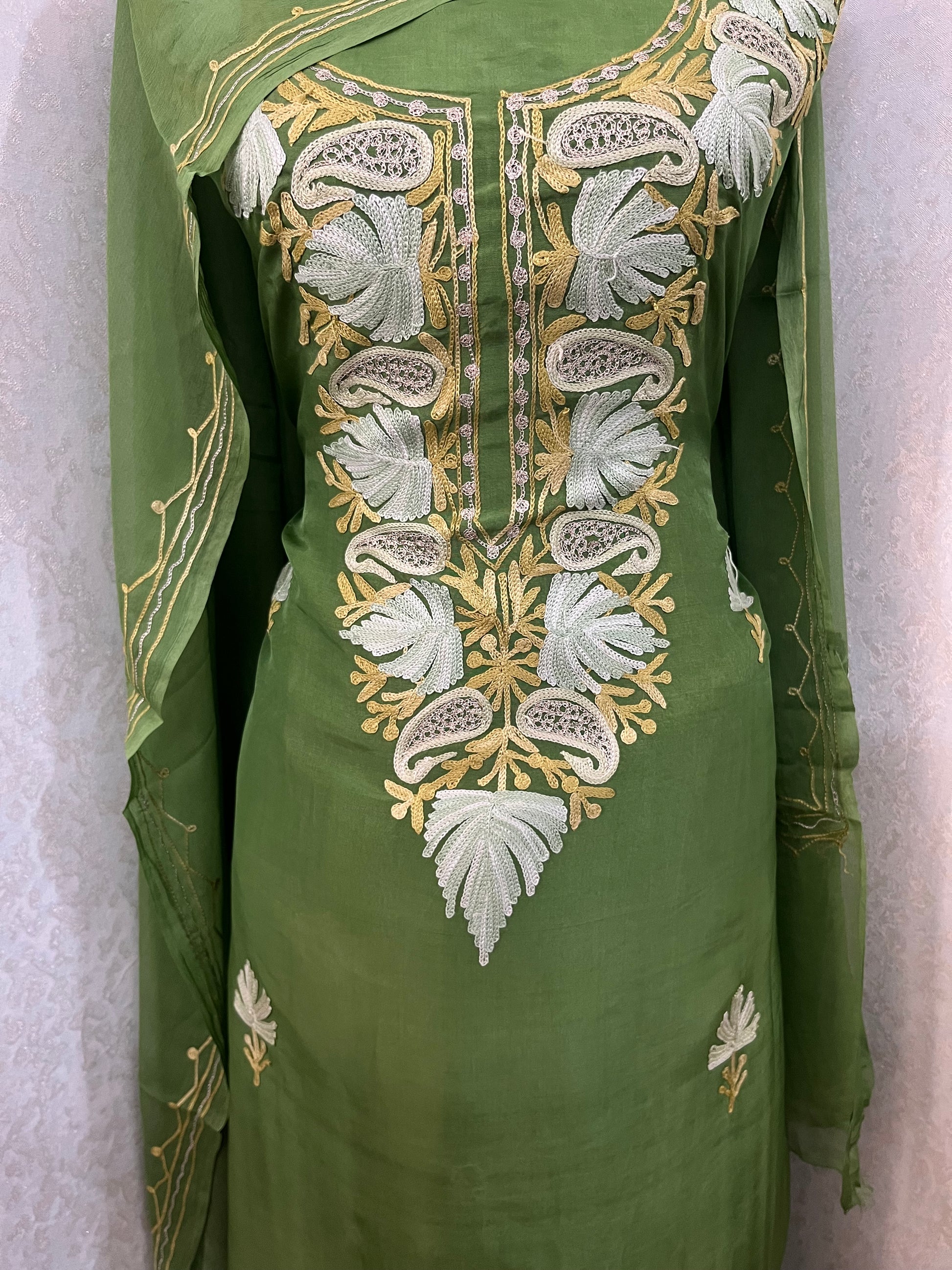 “Elegance meets tradition in this exquisite Kashmiri silk suit. Adorned with intricate embroidery, it exudes grace. Paired with a stunning heavy-embroidered dupatta, it’s a timeless ensemble of sophistication.”