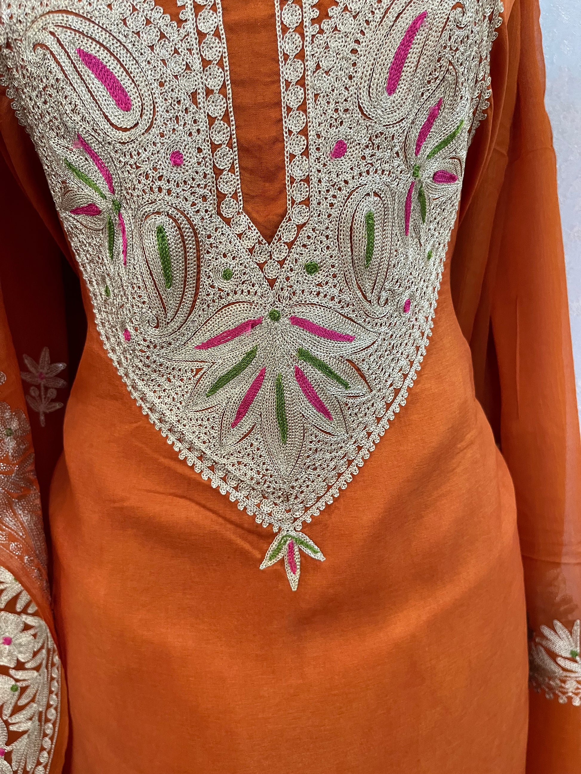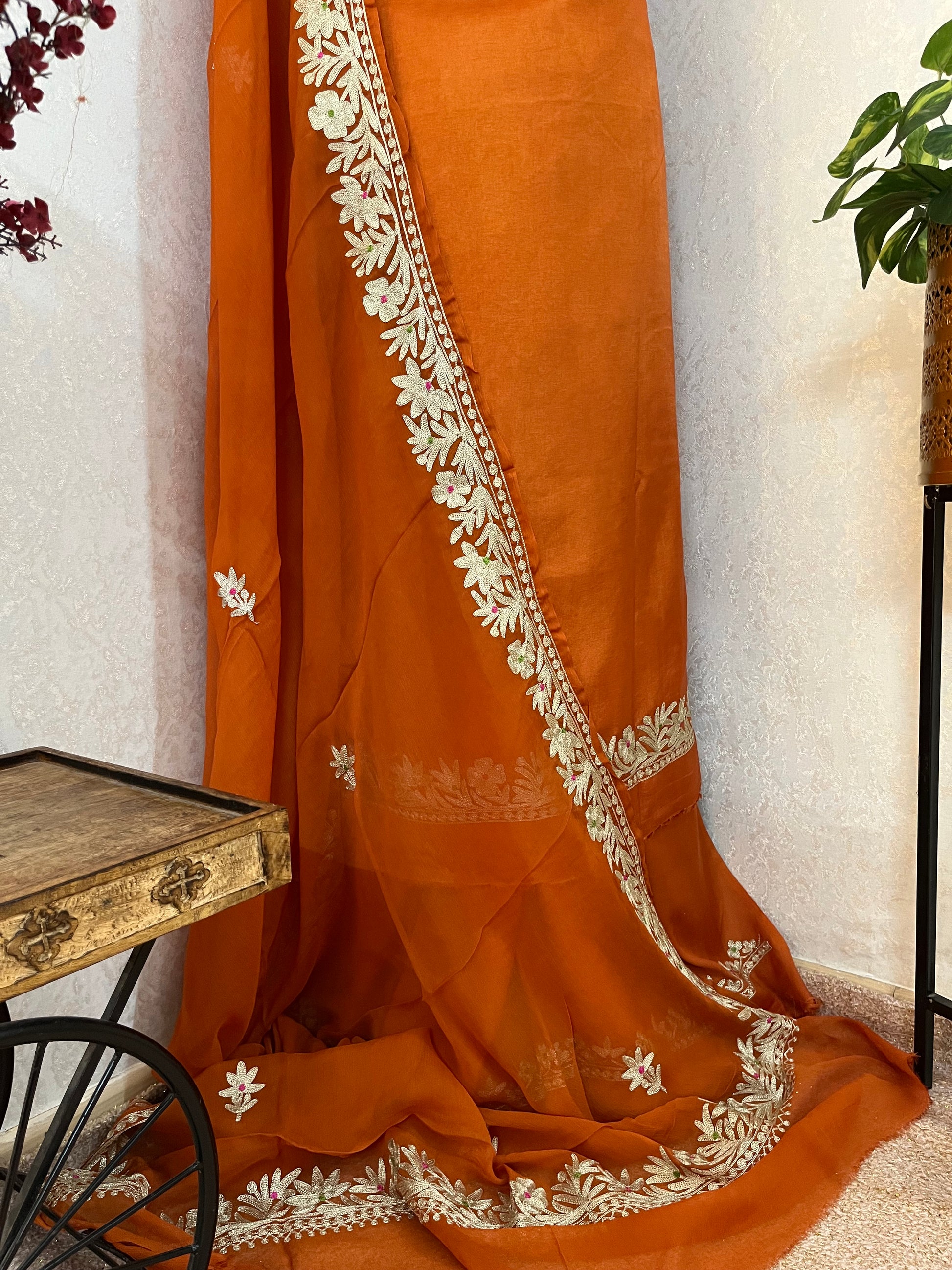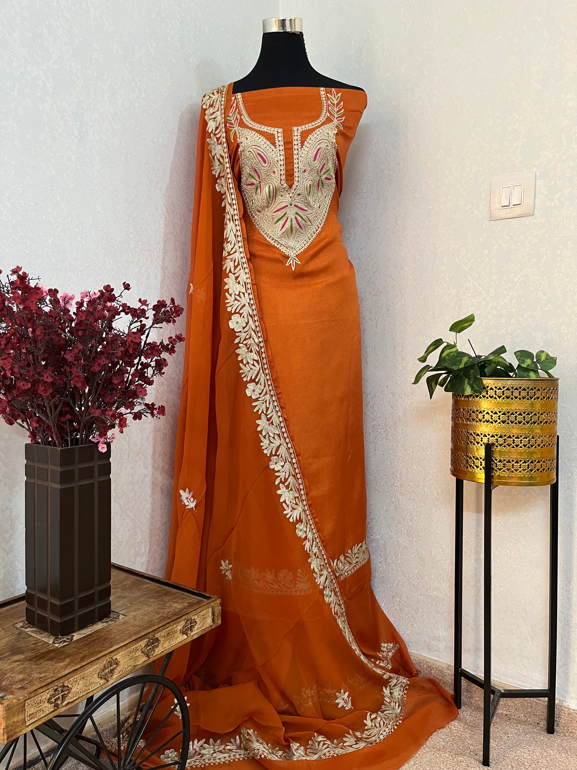 Elevate your style with this pure and traditional Kashmiri suit featuring intricate Aari and Tilla fusion embroidery. Crafted in premium opada silk fabric, it comes with a pure chiffon dupatta and matching cotton silk bottom. The dupatta boasts a beautifully detailed border, adding grace and richness to the overall ensemble.
