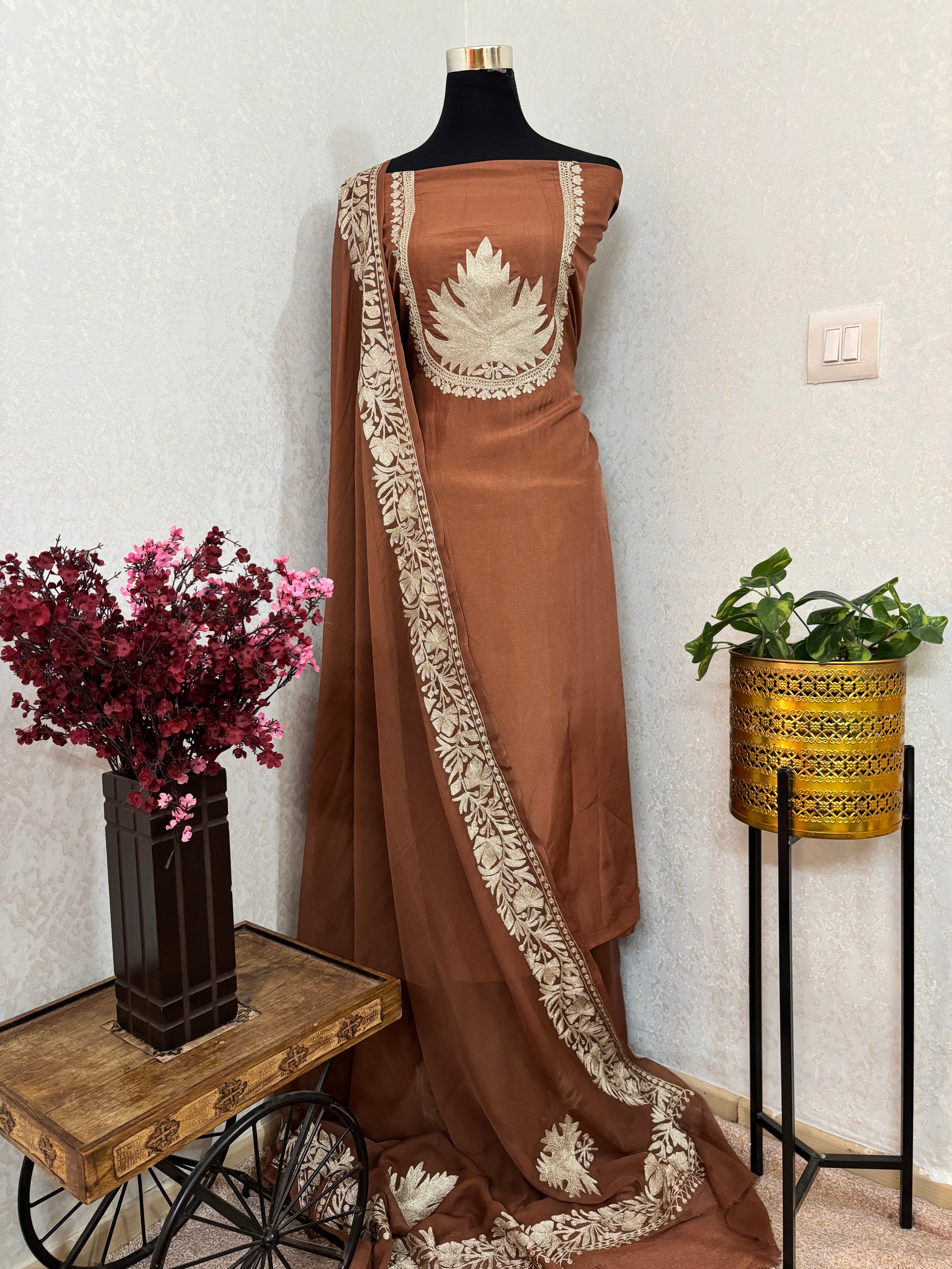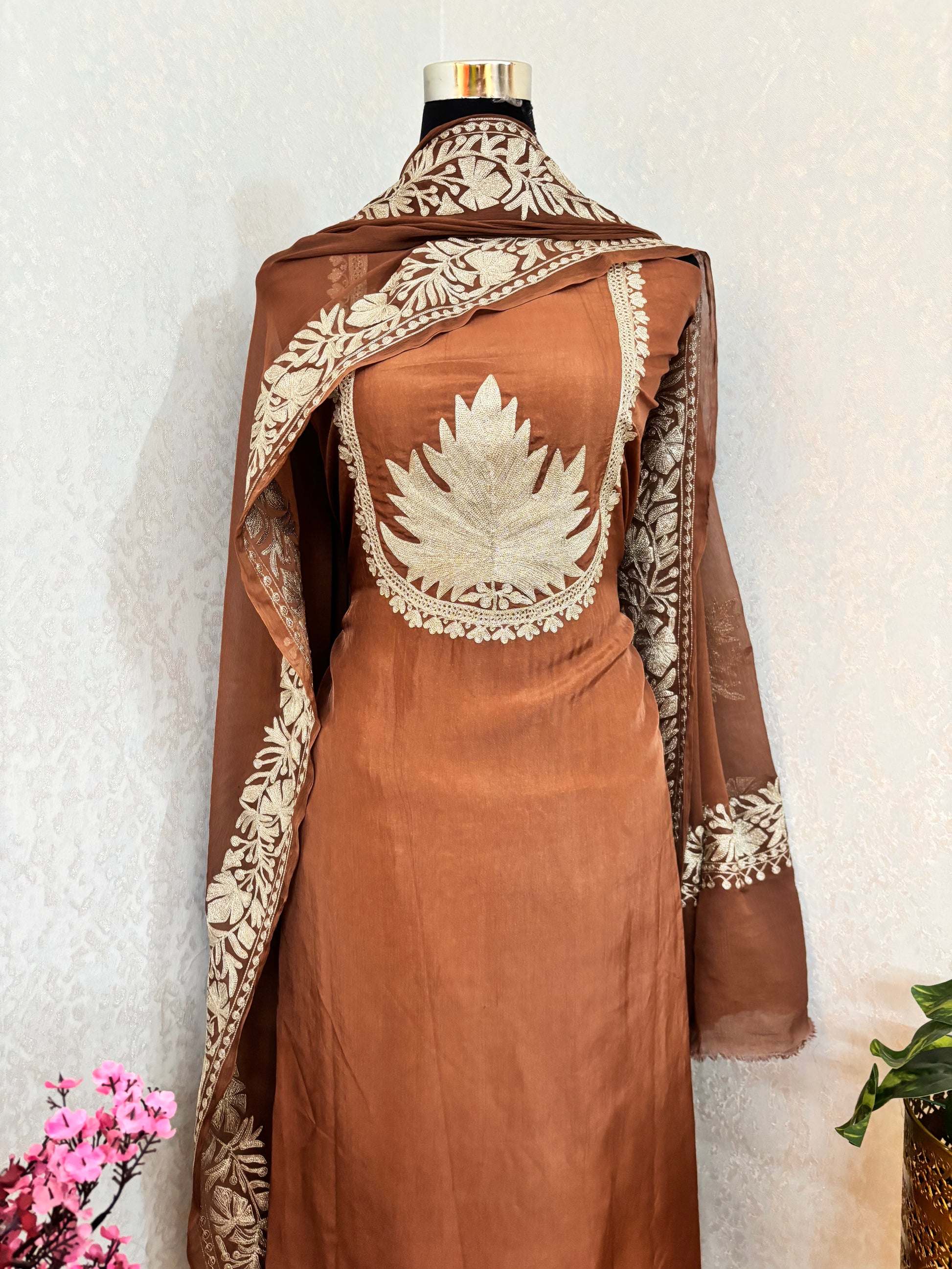 Indulge in the epitome of elegance with this luxury Kashmiri Tilla embroidered suit. Meticulously handcrafted with intricate details , this opulent ensemble exudes regality and showcases the rich cultural heritage of Kashmir.
