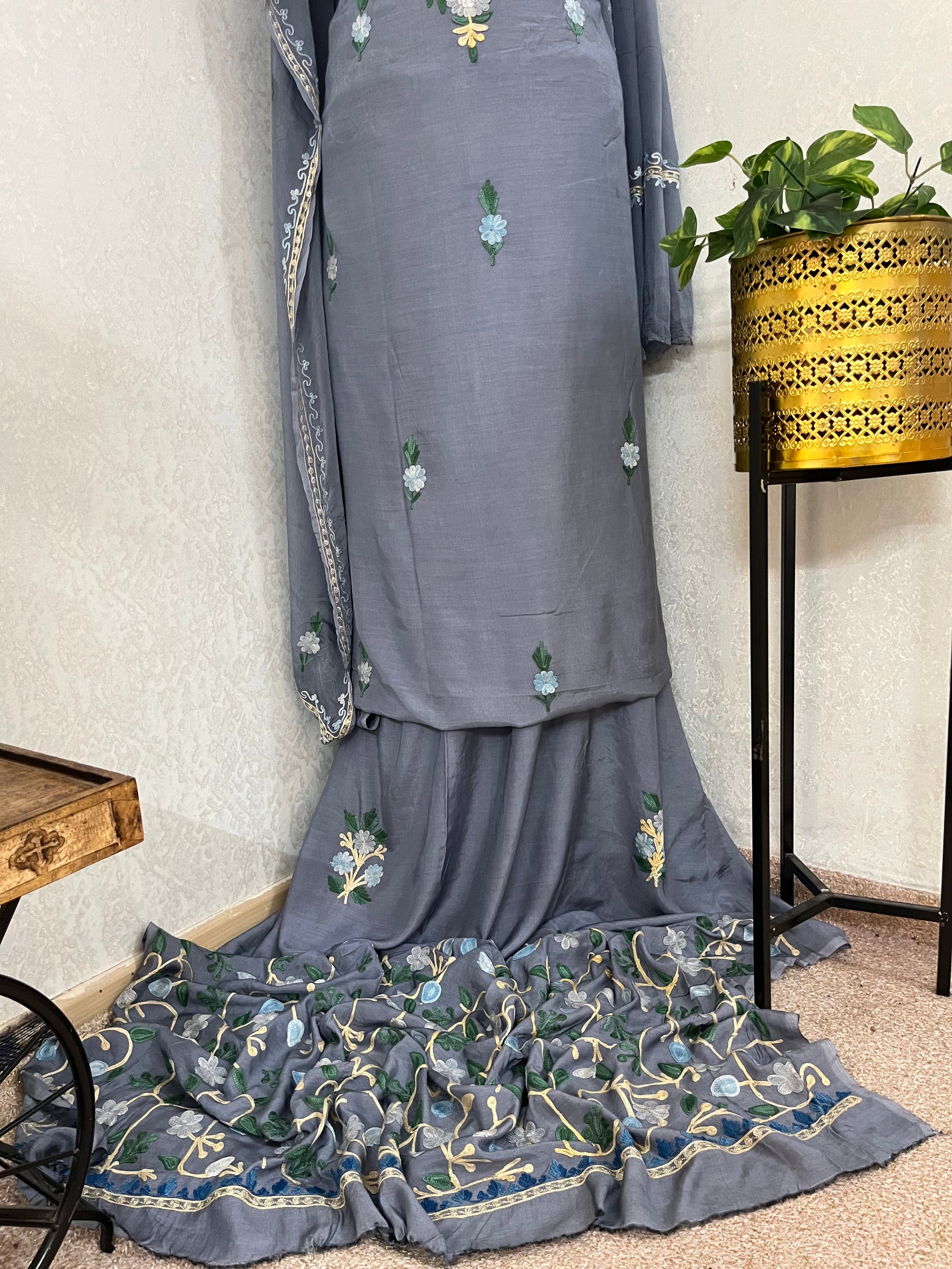 English Grey Muslin Cotton Jaal Sleeves Kashmiri 3pc Suit