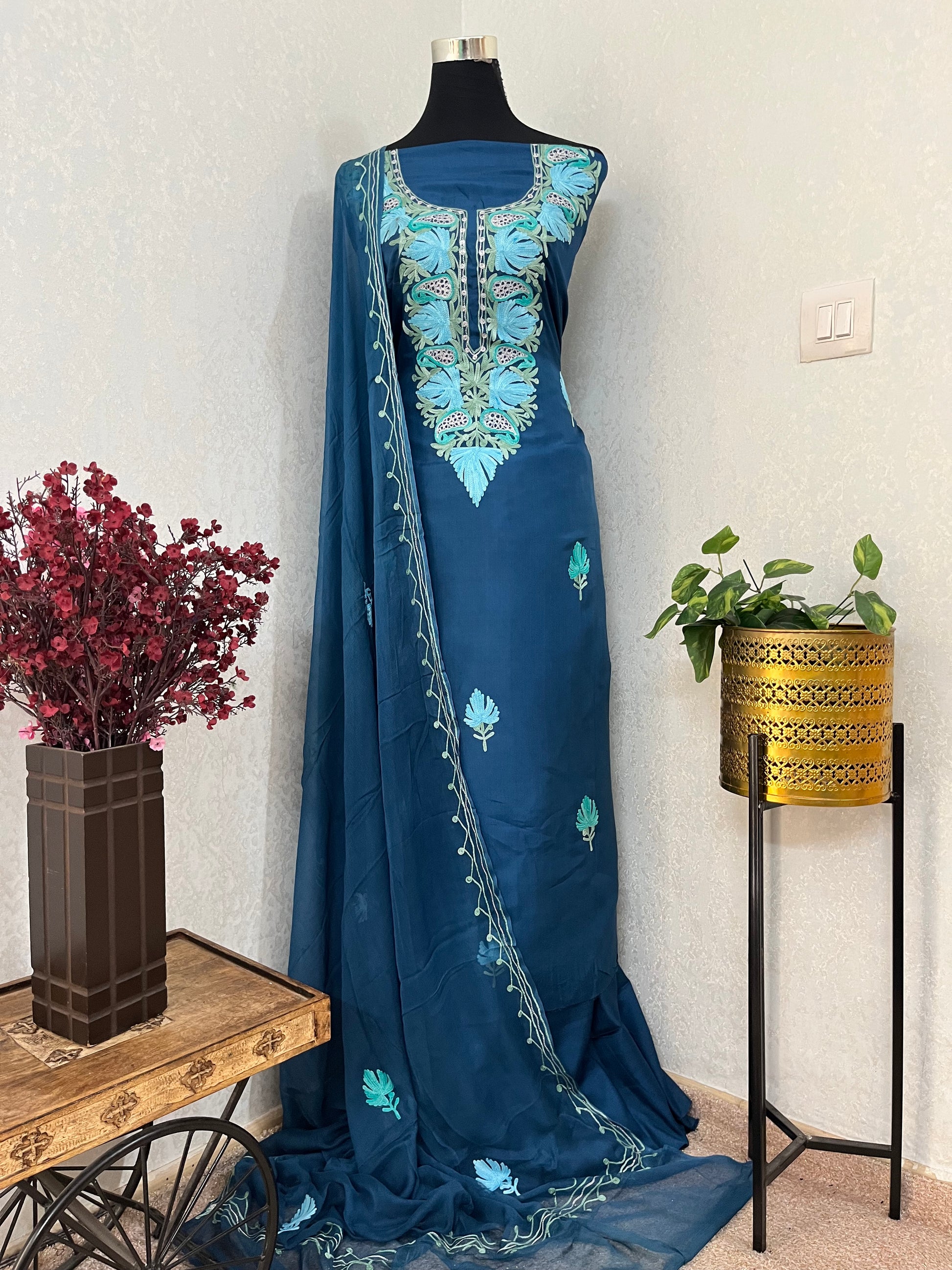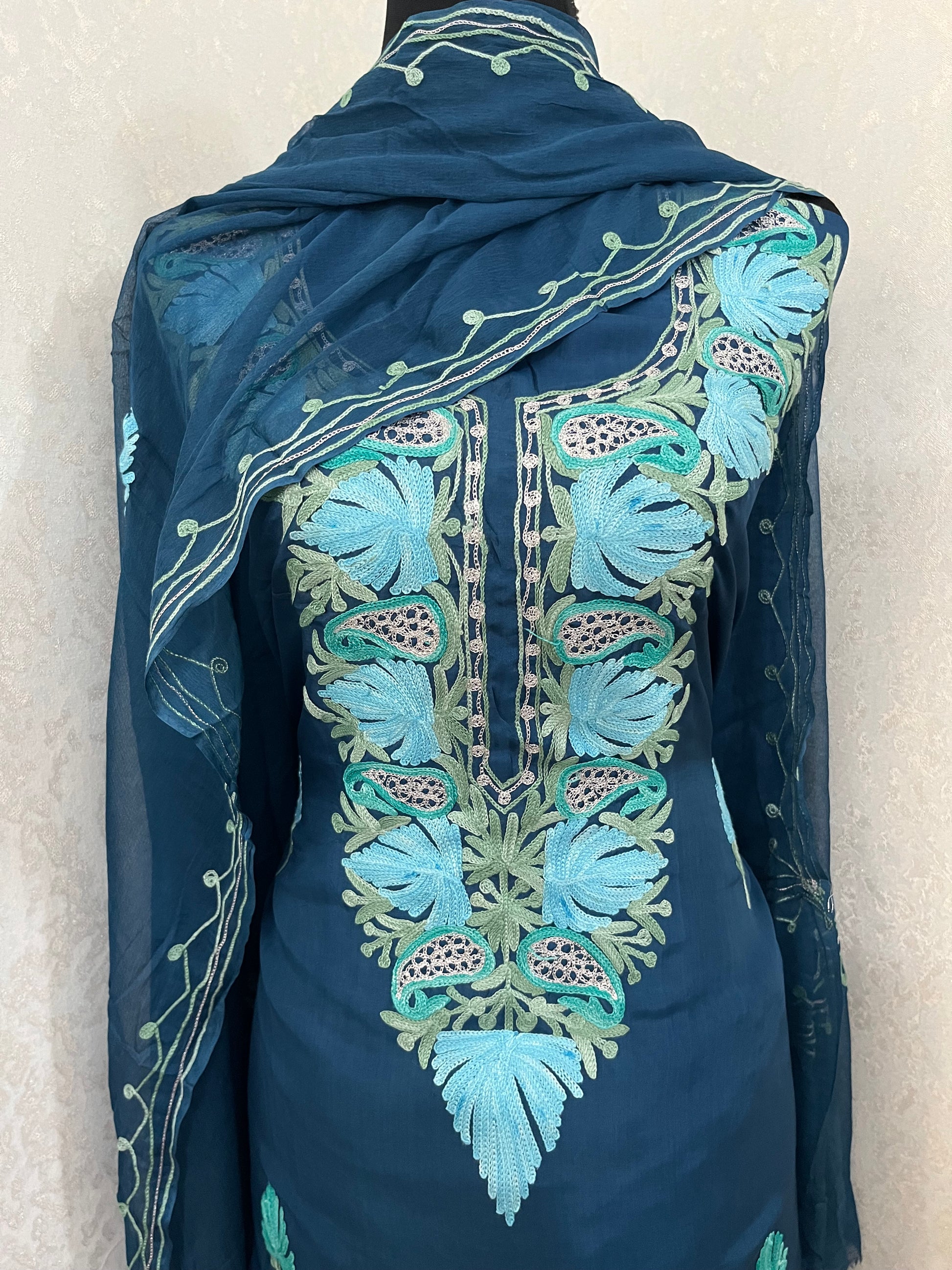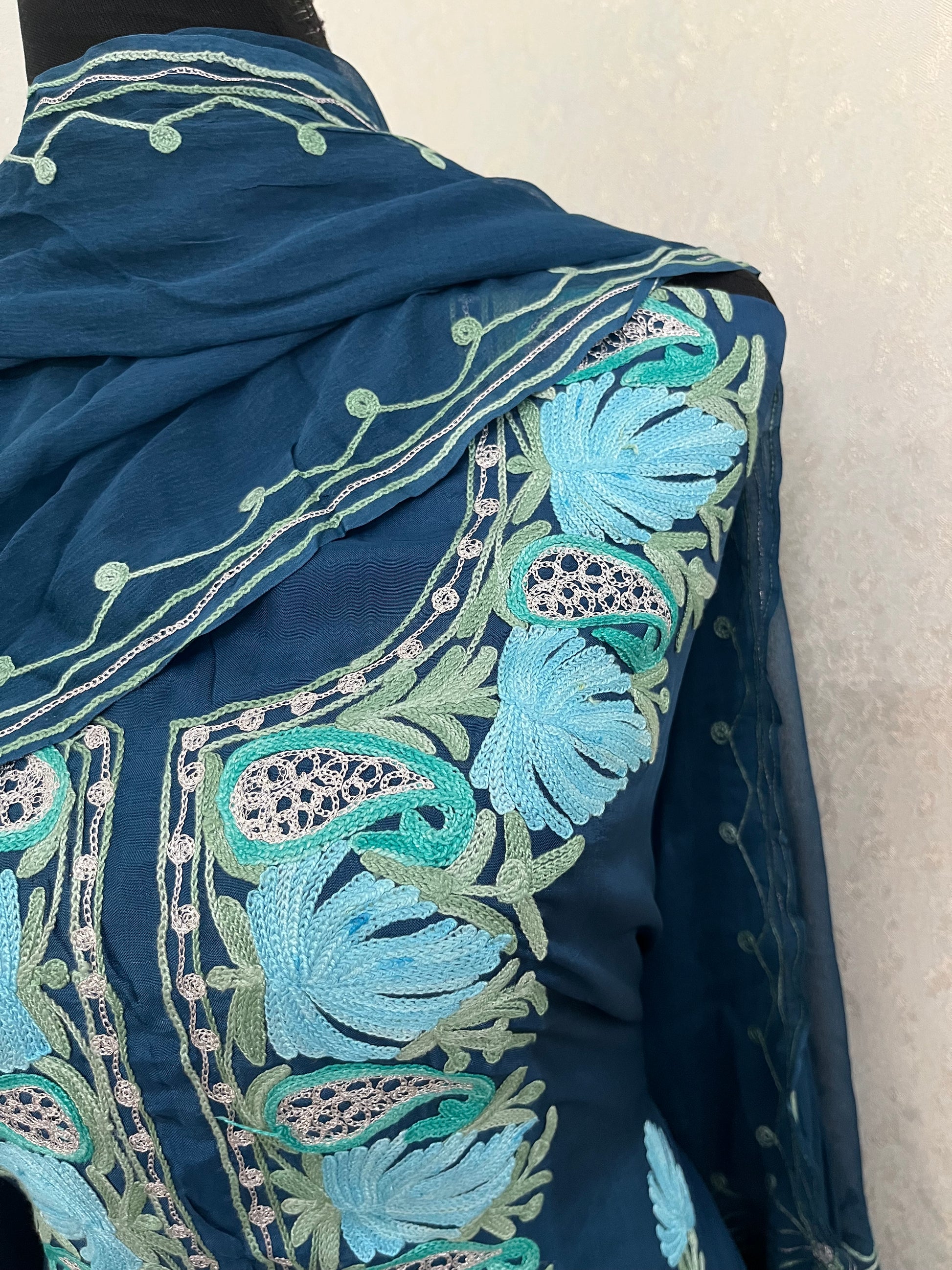 “Elegance meets tradition in this exquisite Kashmiri silk suit. Adorned with intricate embroidery, it exudes grace. Paired with a stunning heavy-embroidered dupatta, it’s a timeless ensemble of sophistication.”