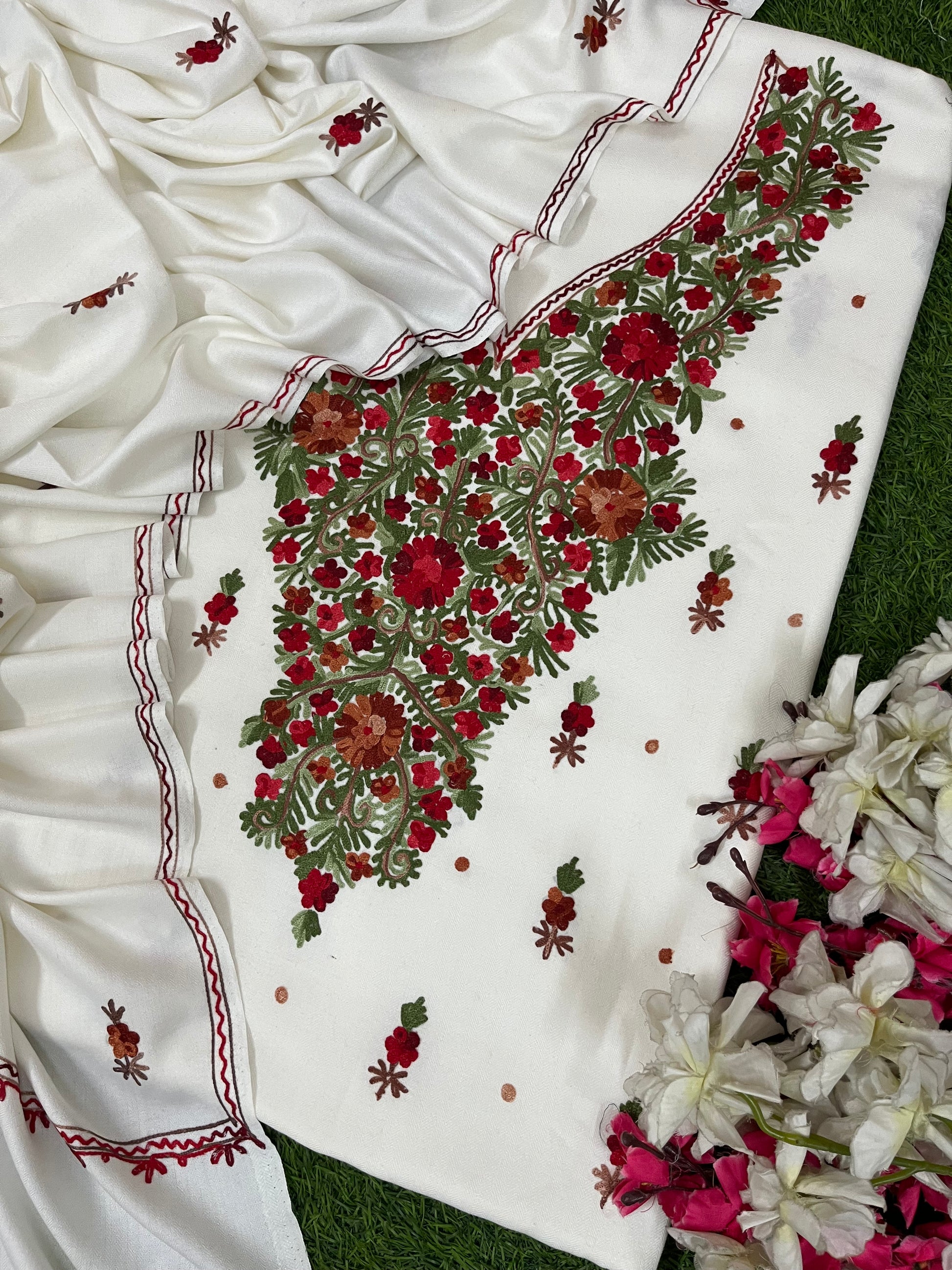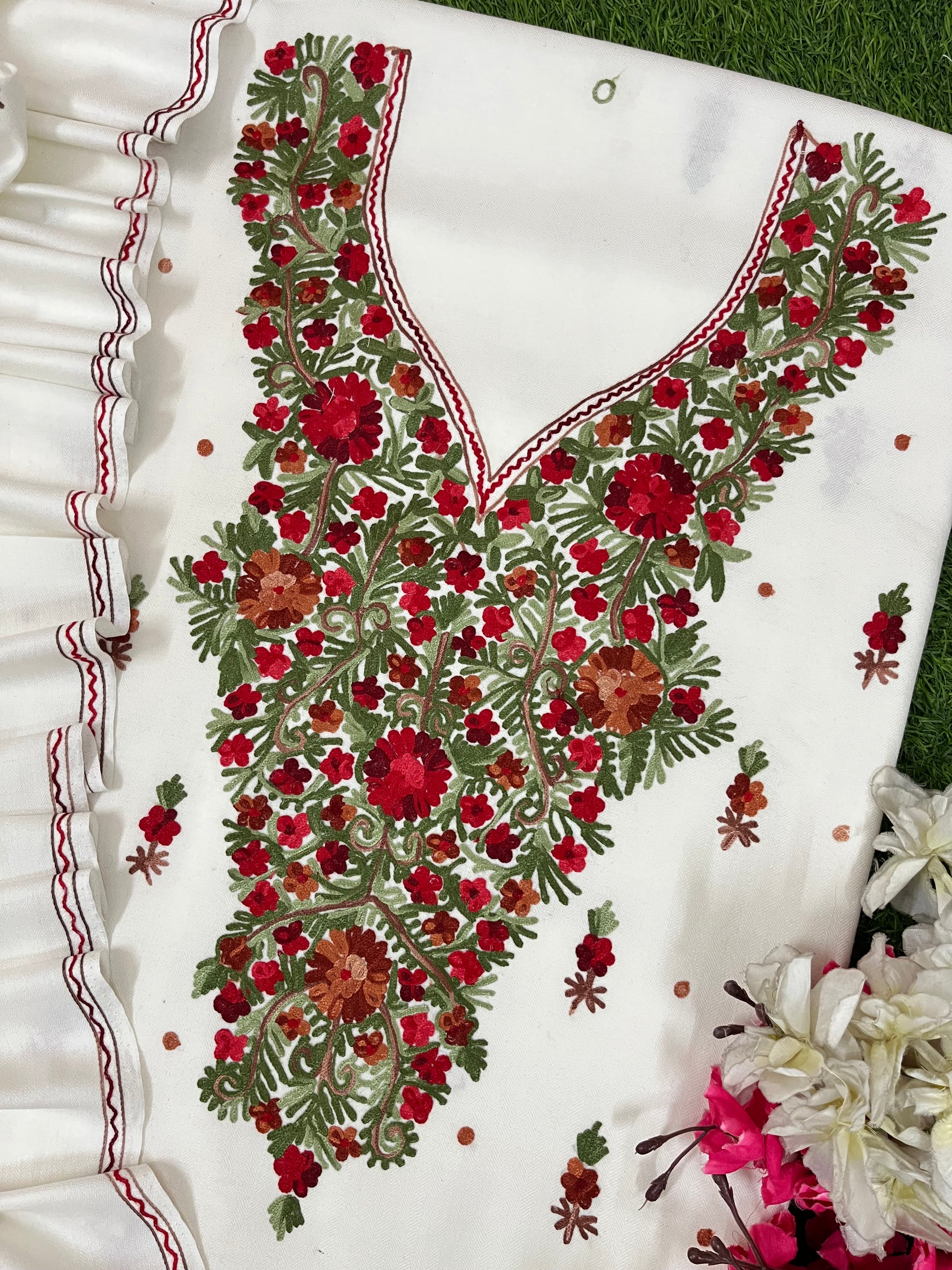 "Indulge in the timeless allure of Kashmiri embroidered spun suits, a harmonious blend of intricate craftsmanship and the comforting warmth of wool. Embrace tradition and elegance while cocooned in luxurious, handcrafted ensembles, perfect for chilly days."