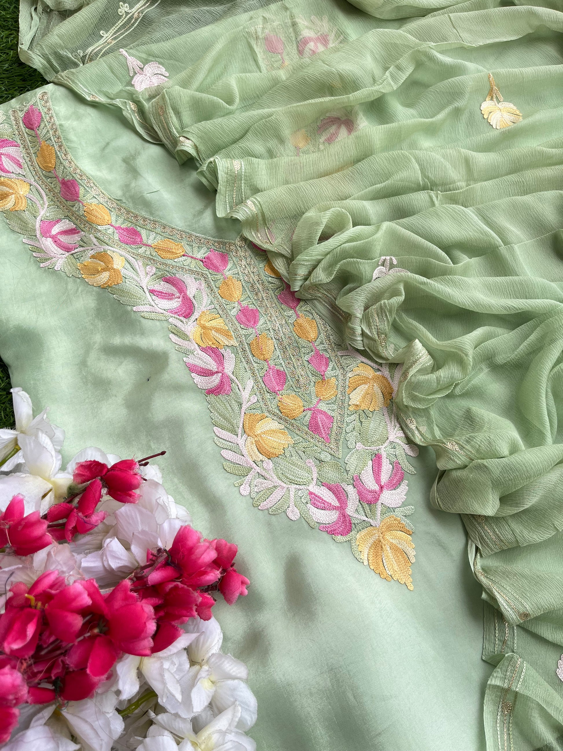 “Elegance meets tradition in this exquisite Kashmiri silk suit. Adorned with intricate embroidery, it exudes grace. Paired with a stunning heavy-embroidered dupatta, it’s a timeless ensemble of sophistication.”