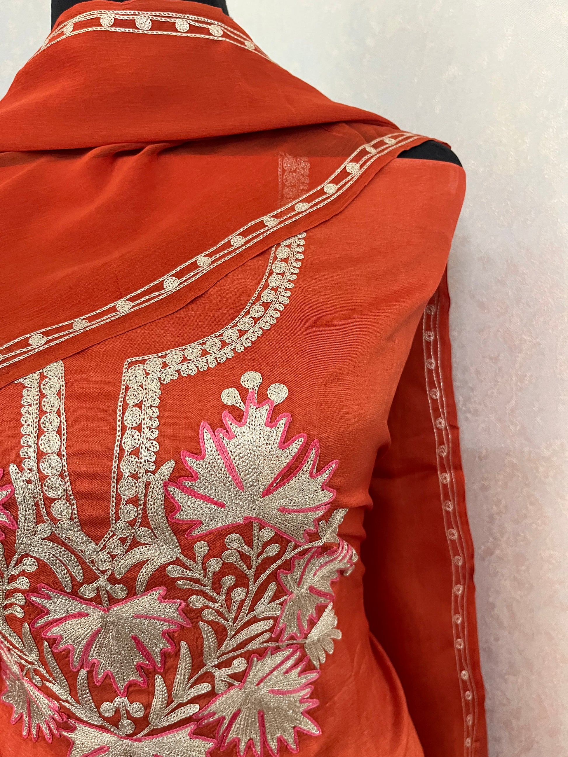 Indulge in the epitome of elegance with this luxury Kashmiri Tilla embroidered suit. Meticulously handcrafted with intricate details, this opulent ensemble exudes regality and showcases the rich cultural heritage of Kashmir.