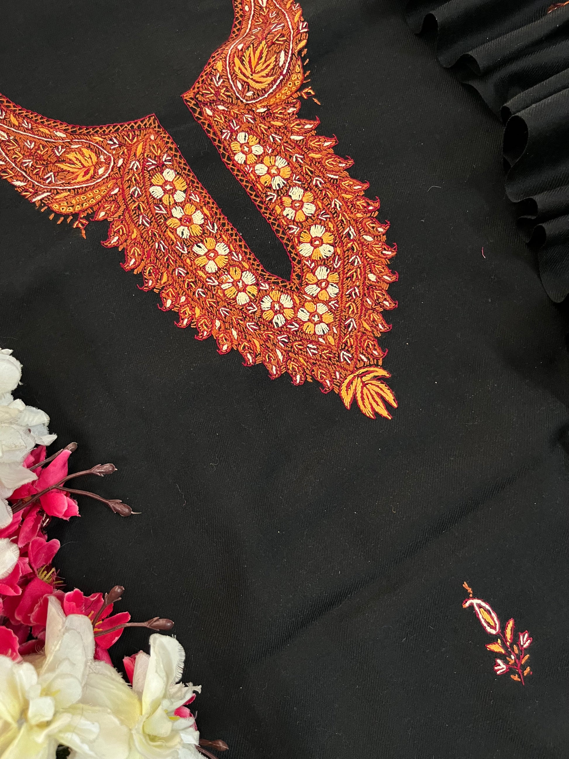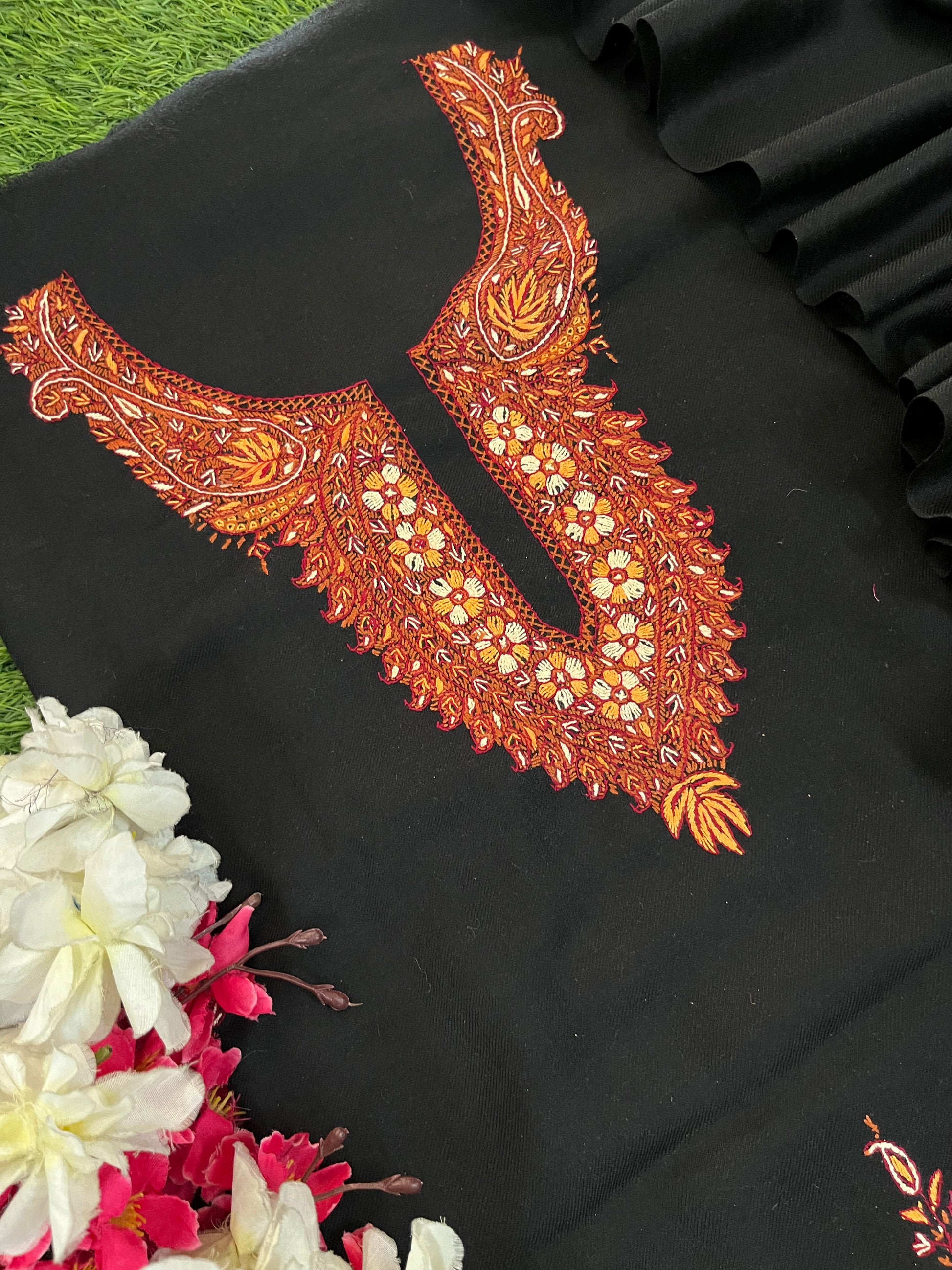 The embroidery features vibrant floral motifs, paisleys, and geometric designs, often highlighting cultural and natural elements of Kashmir. Each stitch is a labor of love, creating an exquisite texture and depth, making every suit a unique piece of wearable art. The embroidery’s fine, meticulous execution adds an element of luxury, elevating the woolen fabric into a symbol of elegance and heritage.
