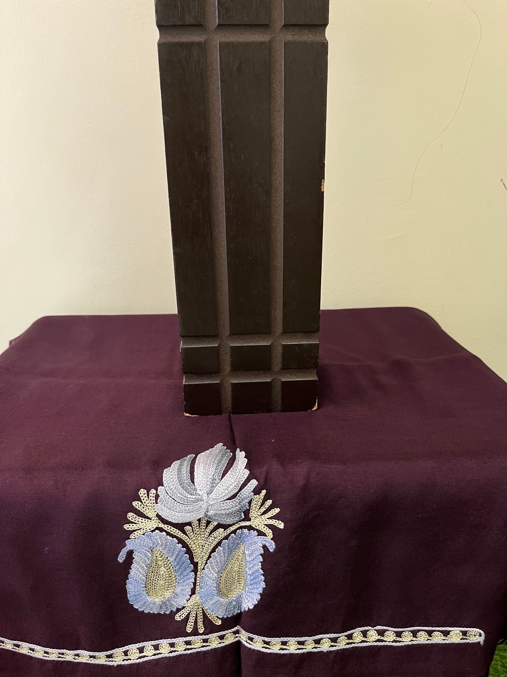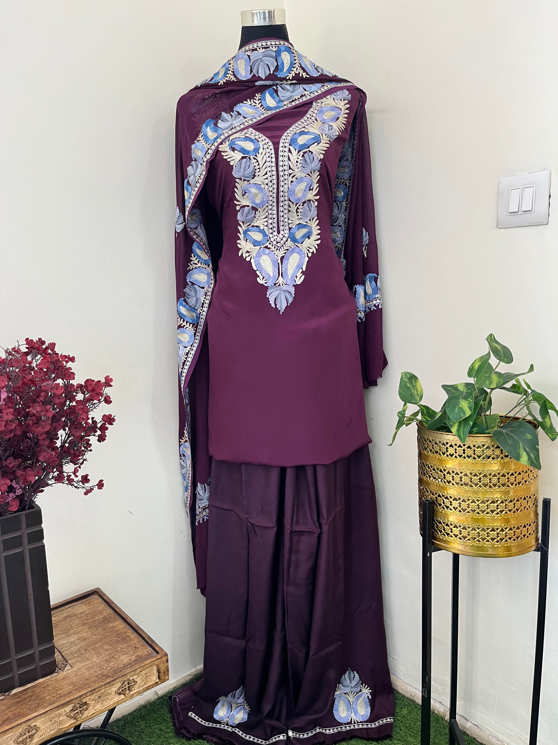 Elevate your style with this exquisite Kashmiri crape suit, adorned with intricate Aari tilla embroidery. Paired with a heavily embellished dupatta, this elegant ensemble beautifully blends traditional craftsmanship with timeless sophistication, perfect for festive and special occasions.