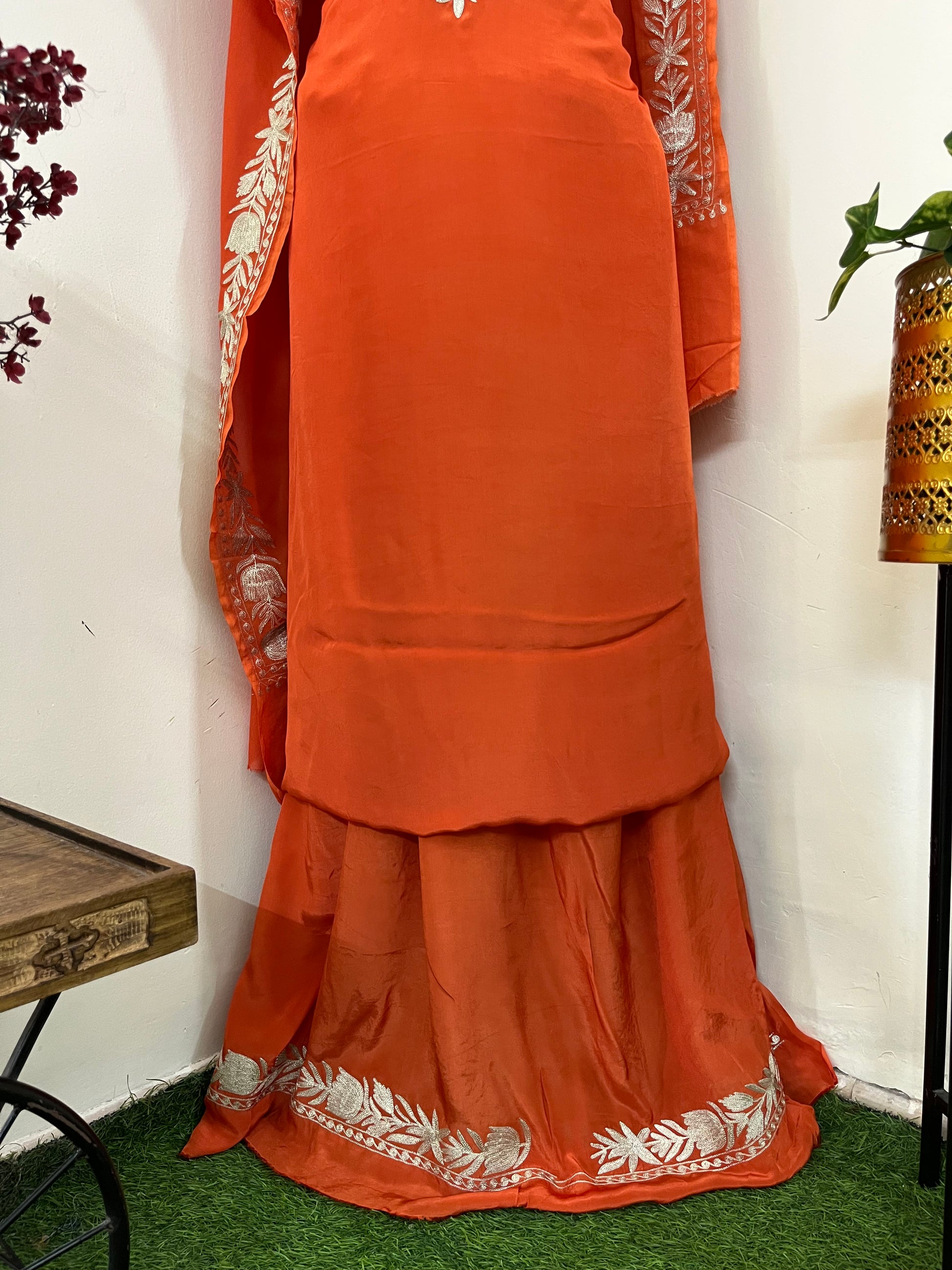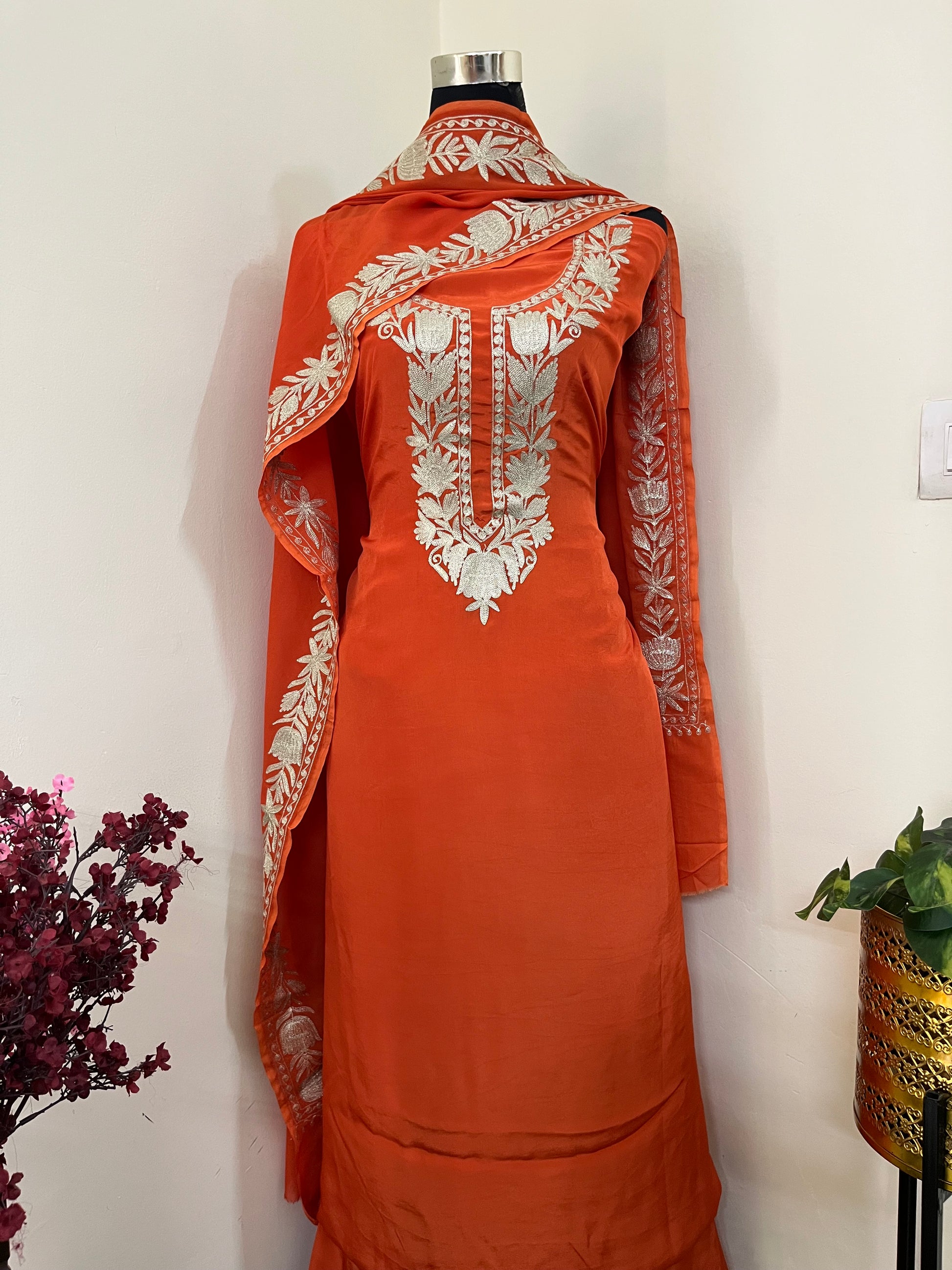 Elevate your style with this exquisite Kashmiri crape suit, adorned with intricate tilla and aari embroidery. Paired with a heavily embellished dupatta, this elegant ensemble beautifully blends traditional craftsmanship with timeless sophistication, perfect for festive and special occasions.
