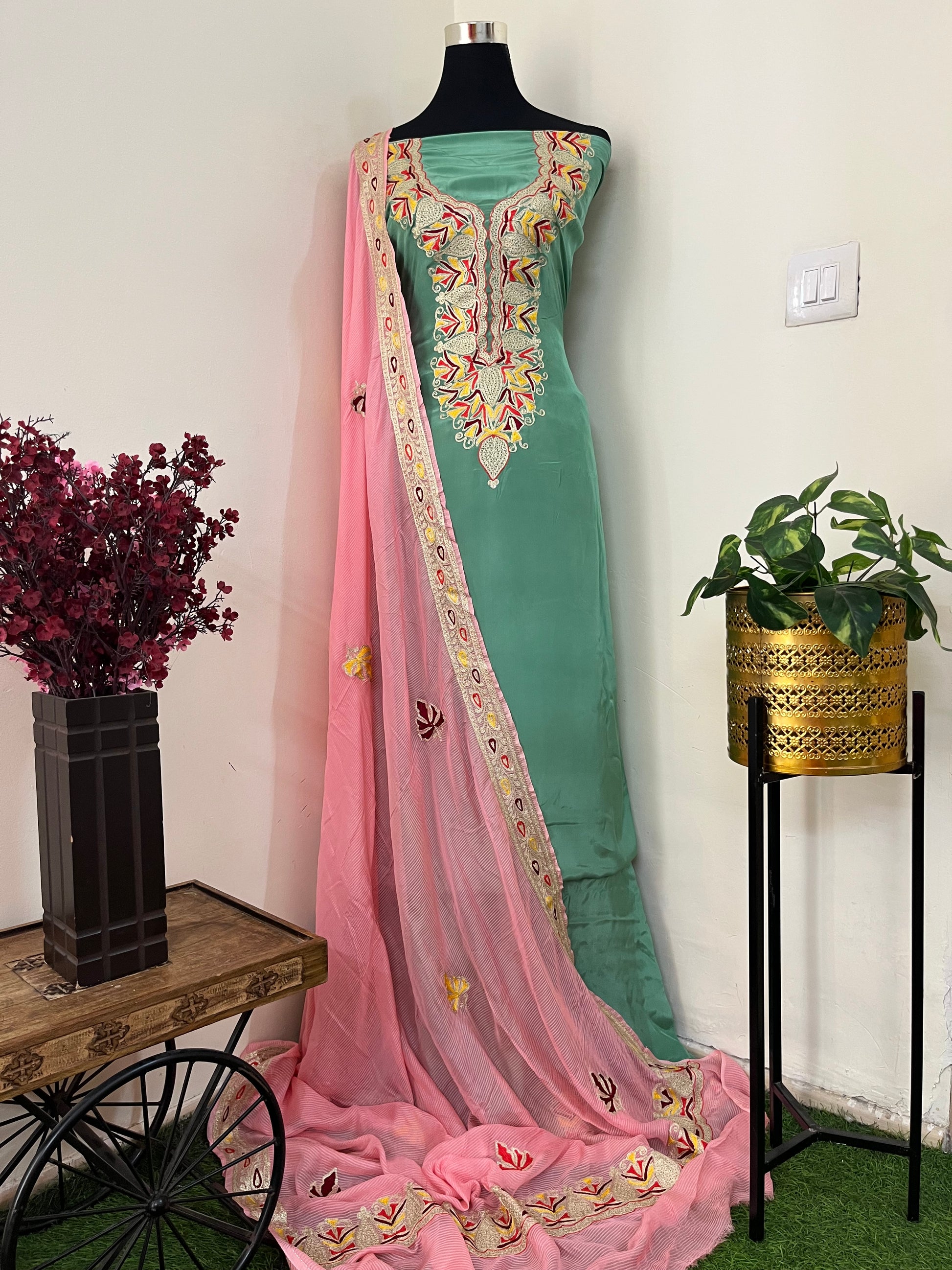 Elevate your style with this exquisite Kashmiri crape suit, adorned with intricate 3d Aari Tilla embroidery. Paired with a stunning Contrast-shade Tabee Silk Dupatta this elegant ensemble beautifully blends traditional craftsmanship with timeless sophistication, perfect for festive and special occasions.
