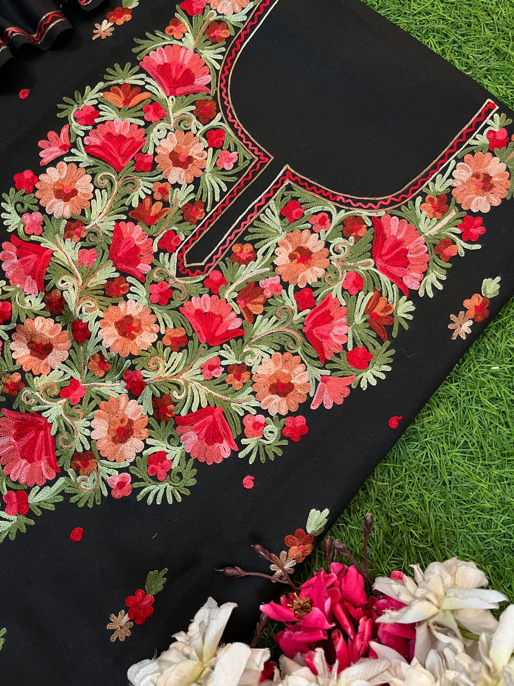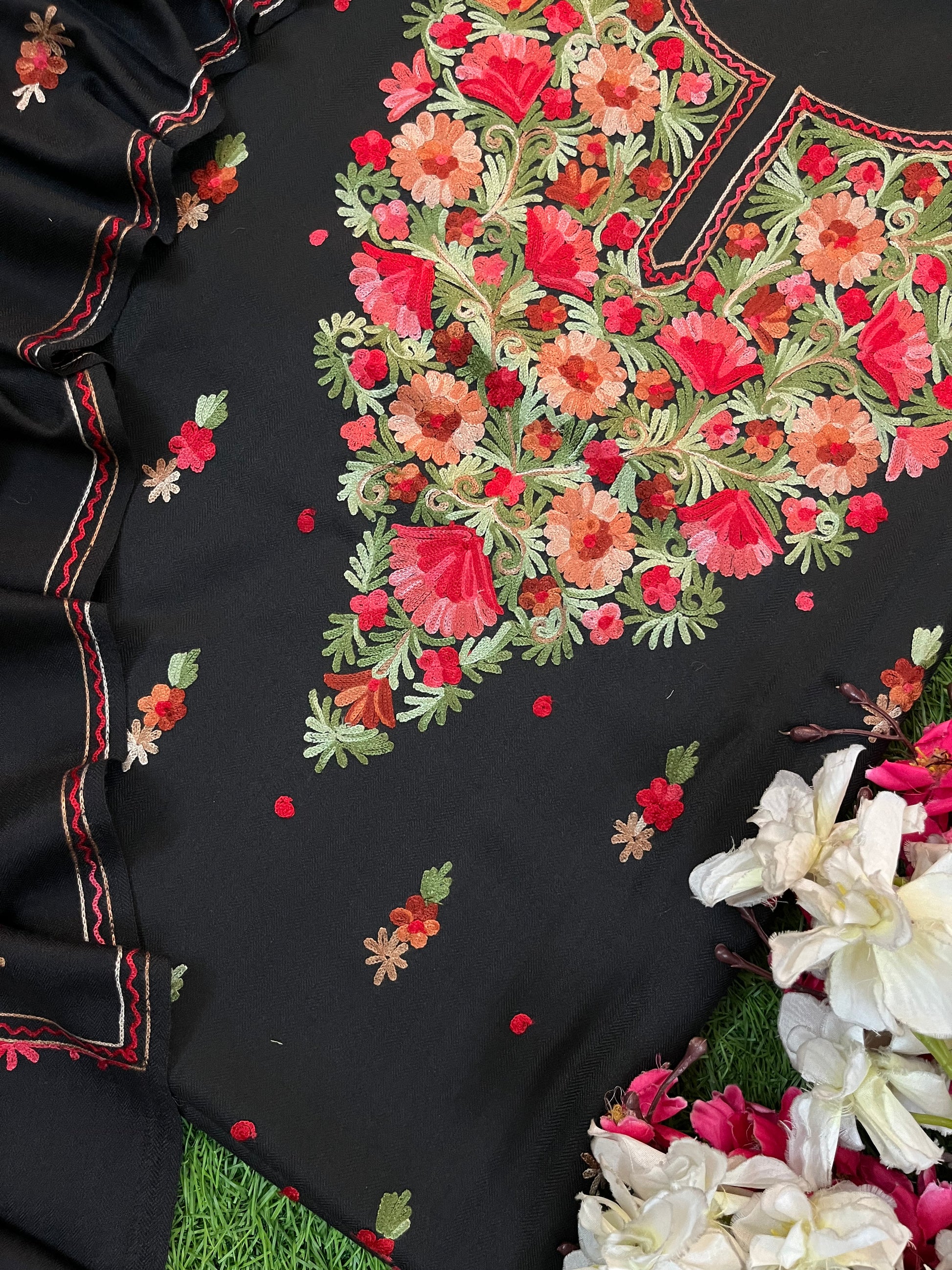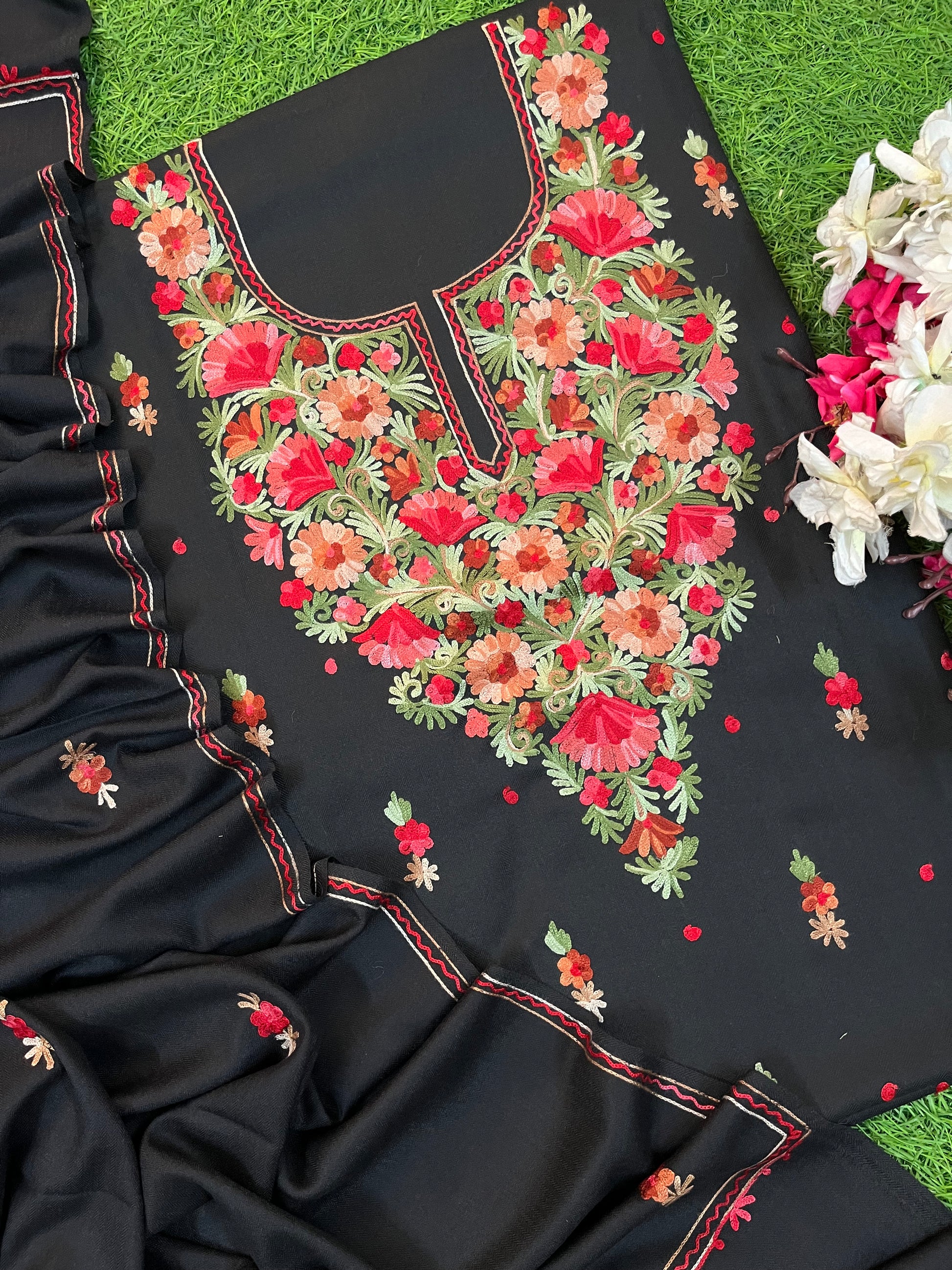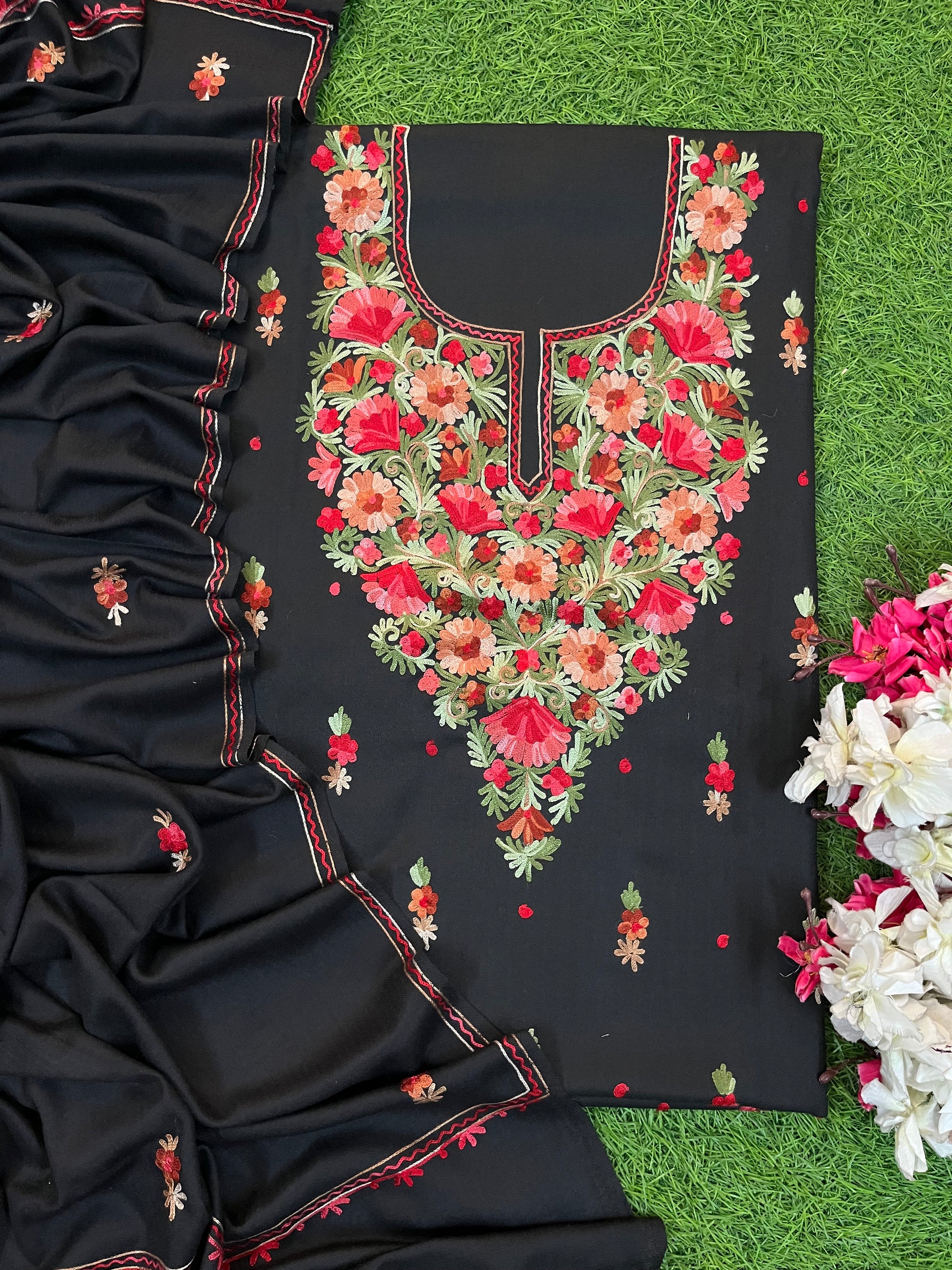 "Indulge in the timeless allure of Kashmiri embroidered spun suits, a harmonious blend of intricate craftsmanship and the comforting warmth of wool. Embrace tradition and elegance while cocooned in luxurious, handcrafted ensembles, perfect for chilly days."