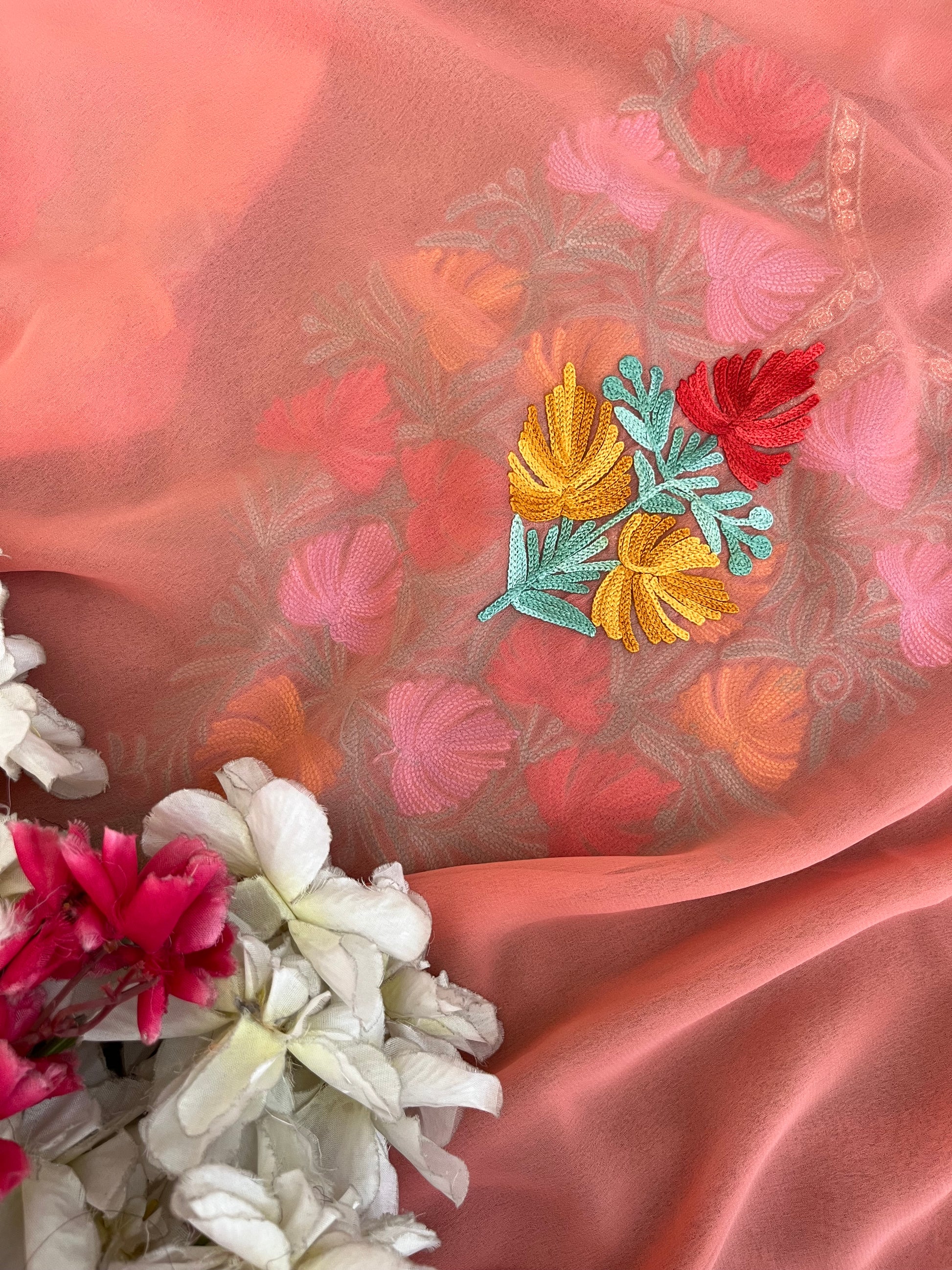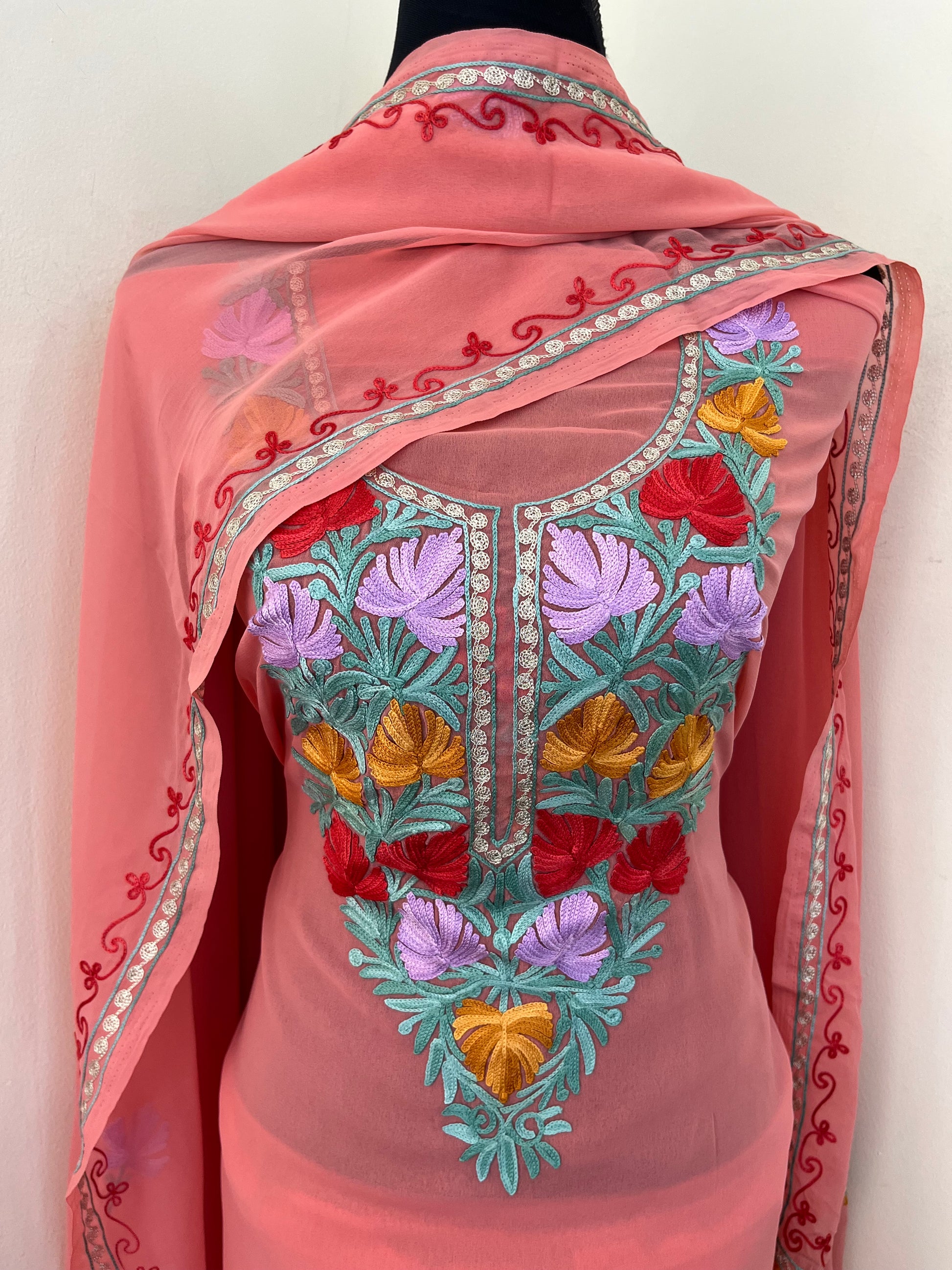 Pink Georgette 3 Pc Aari Embroidered Suit Set