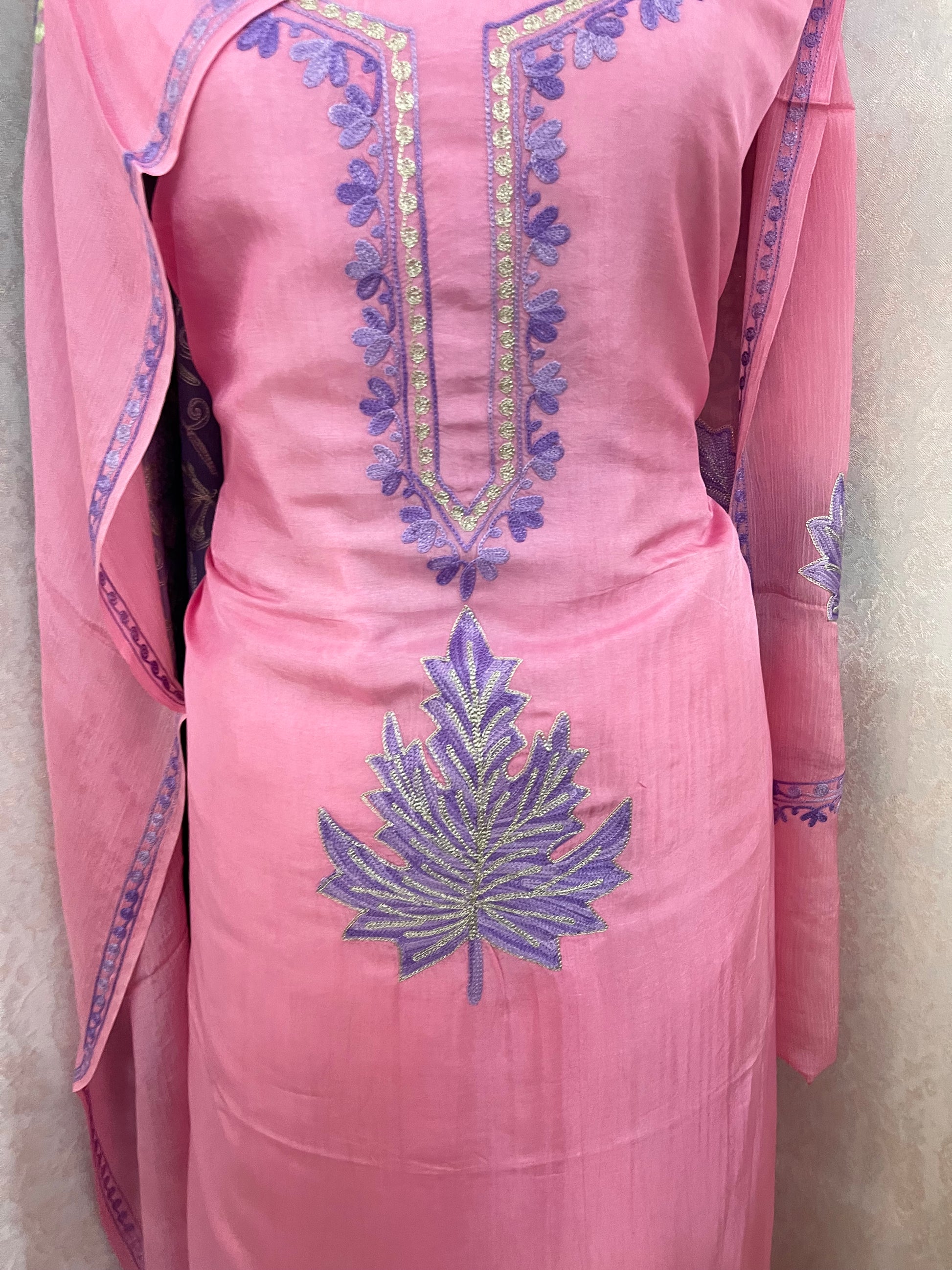 Elevate your style with this pure and traditional Kashmiri suit featuring intricate Aari and Tilla fusion embroidery. Crafted in premium opada silk fabric, it comes with a pure chiffon dupatta and matching cotton silk bottom. The dupatta boasts a beautifully detailed border, adding grace and richness to the overall ensemble.