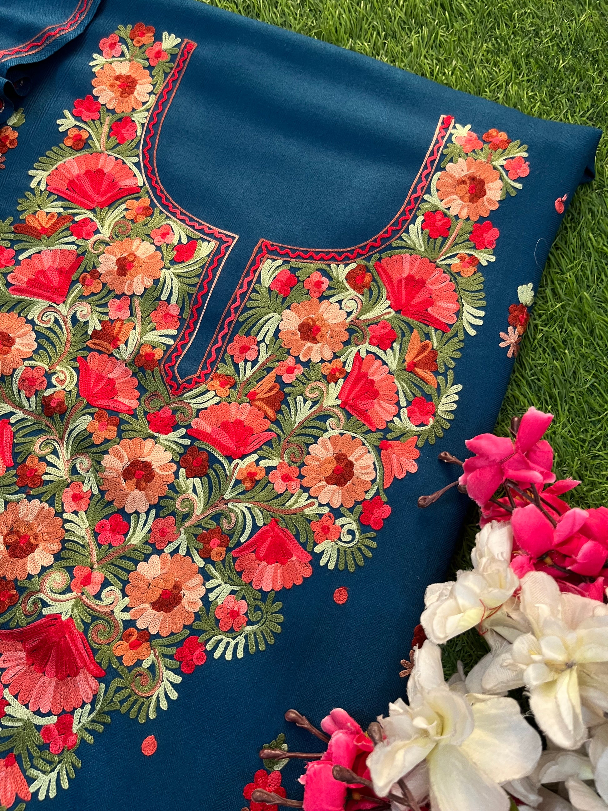 Peacock Blue Woollen Aari Embroidered 3pc suit