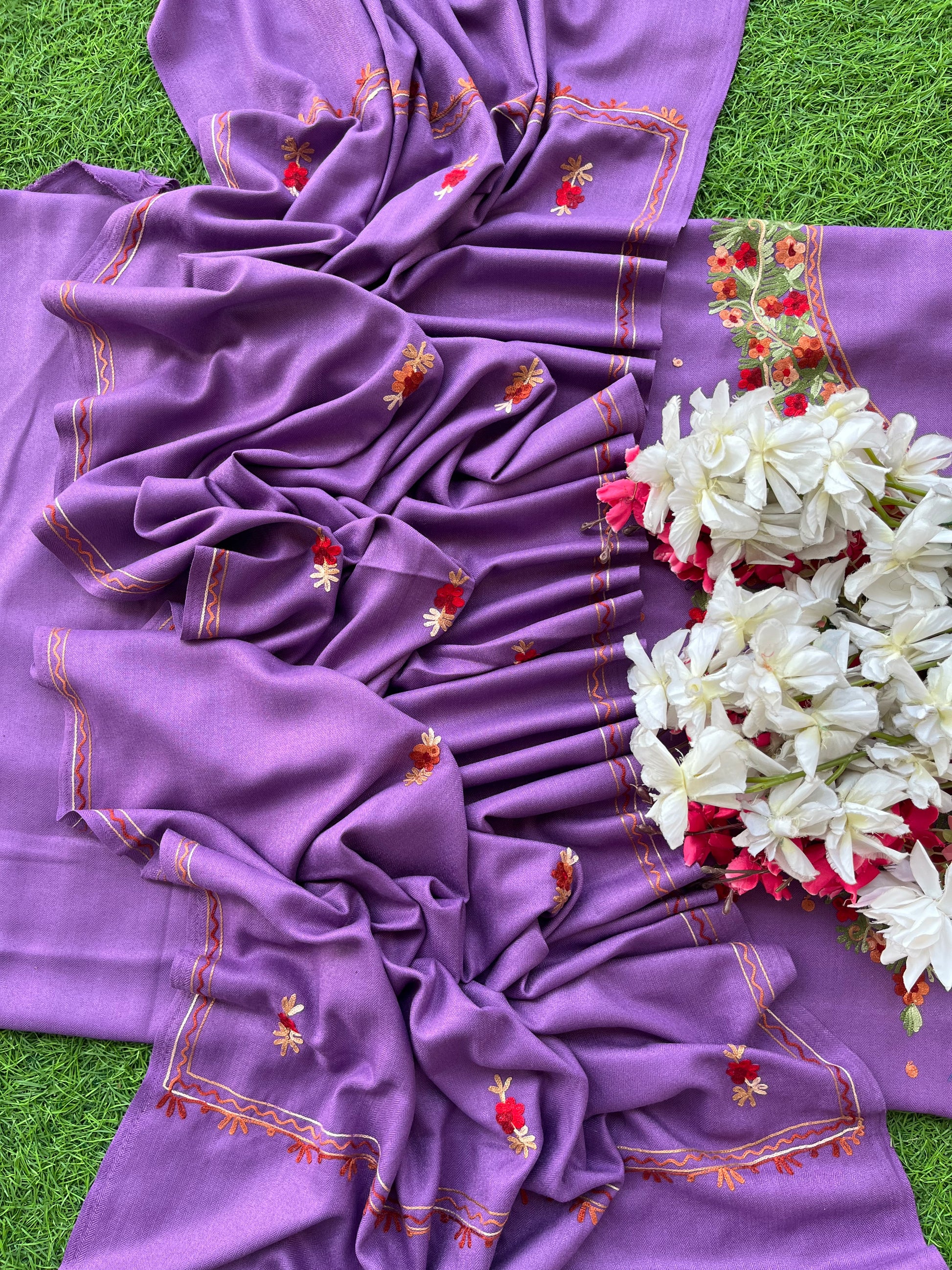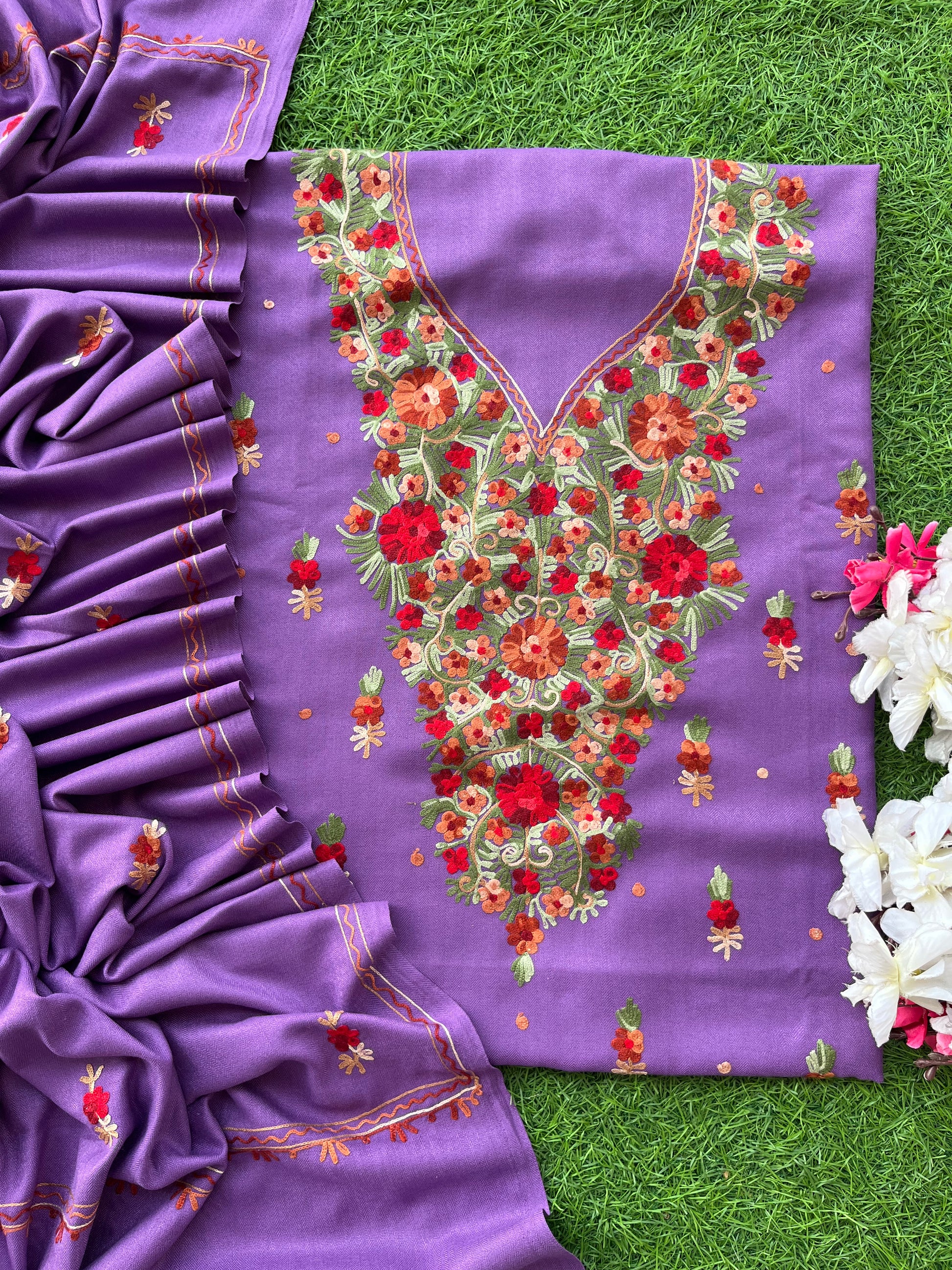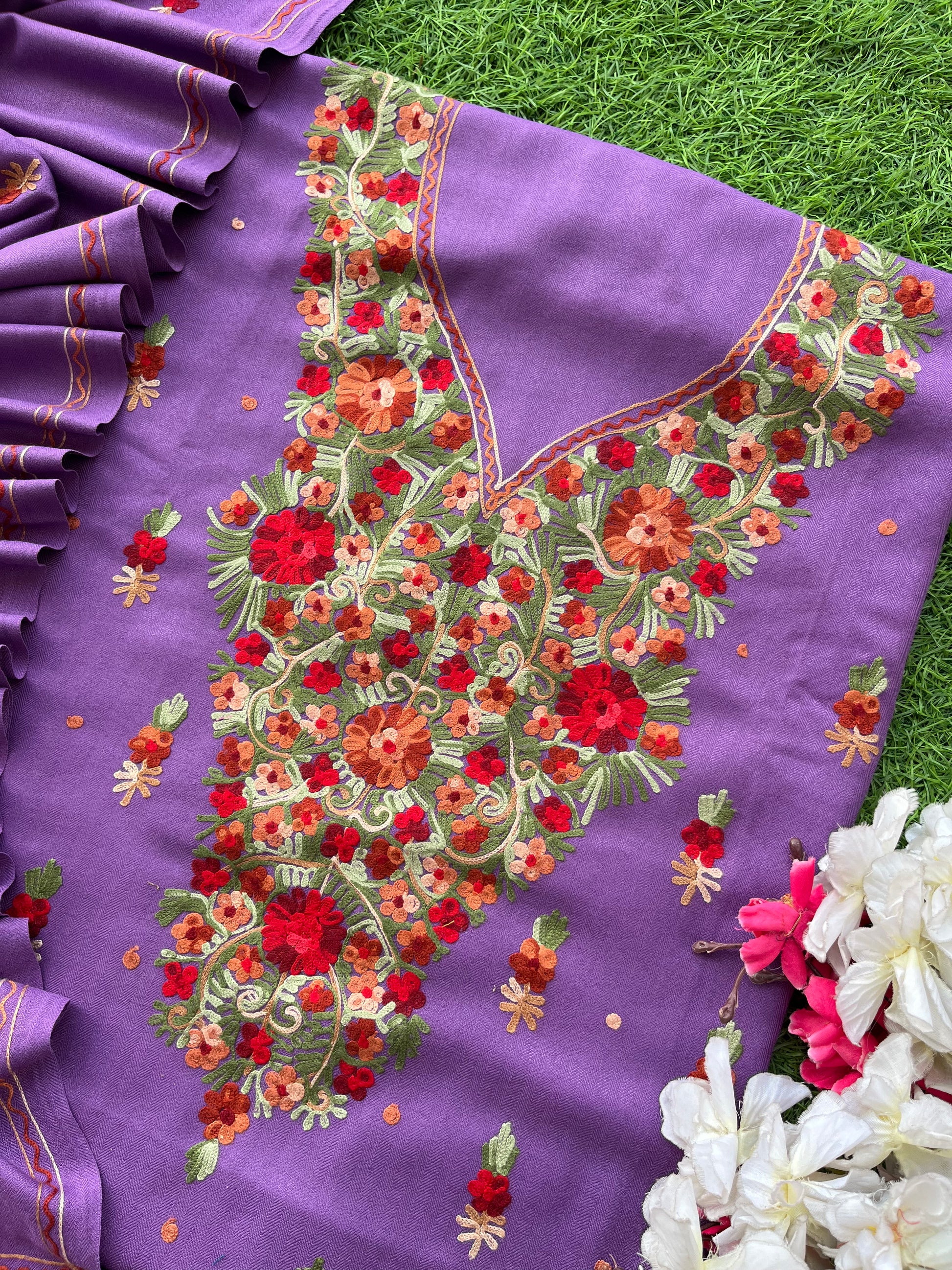 "Indulge in the timeless allure of Kashmiri embroidered spun suits, a harmonious blend of intricate craftsmanship and the comforting warmth of wool. Embrace tradition and elegance while cocooned in luxurious, handcrafted ensembles, perfect for chilly days."