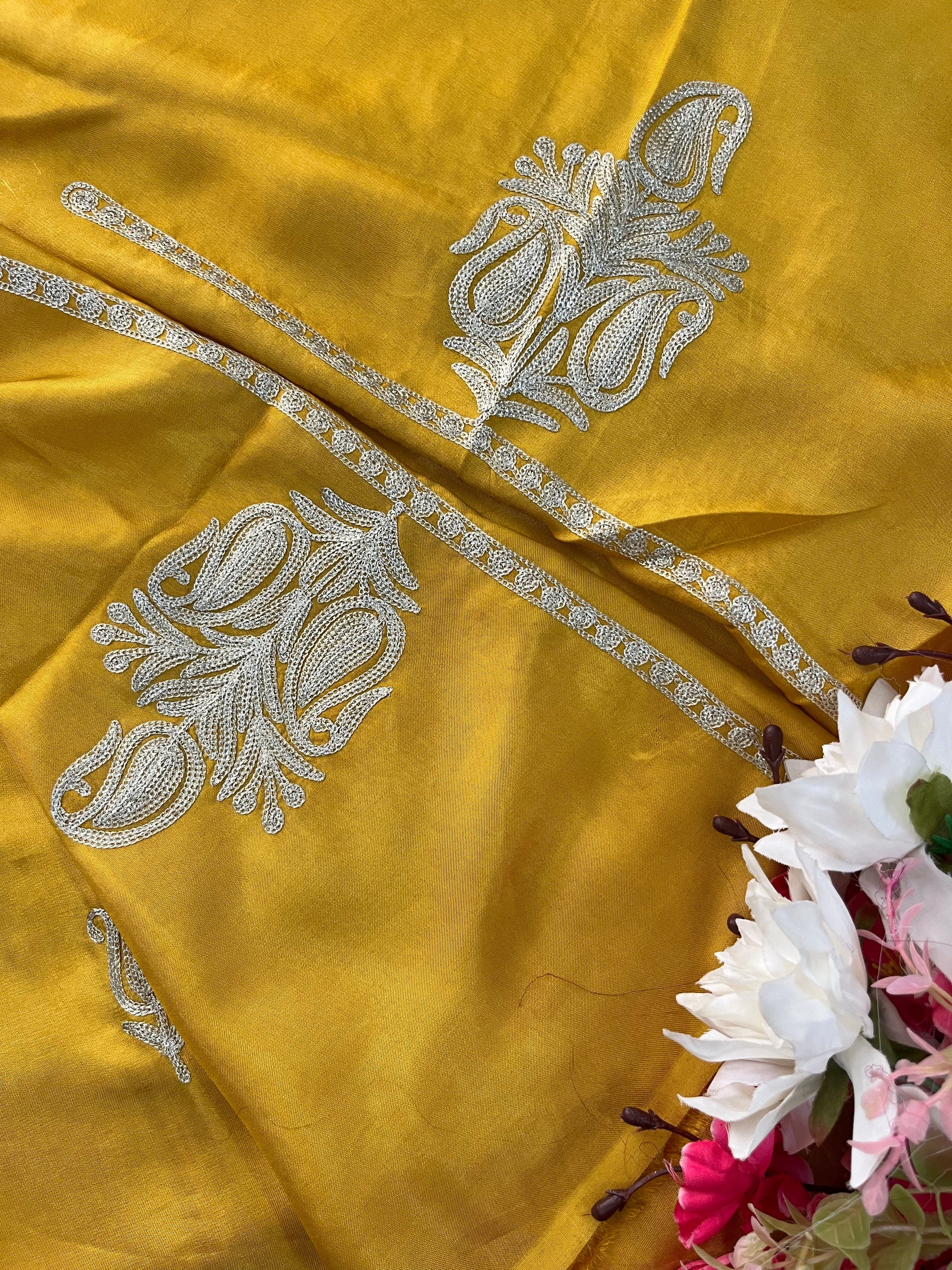 Experience the exquisite artistry of Kashmiri tilla embroidery .Each stitch tells a tale of craftsmanship, tradition, and intricate beauty. Elevate your wardrobe with this timeless treasure.