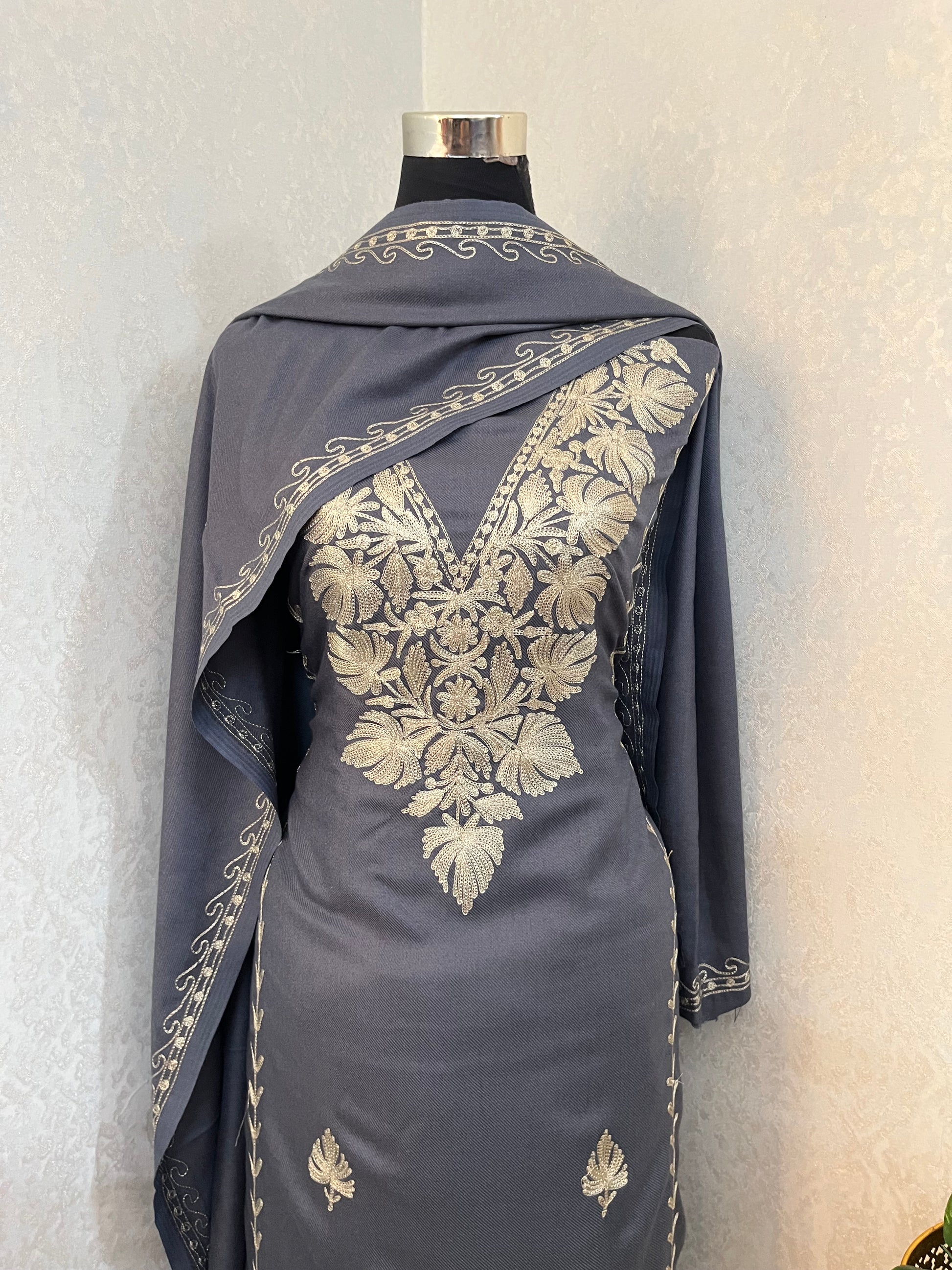 Be winter ready this season with these warm woollen three piece sets in contrasting colors and complementing embroidery !