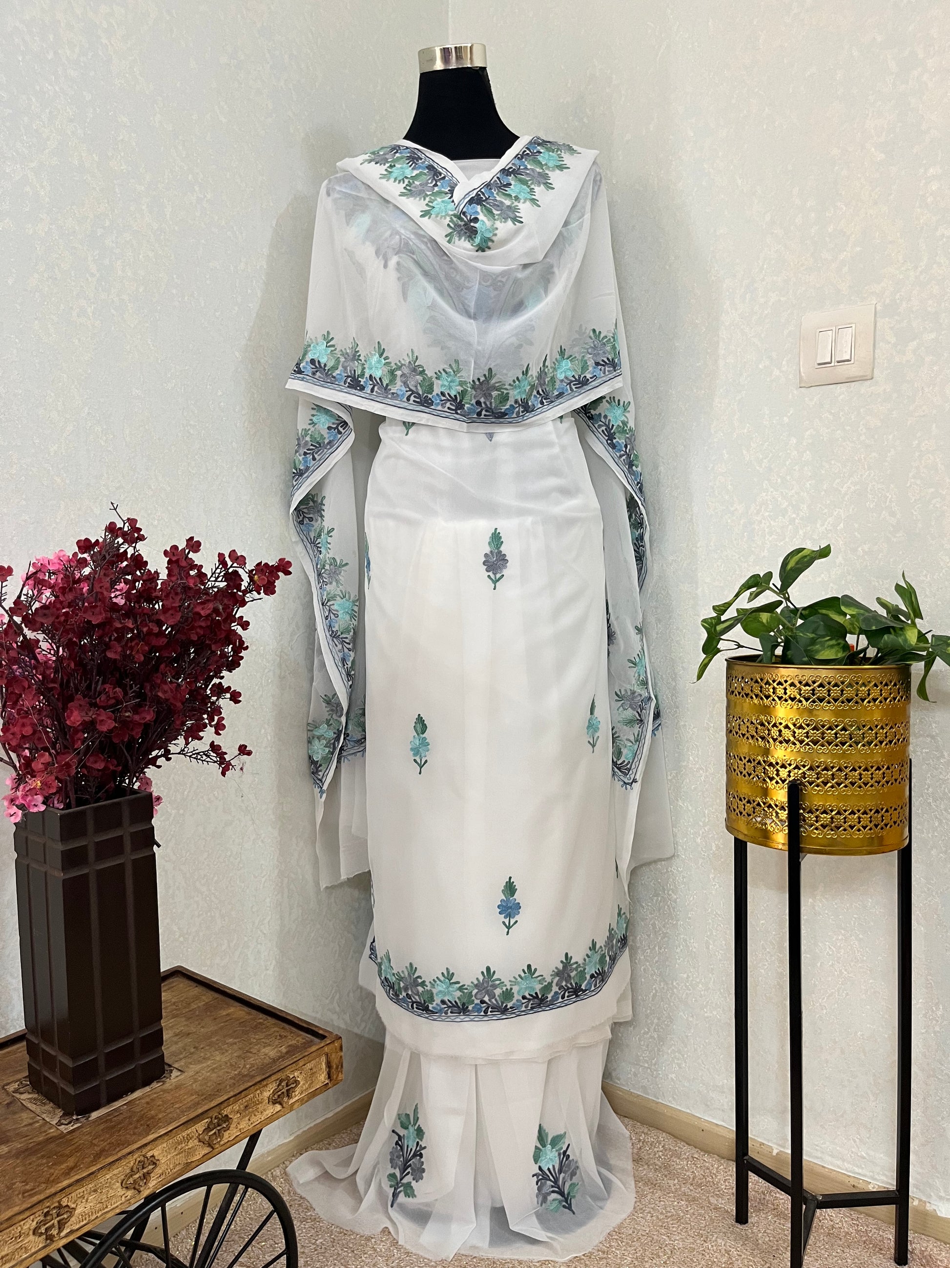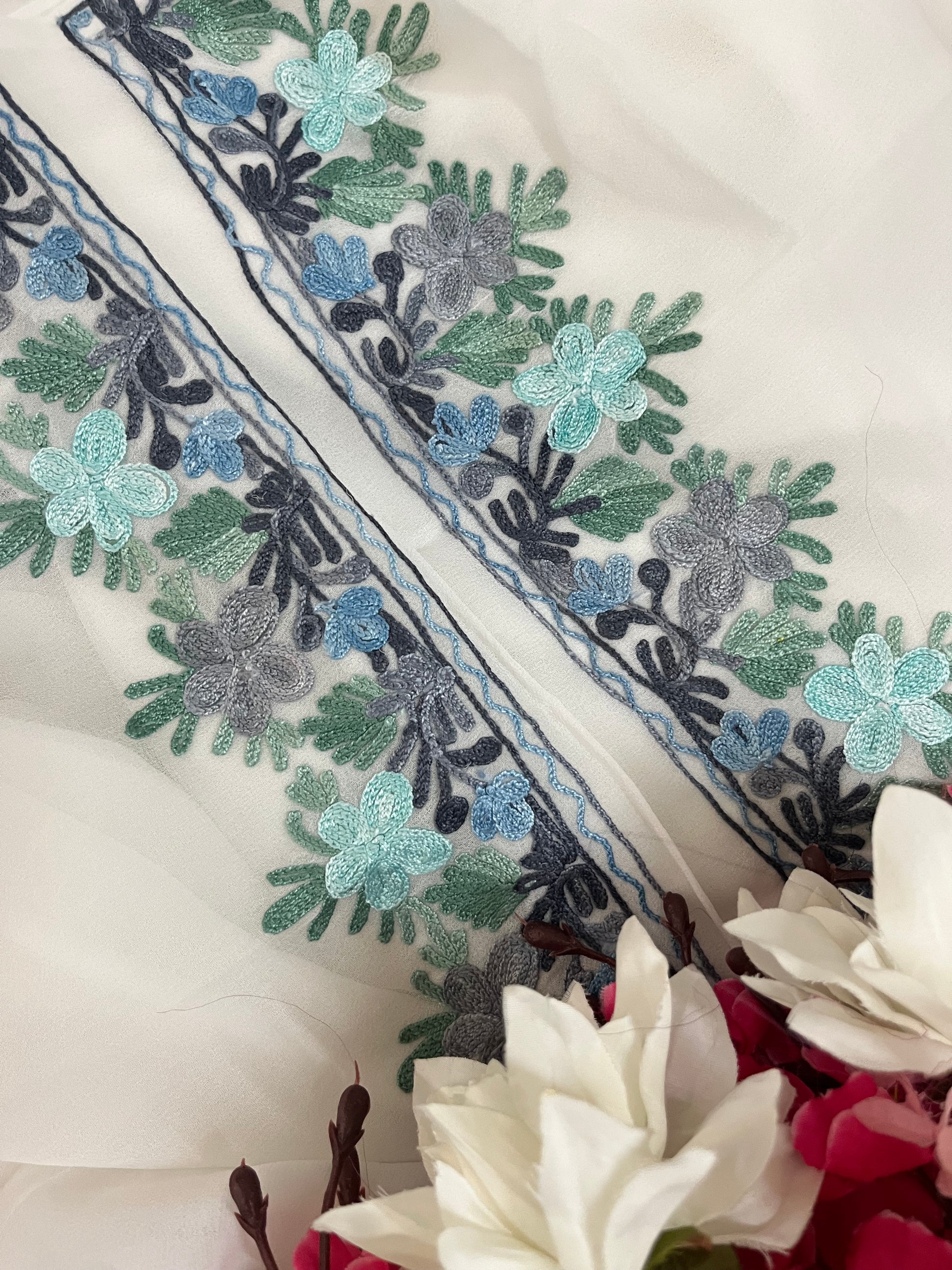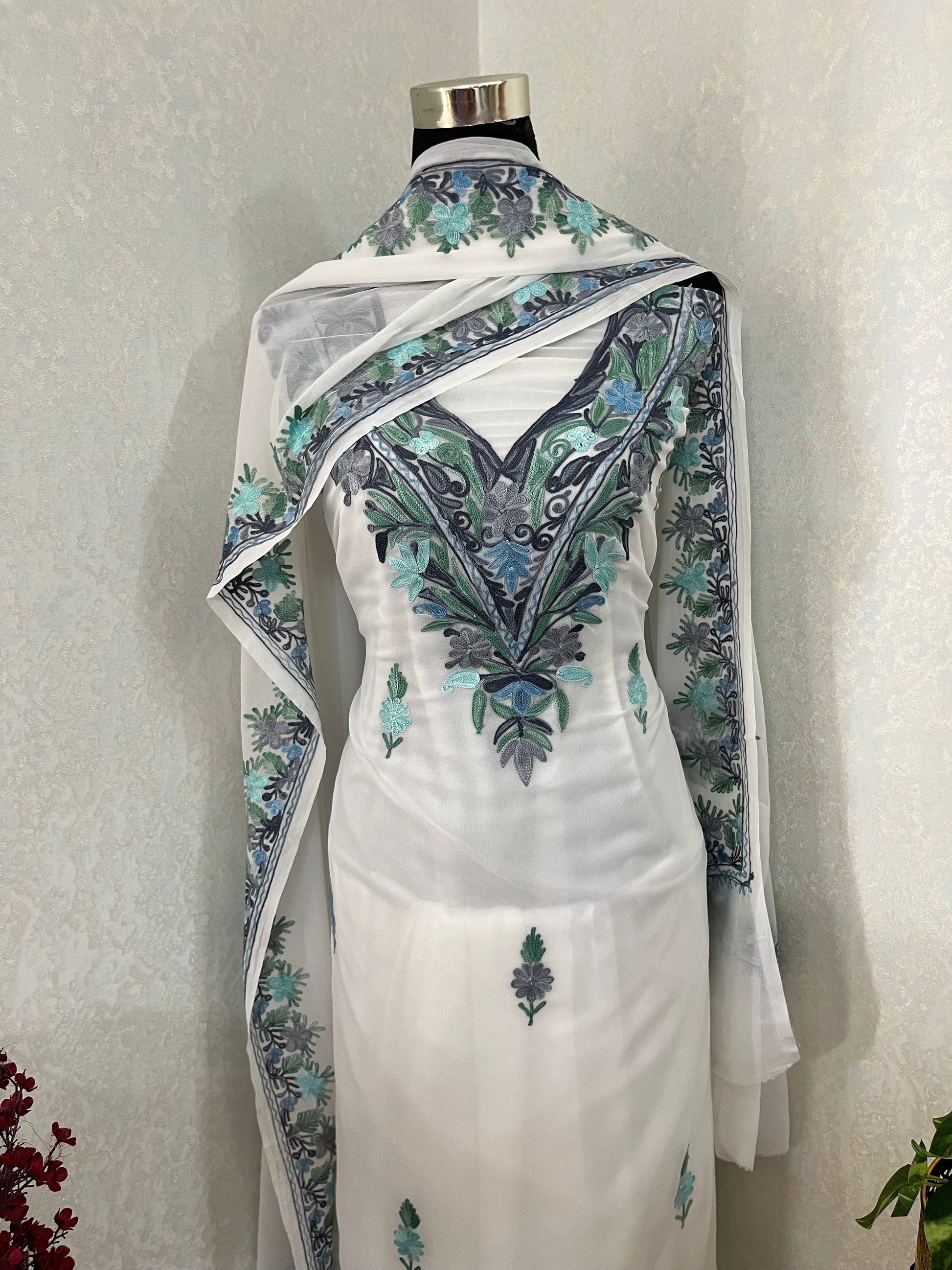 Off white Georgette 3pc Kashmiri Suit