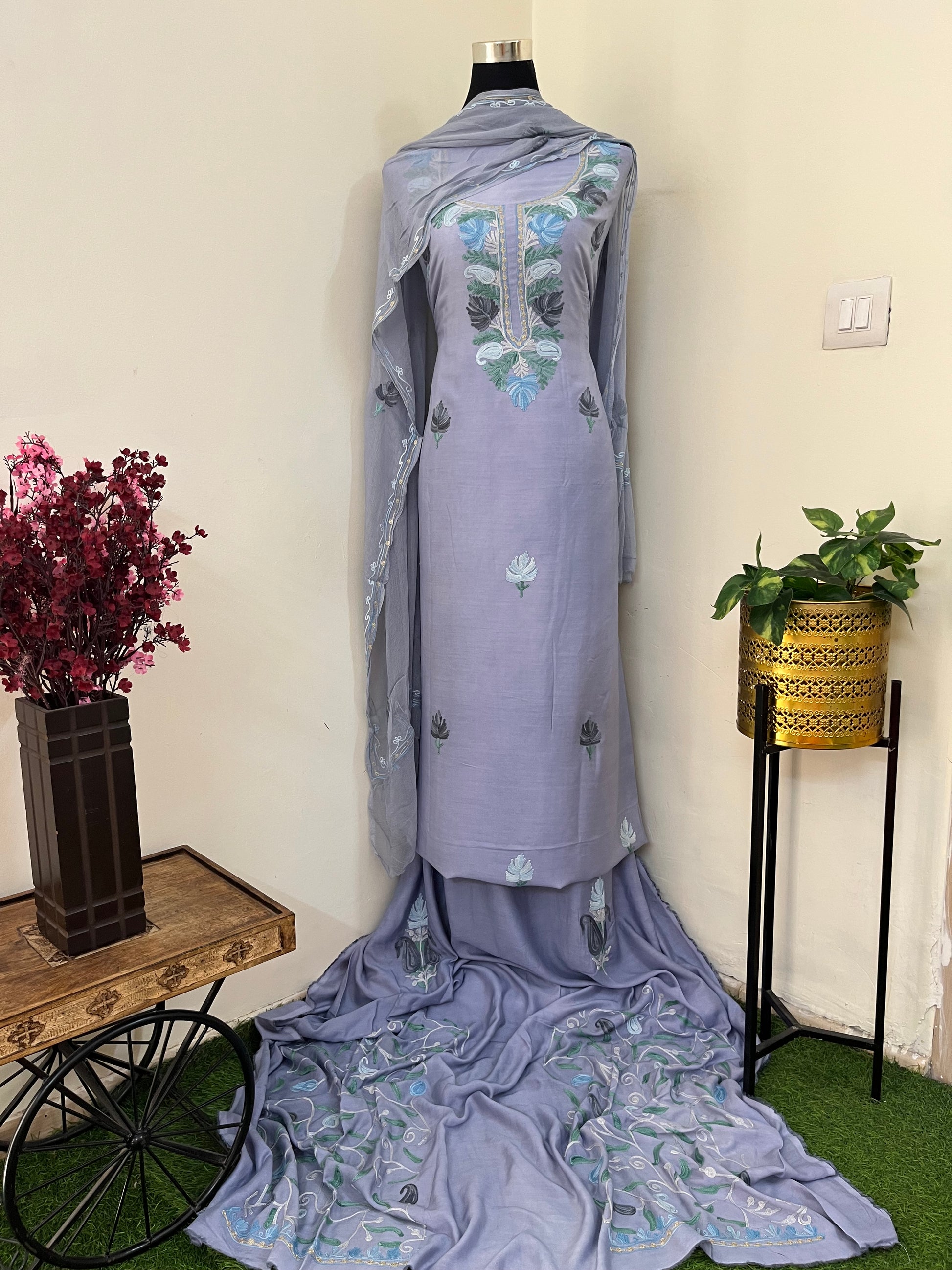 English Grey Muslin Cotton Jaal Sleeves Kashmiri 3pc Suit