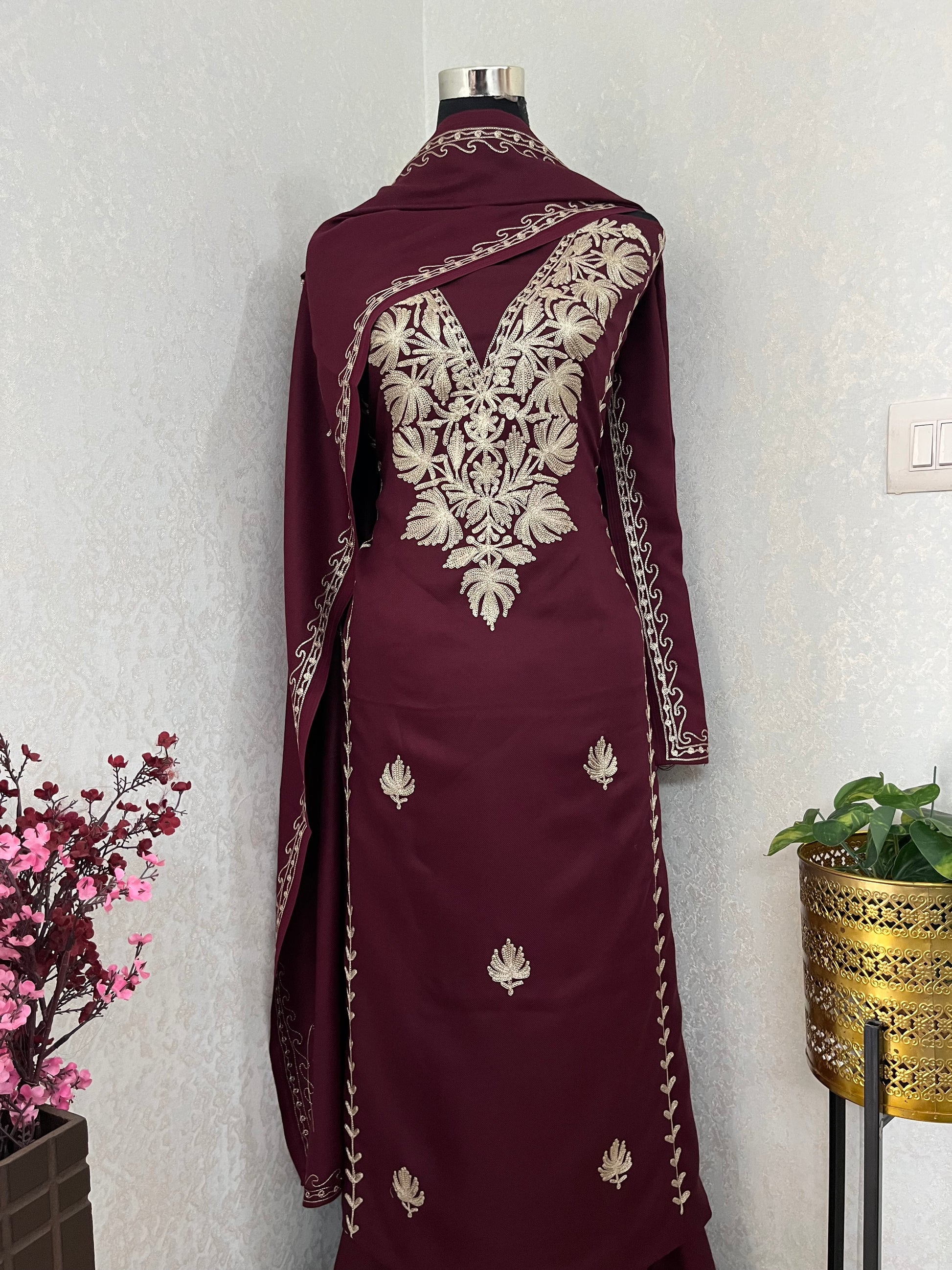 Be winter ready this season with these warm woollen three piece sets in contrasting colors and complementing embroidery !