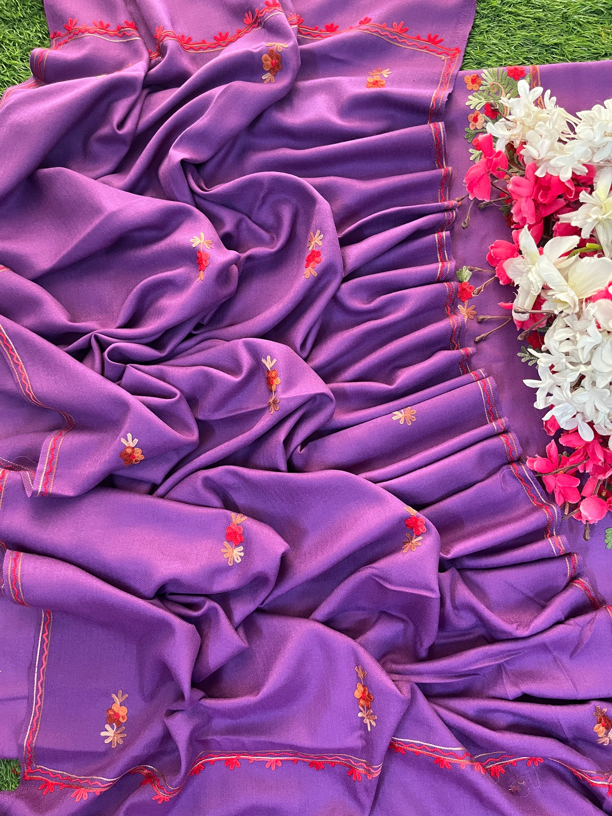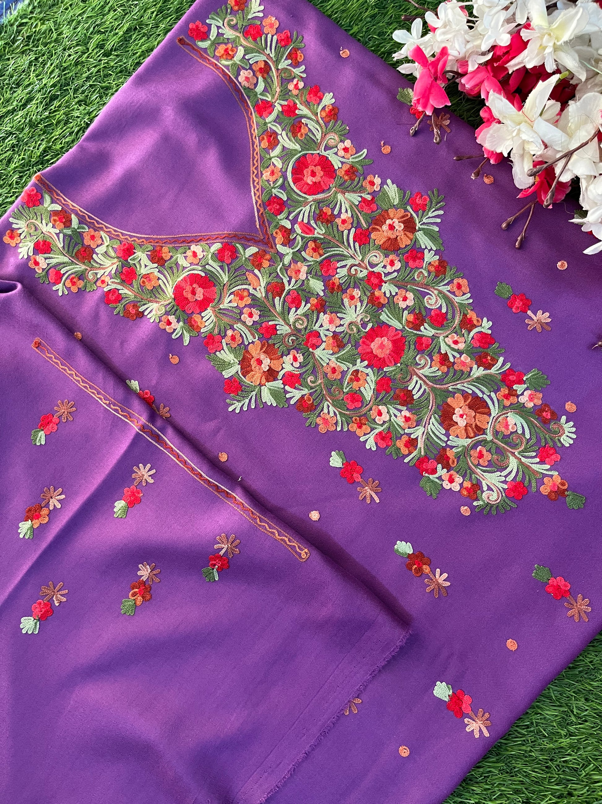 "Indulge in the timeless allure of Kashmiri embroidered spun suits, a harmonious blend of intricate craftsmanship and the comforting warmth of wool. Embrace tradition and elegance while cocooned in luxurious, handcrafted ensembles, perfect for chilly days."