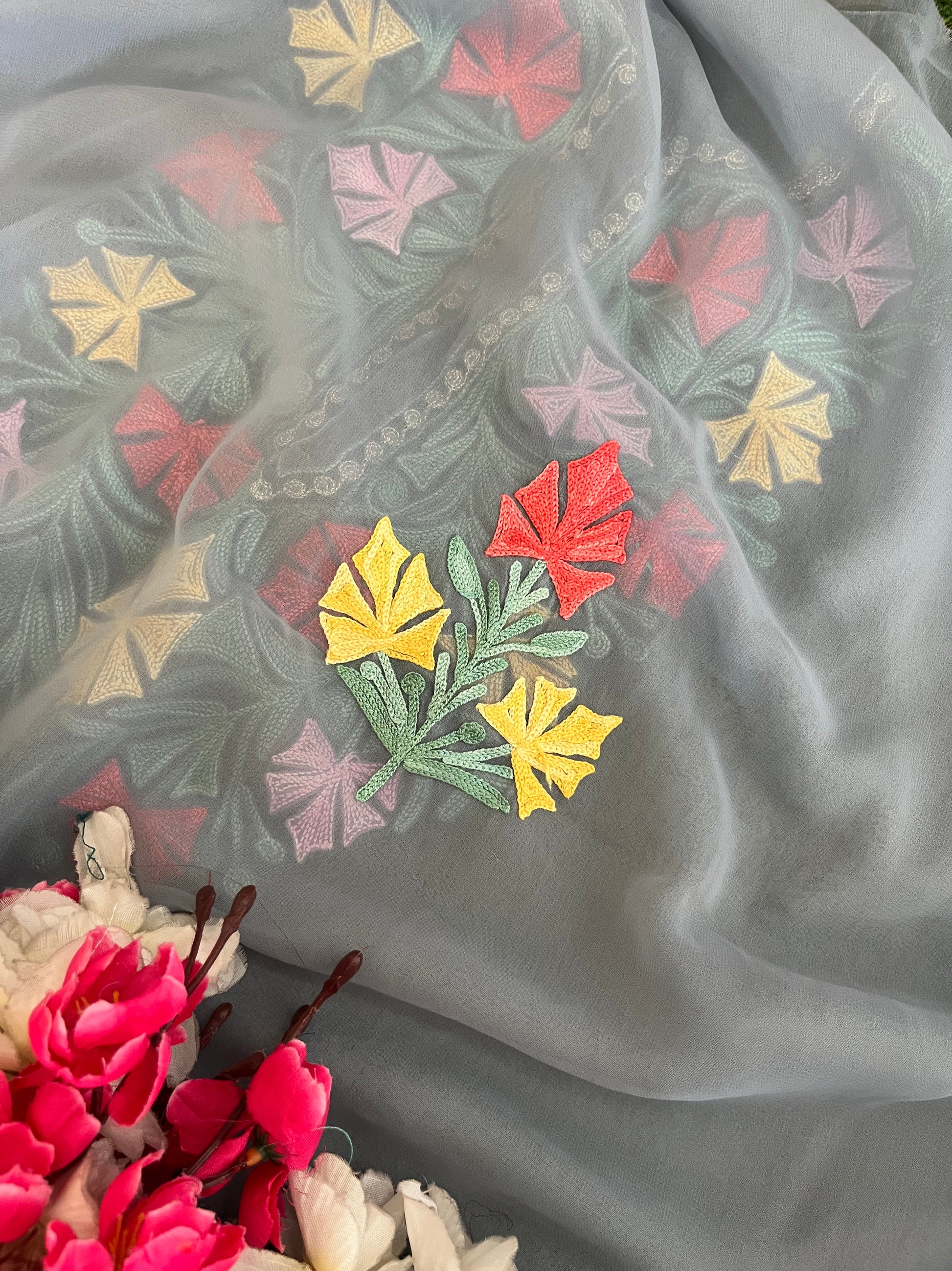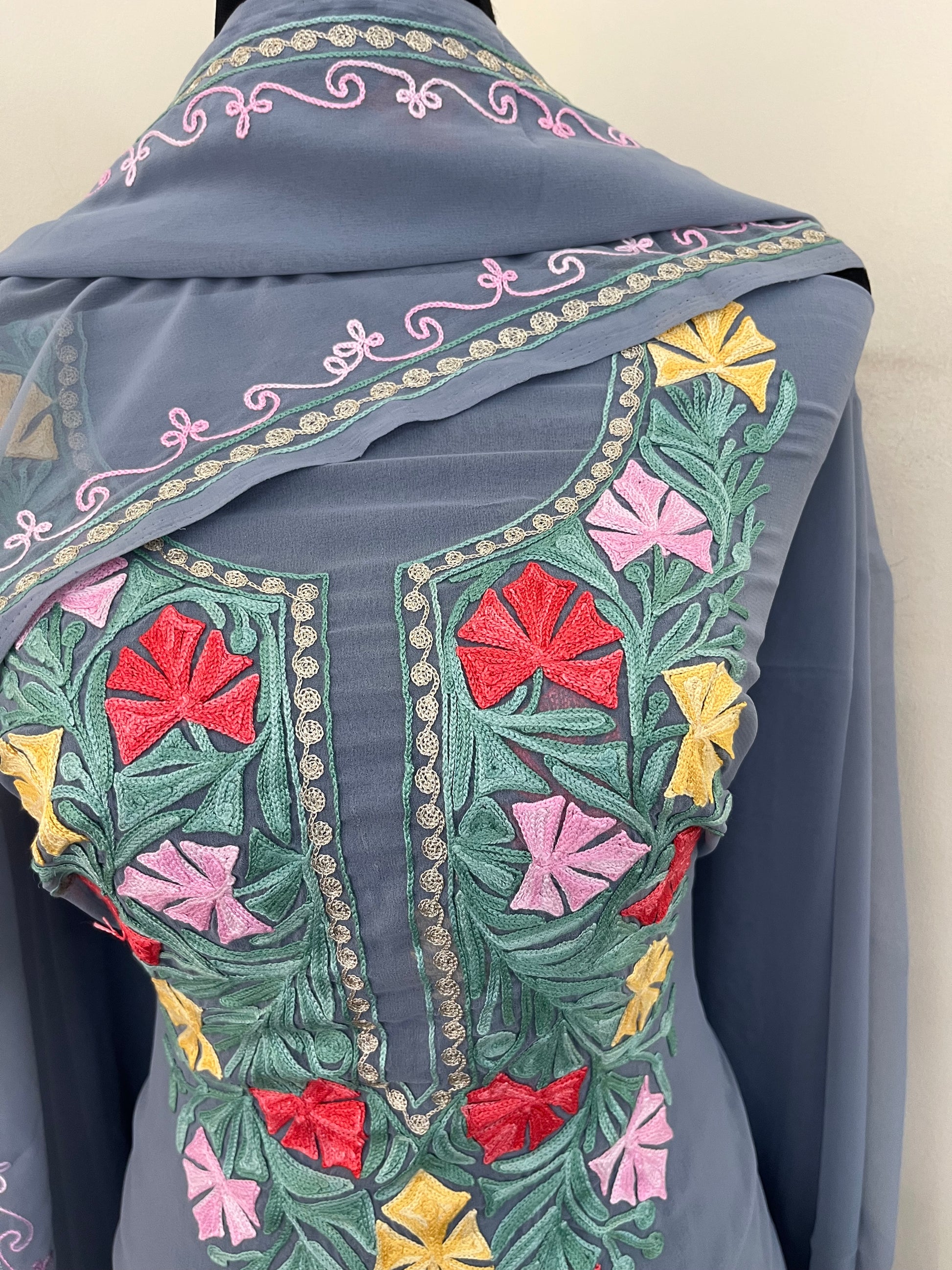 Steel Grey Georgette 3 Pc Aari Embroidered Suit Set