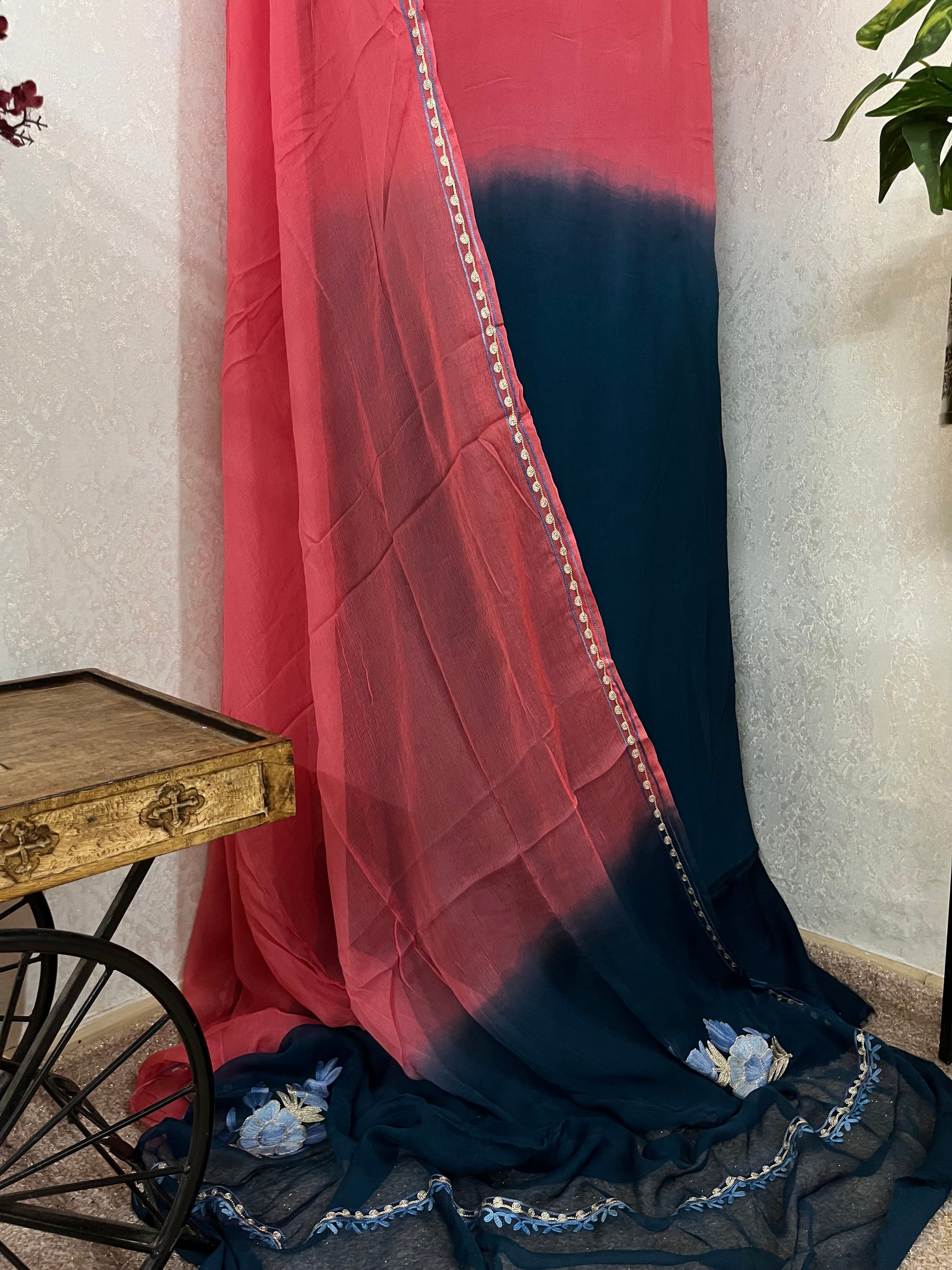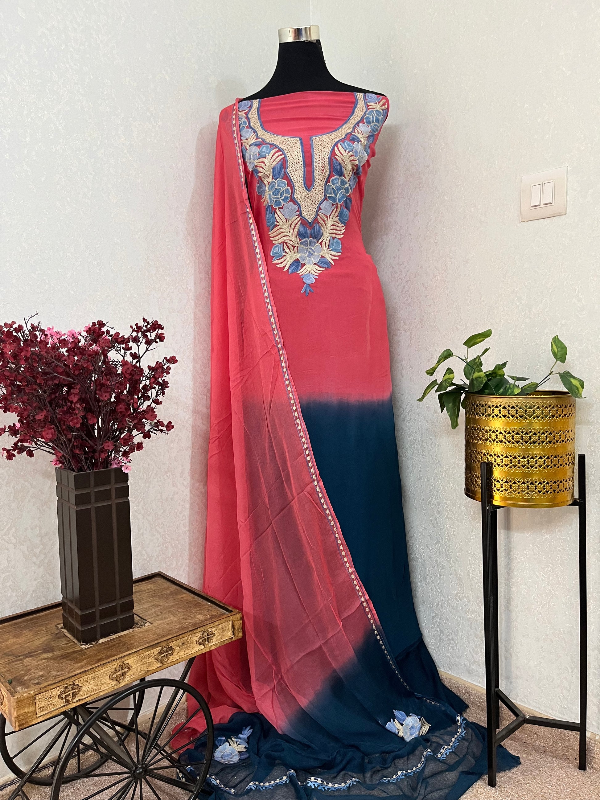 Carrot Pink Pure Georgette Double Shade Kashmiri Suit