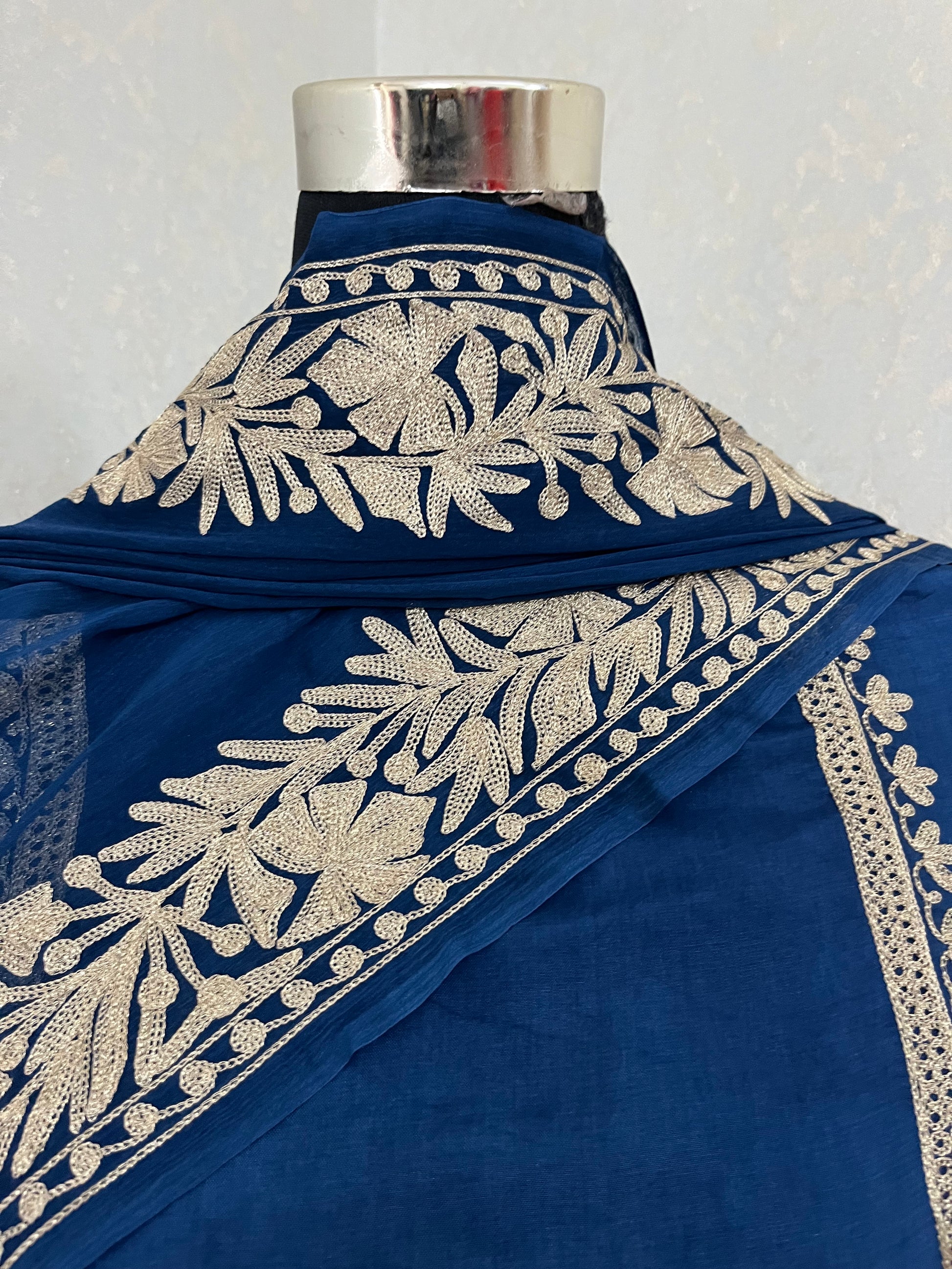 Experience the exquisite artistry of Kashmiri tilla embroidery .Each stitch tells a tale of craftsmanship, tradition, and intricate beauty. Elevate your wardrobe with this timeless treasure.