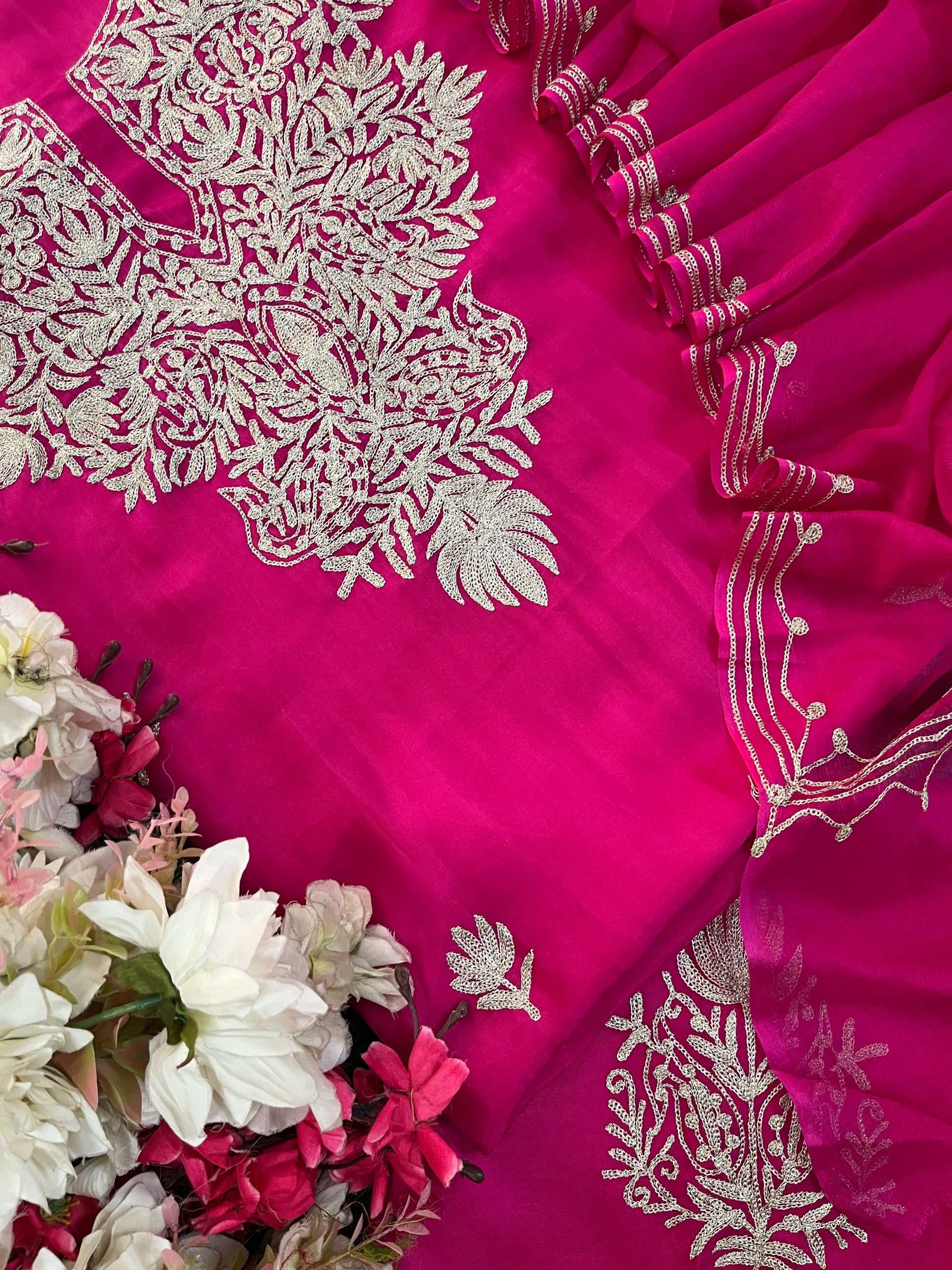 Experience the exquisite artistry of Kashmiri tilla embroidery .Each stitch tells a tale of craftsmanship, tradition, and intricate beauty. Elevate your wardrobe with this timeless treasure.
