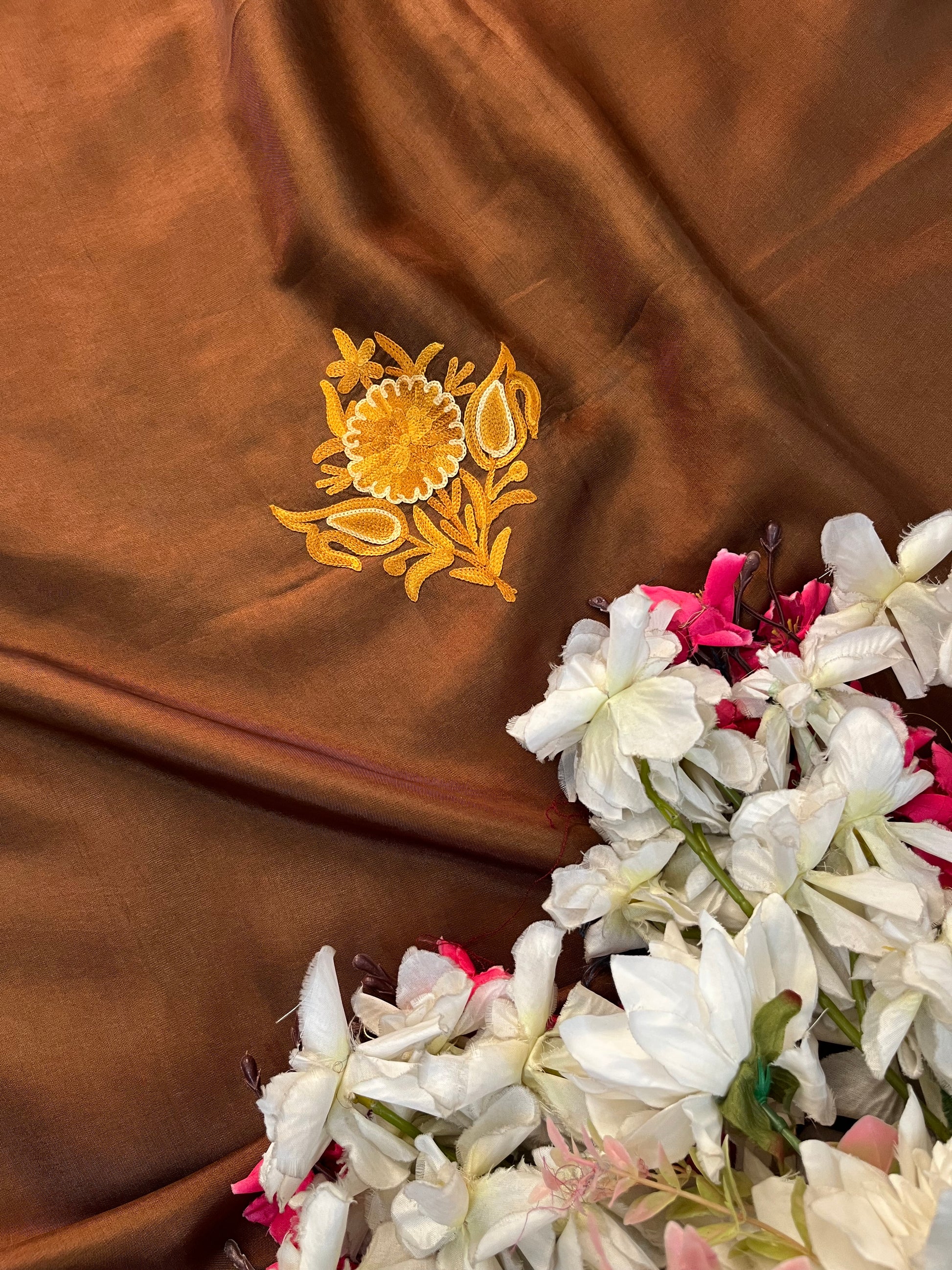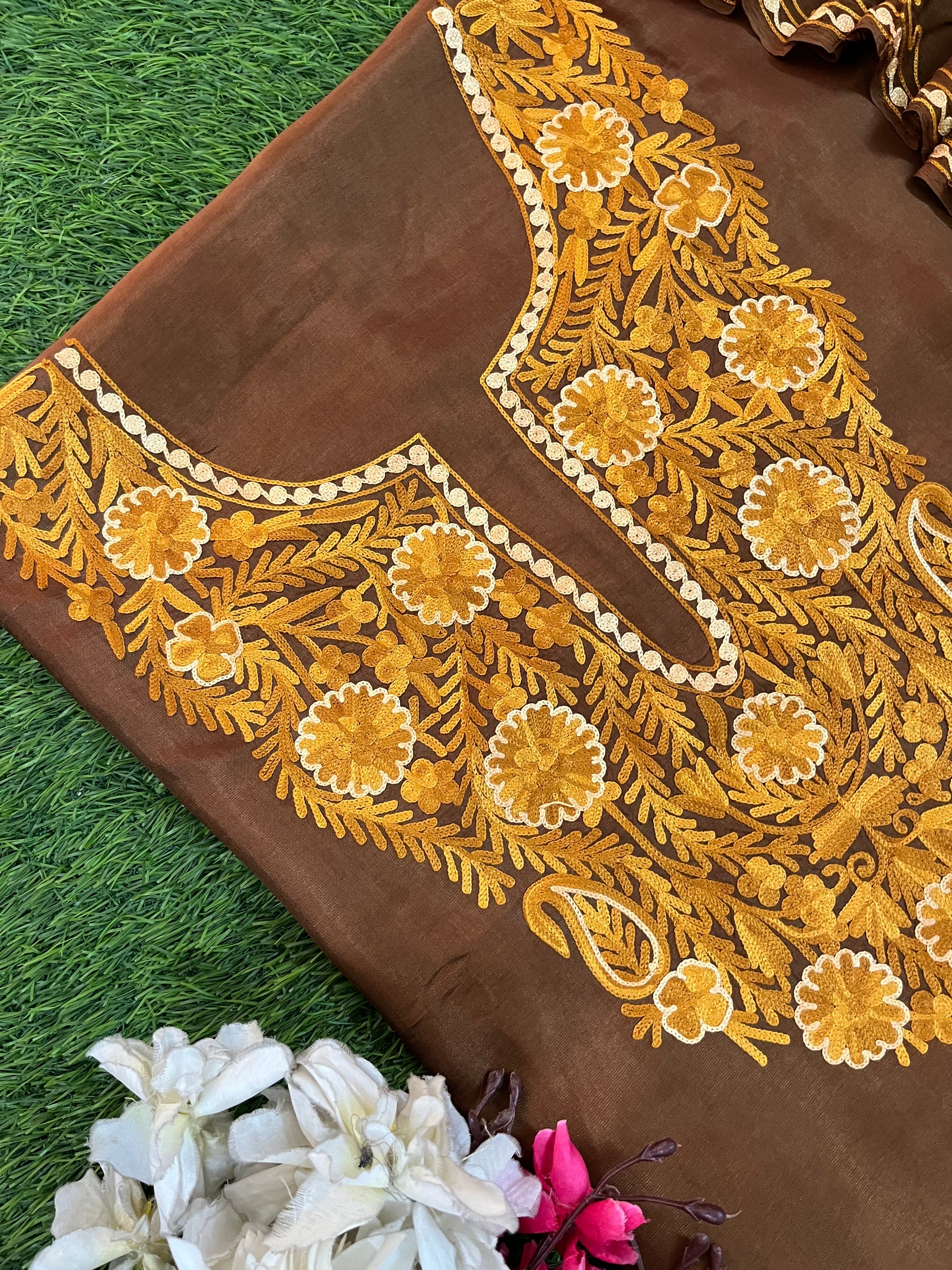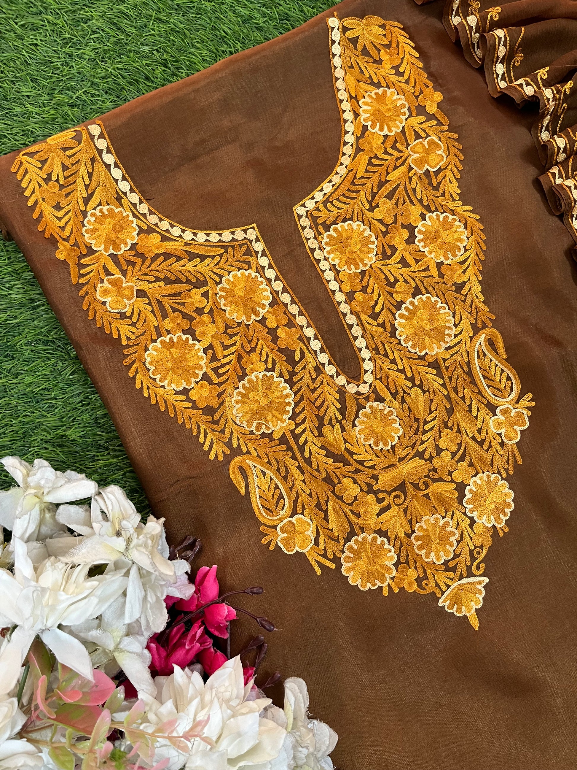 “Elegance meets tradition in this exquisite Kashmiri silk suit. Adorned with intricate embroidery, it exudes grace. Paired with a stunning heavy-embroidered dupatta, it’s a timeless ensemble of sophistication.”