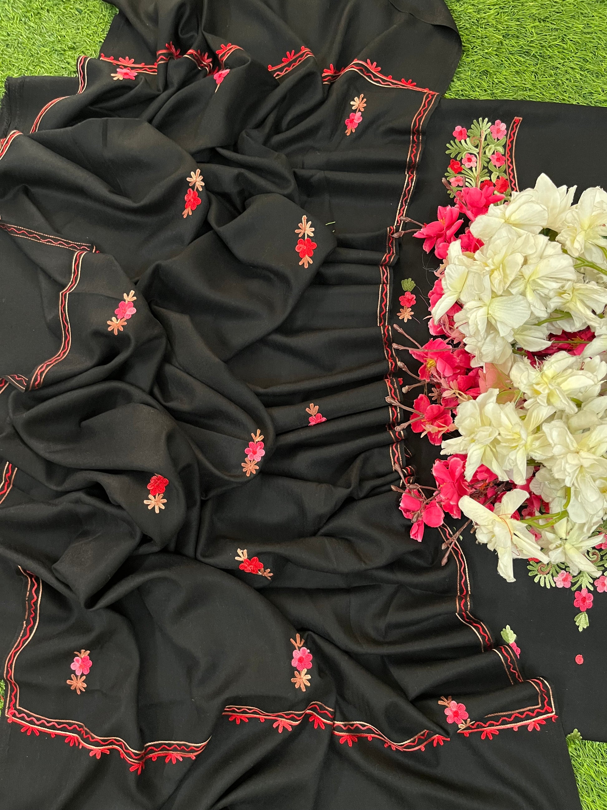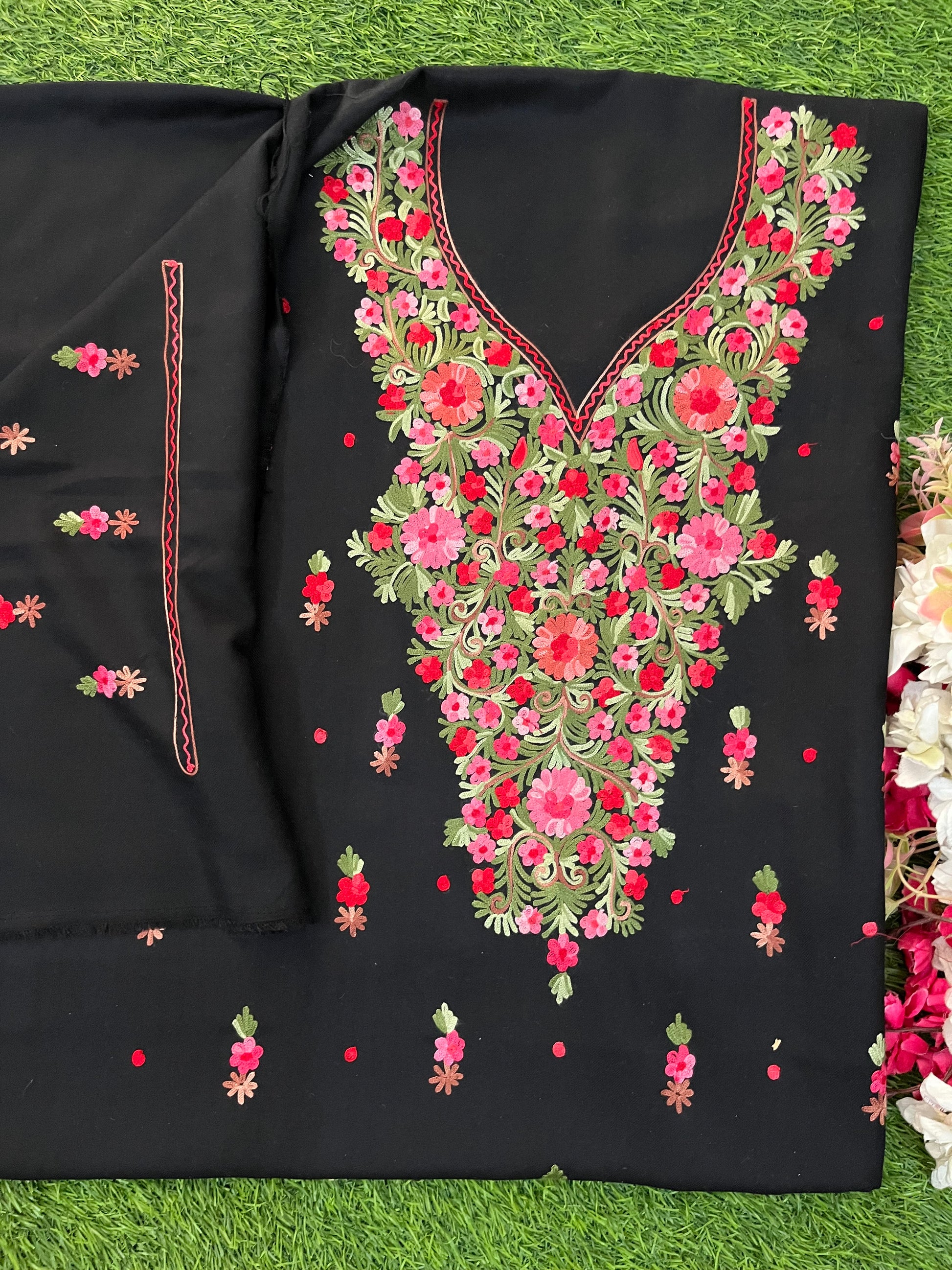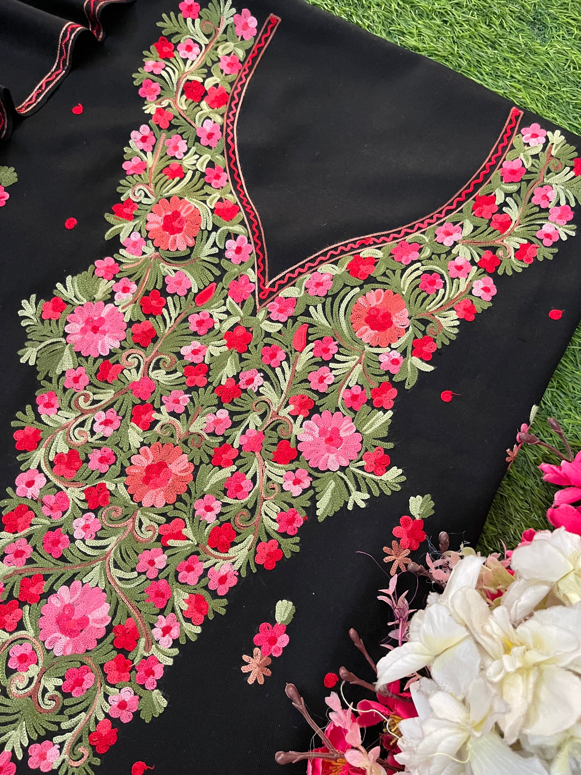 "Indulge in the timeless allure of Kashmiri embroidered spun suits, a harmonious blend of intricate craftsmanship and the comforting warmth of wool. Embrace tradition and elegance while cocooned in luxurious, handcrafted ensembles, perfect for chilly days."