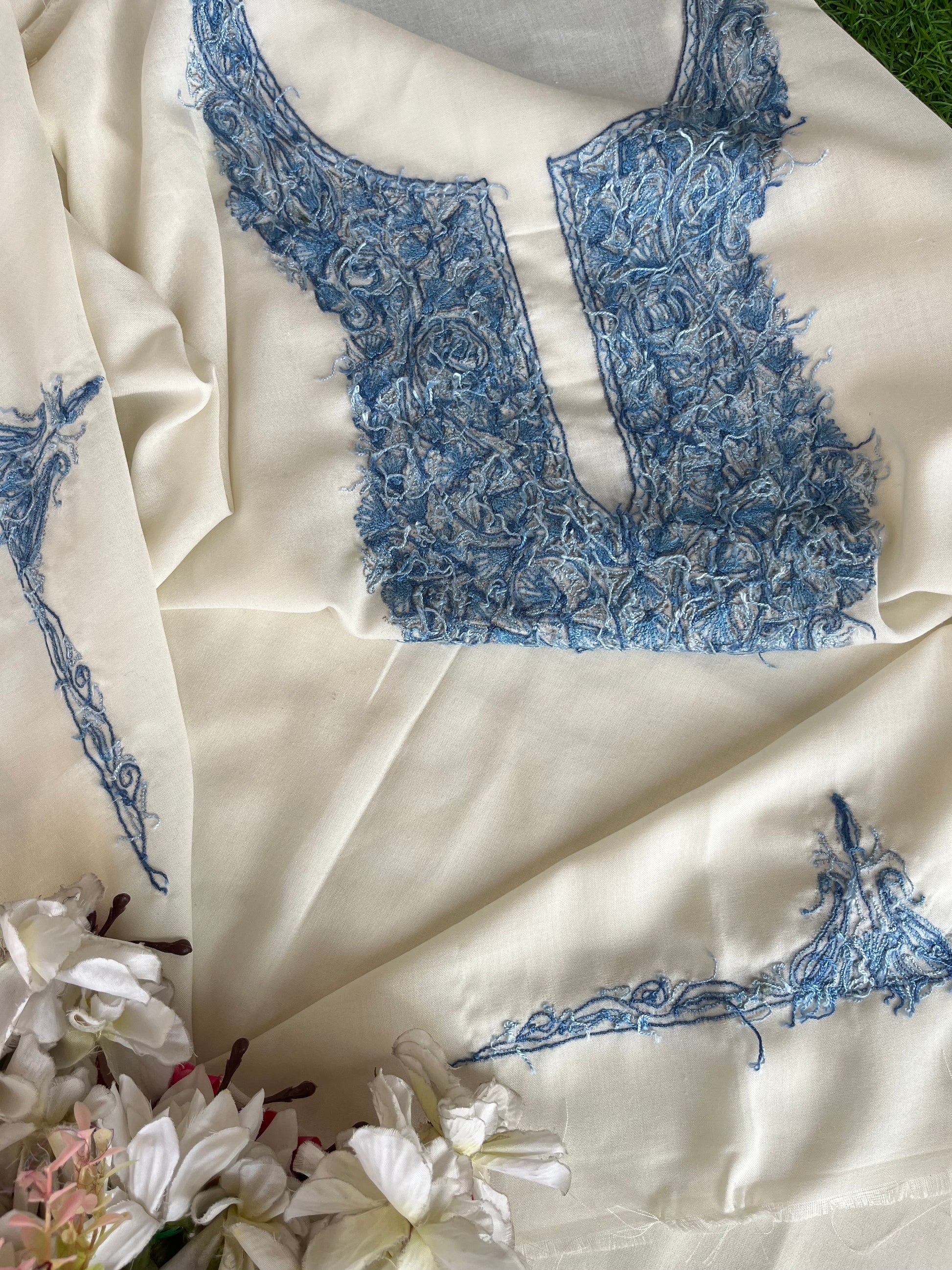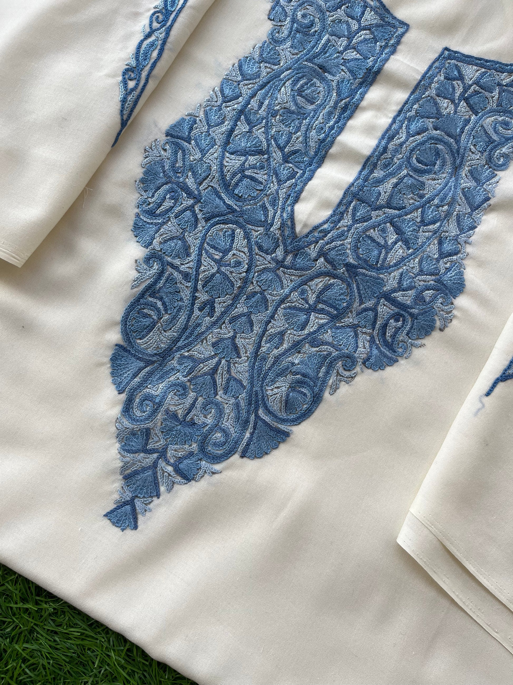 Off White Cotton Two Piece Suit (Hand Embroidered)