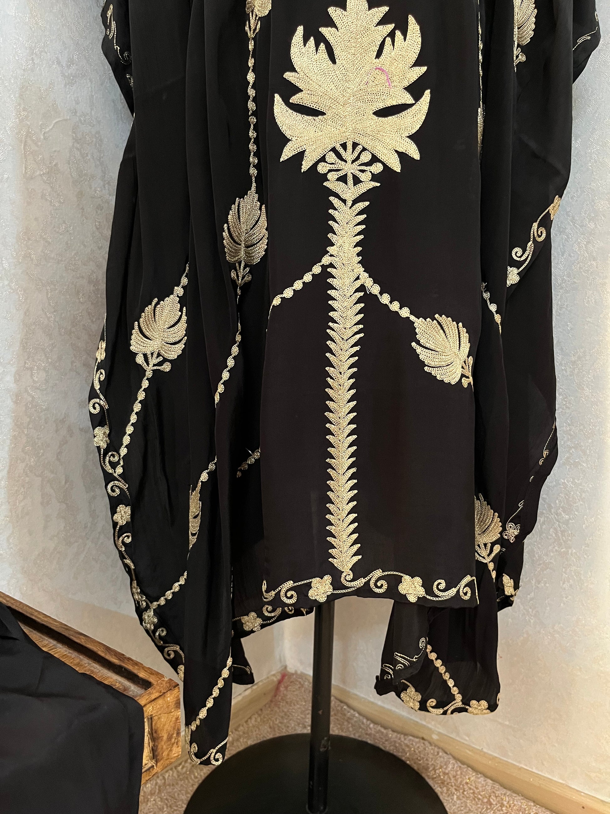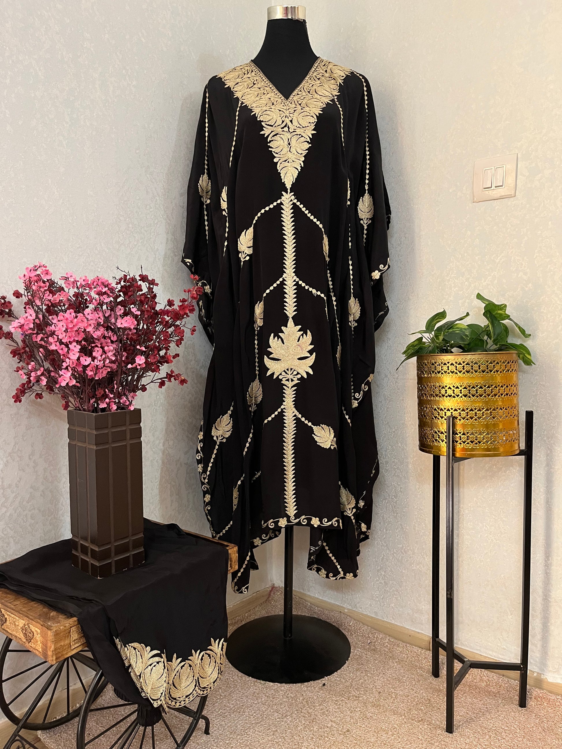 The beauty of a long falling Kaftan, in combination with the traditional art of aari is bound to result in only stylish attire. The gorgeous Kaftan in the bright colors of aari floral charms make this Kaftan a must have for all ladies and should find place in your wardrobe.