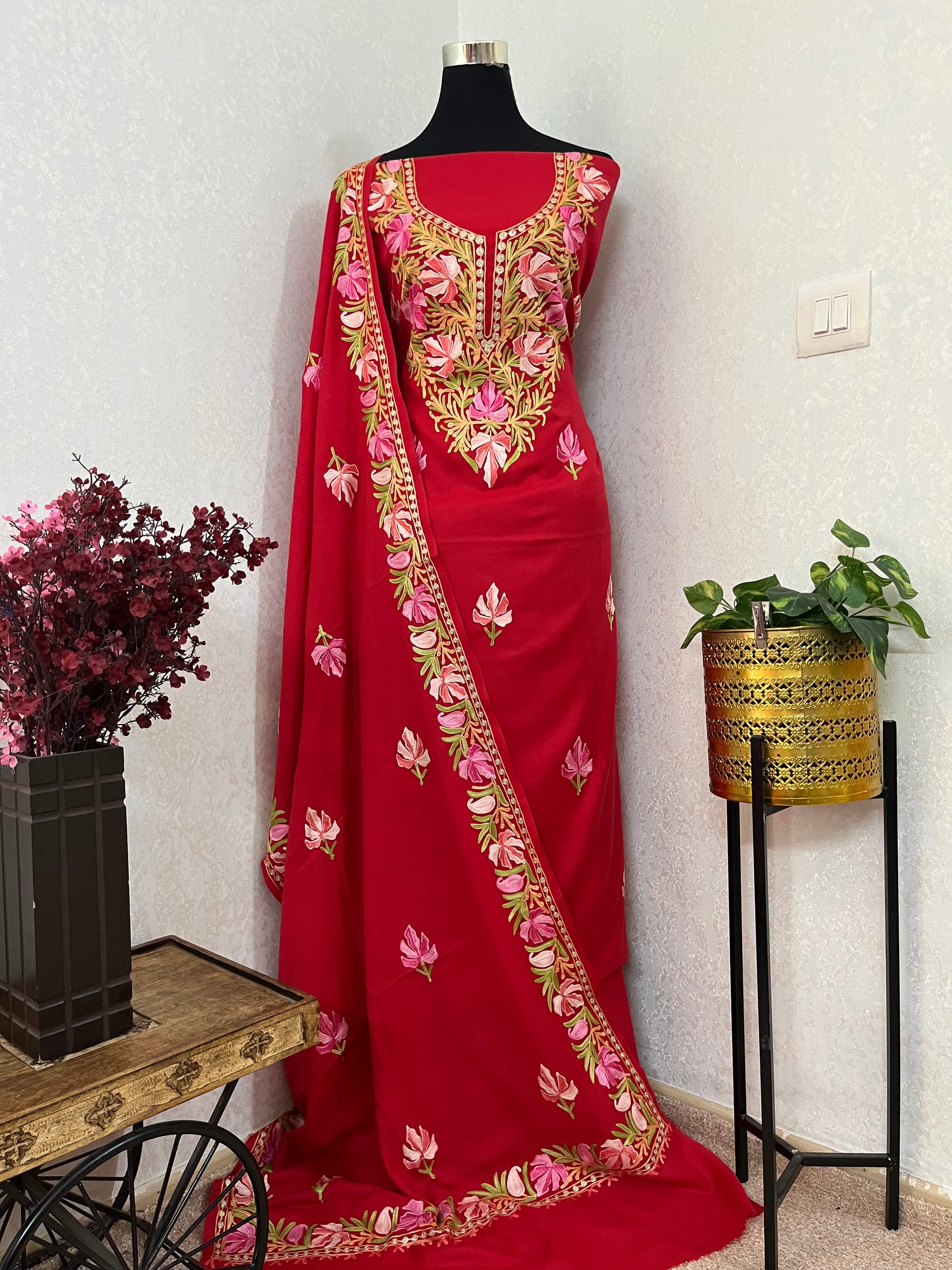 Red Pure Wool Aari Embroidered 3pc Suit Stole