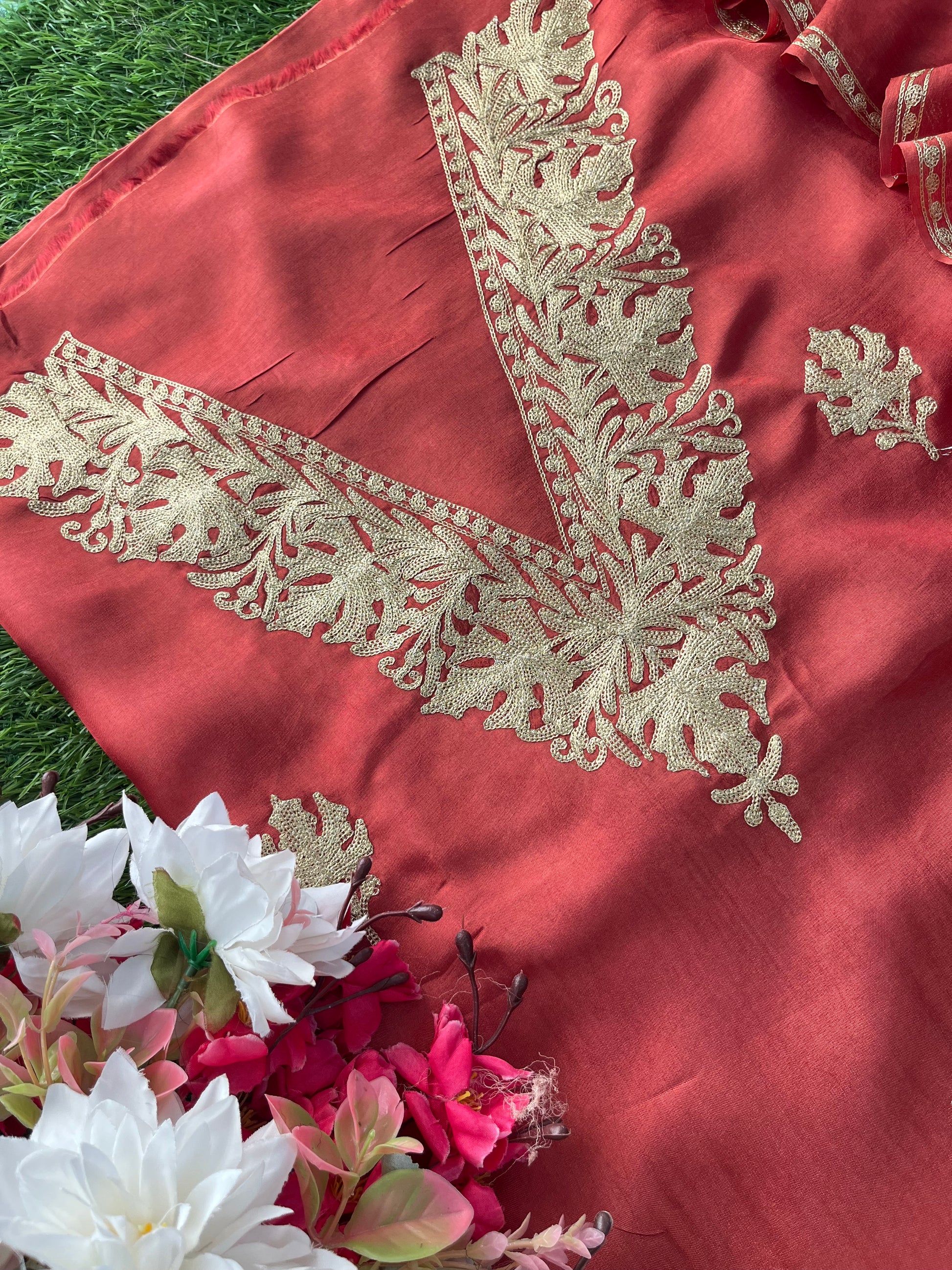 Experience the exquisite artistry of Kashmiri tilla embroidery .Each stitch tells a tale of craftsmanship, tradition, and intricate beauty. Elevate your wardrobe with this timeless treasure.