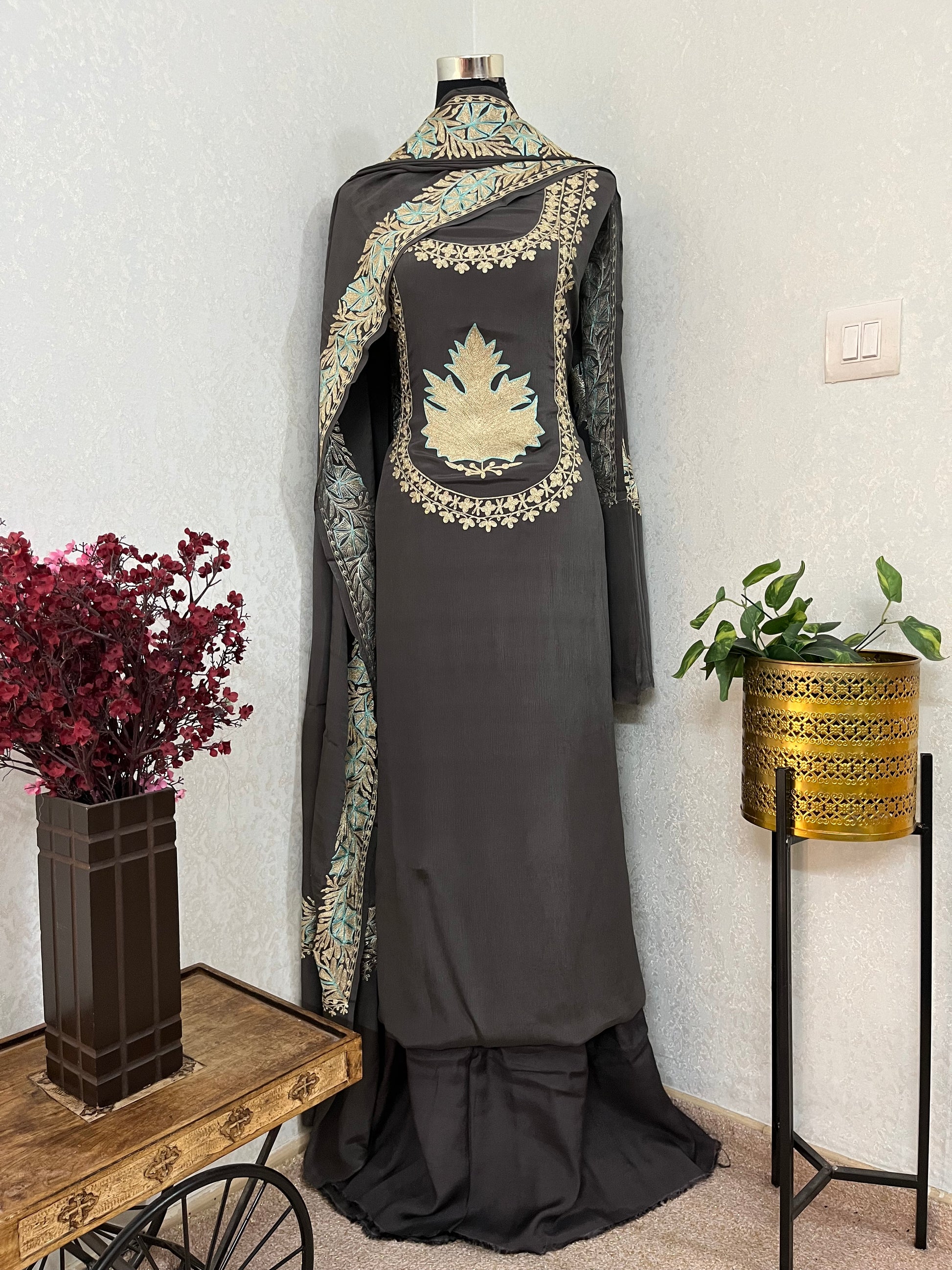Grey Chinon 3 Pc Aari Embroidered Suit