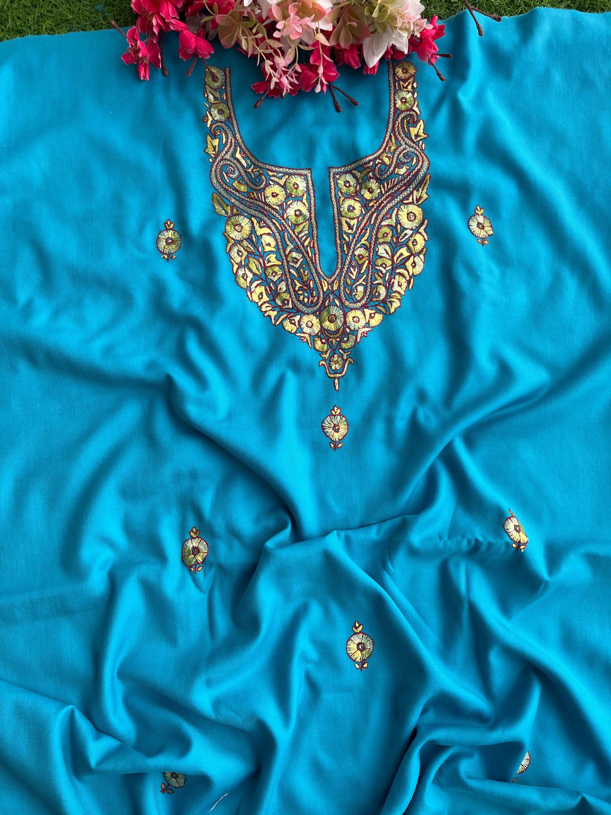 Sky Blue Fine Wool Sozni Embroidered 3pc Suit Stole