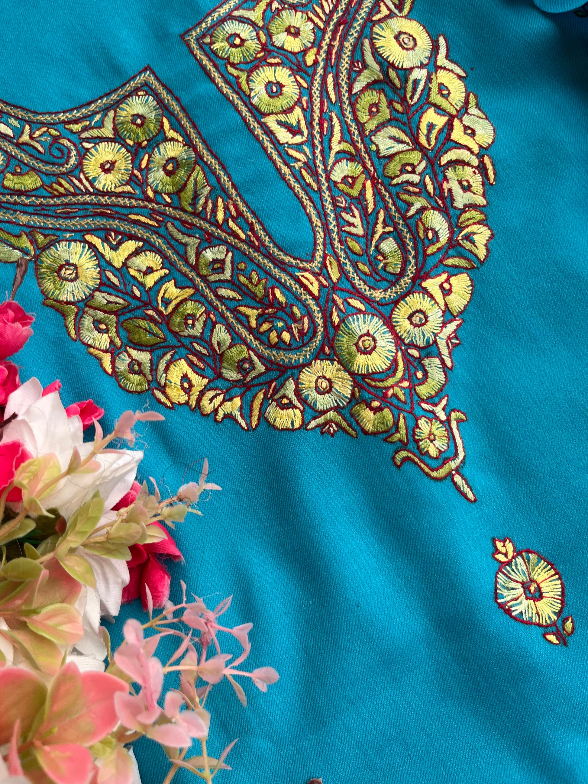 The embroidery features vibrant floral motifs, paisleys, and geometric designs, often highlighting cultural and natural elements of Kashmir. Each stitch is a labor of love, creating an exquisite texture and depth, making every suit a unique piece of wearable art. The embroideryâs fine, meticulous execution adds an element of luxury, elevating the woolen fabric into a symbol of elegance and heritage.