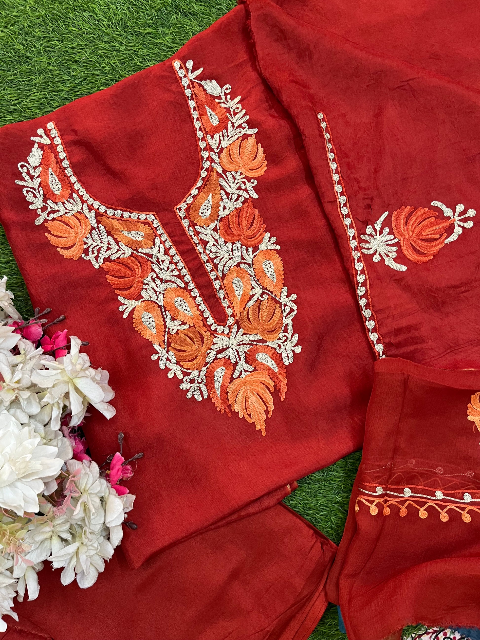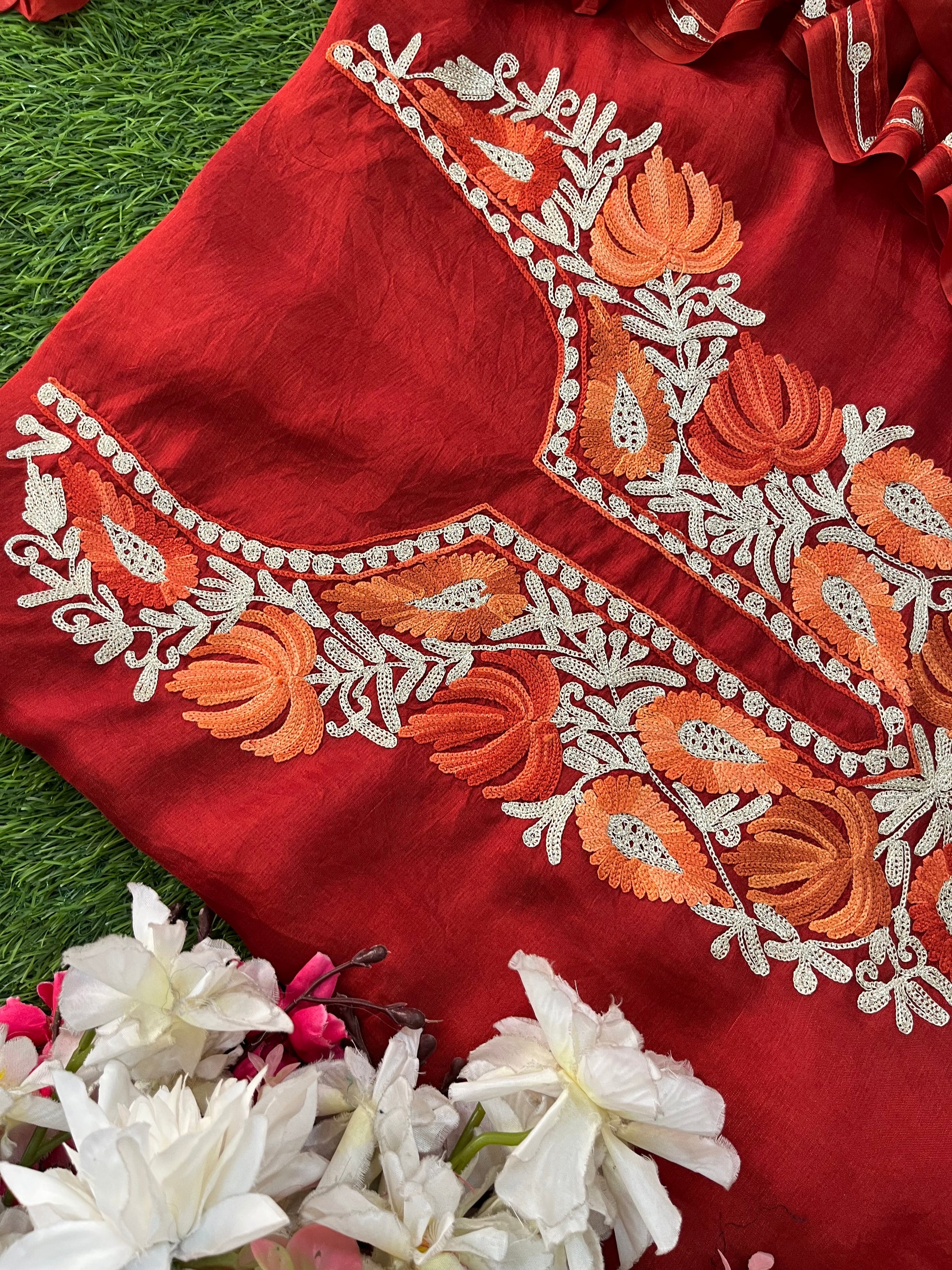 “Elegance meets tradition in this exquisite Kashmiri silk suit. Adorned with intricate Aari embroidery, it exudes grace. Paired with a stunning Dual Shade Chiffon dupatta, it’s a timeless ensemble of sophistication.”