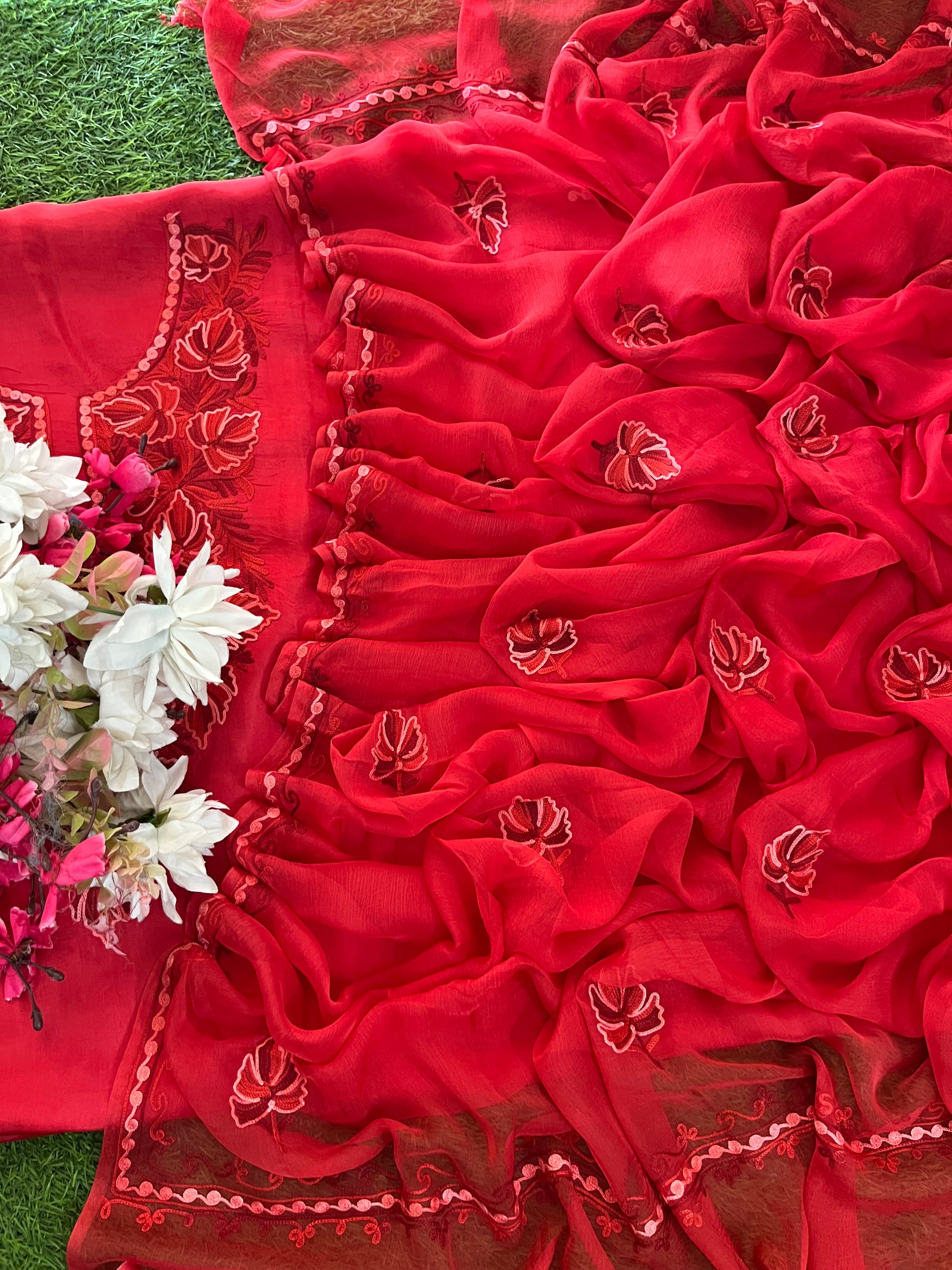 “Elegance meets tradition in this exquisite Kashmiri silk suit. Adorned with intricate embroidery, it exudes grace. Paired with a stunning heavy-embroidered dupatta, it’s a timeless ensemble of sophistication.”
