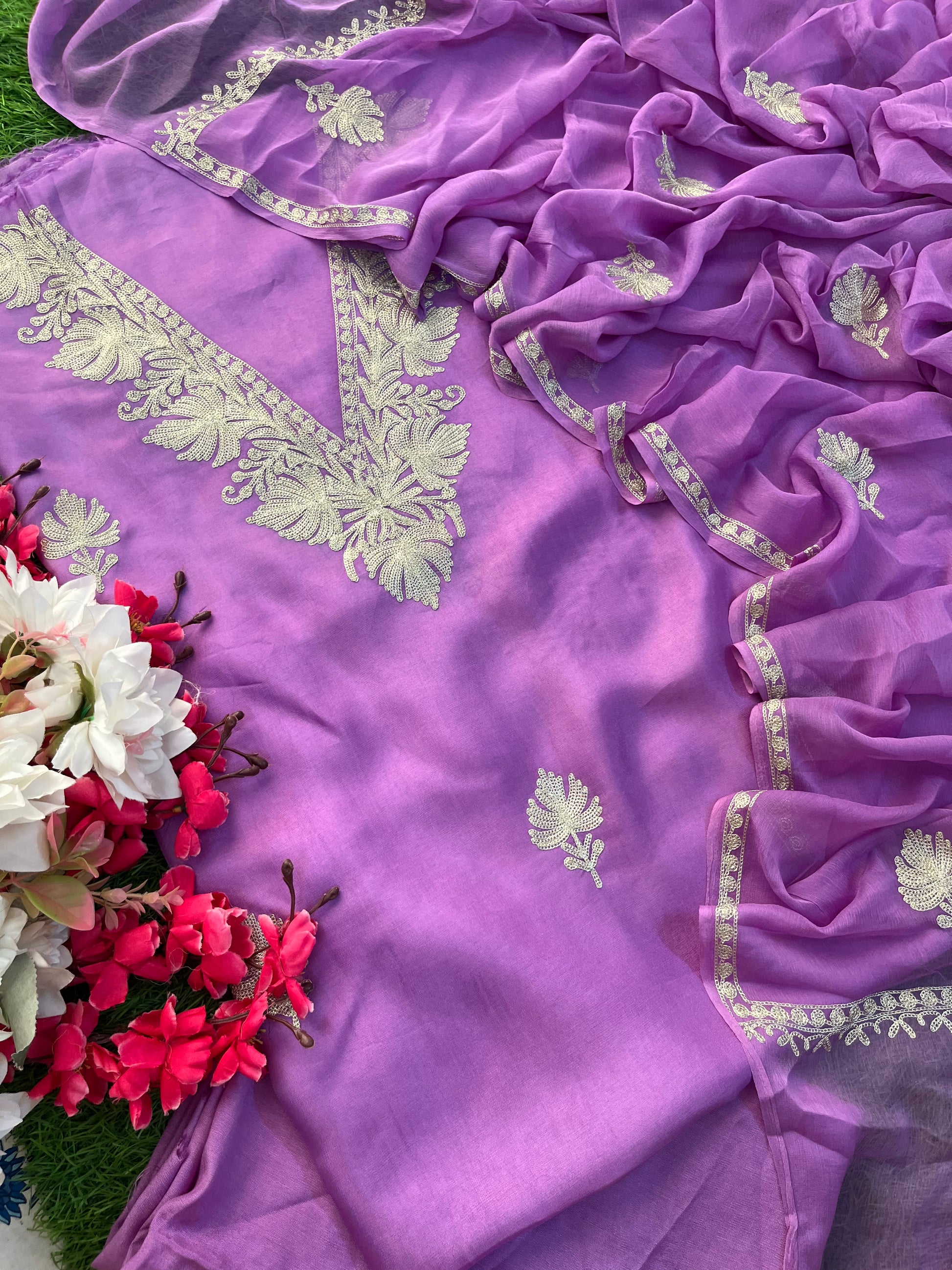 Indulge in the epitome of elegance with this luxury Kashmiri Tilla embroidered suit. Meticulously handcrafted with intricate details, this opulent ensemble exudes regality and showcases the rich cultural heritage of Kashmir.