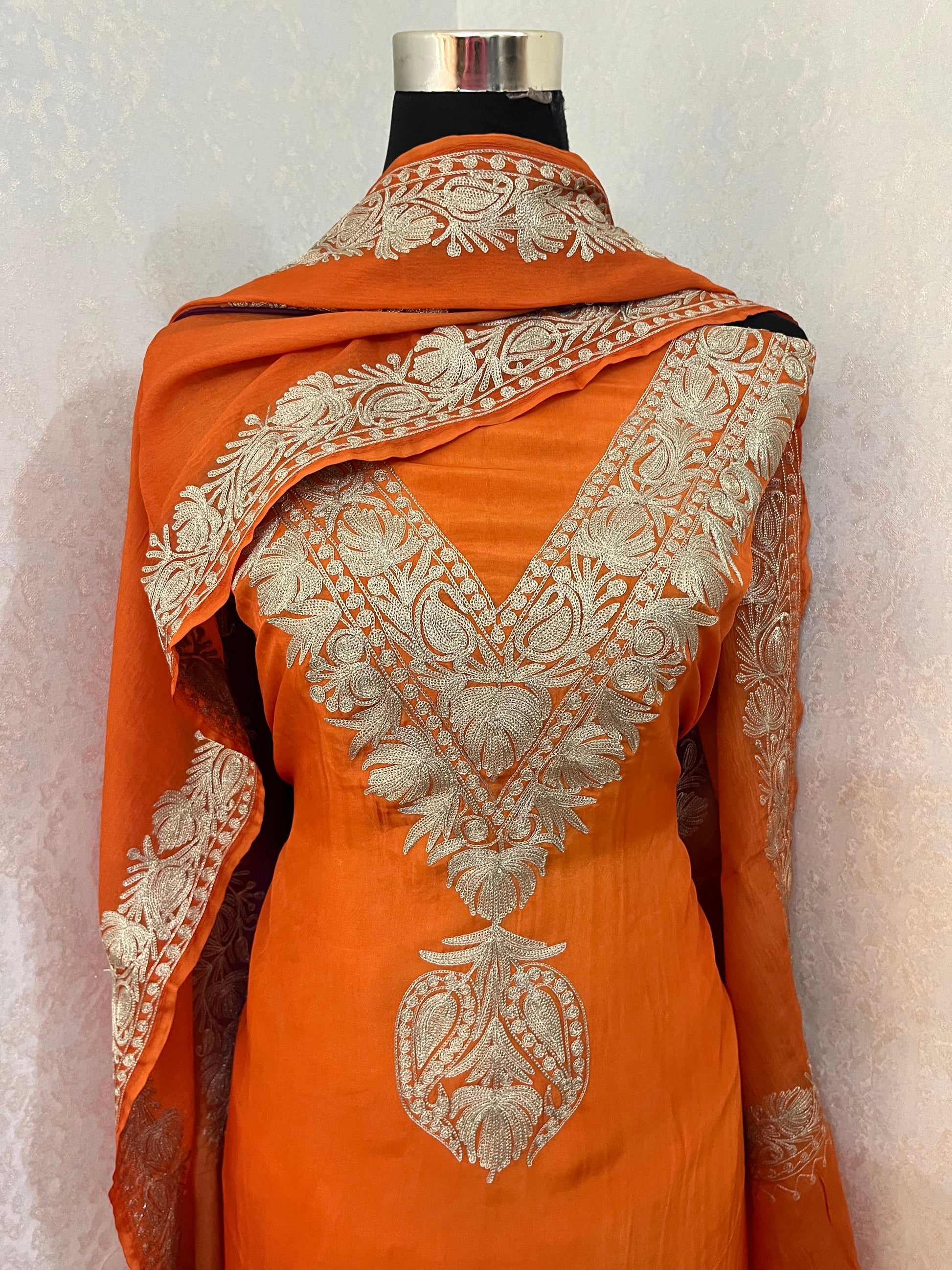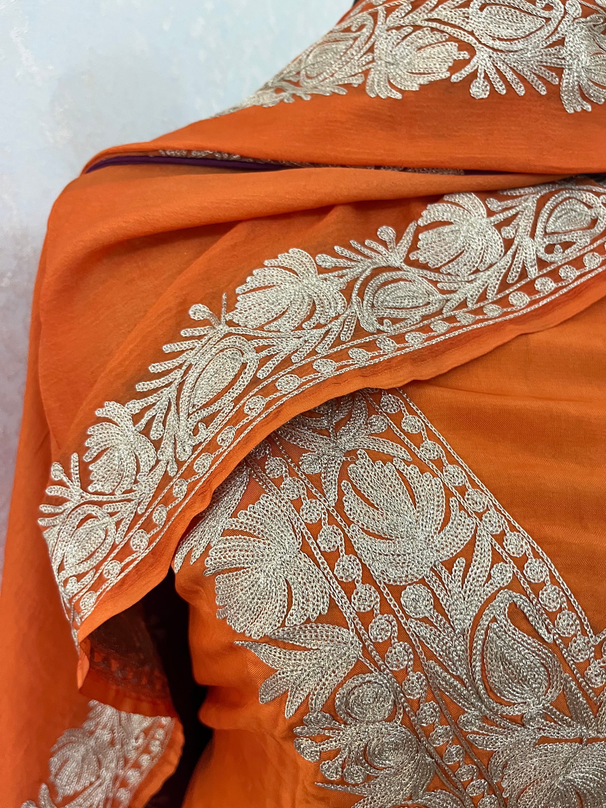 Elevate your elegance with our luxurious Silk Kashmiri Tilla Embroidered Suit, paired with a stunning double-shade Tabee Silk Dupatta.