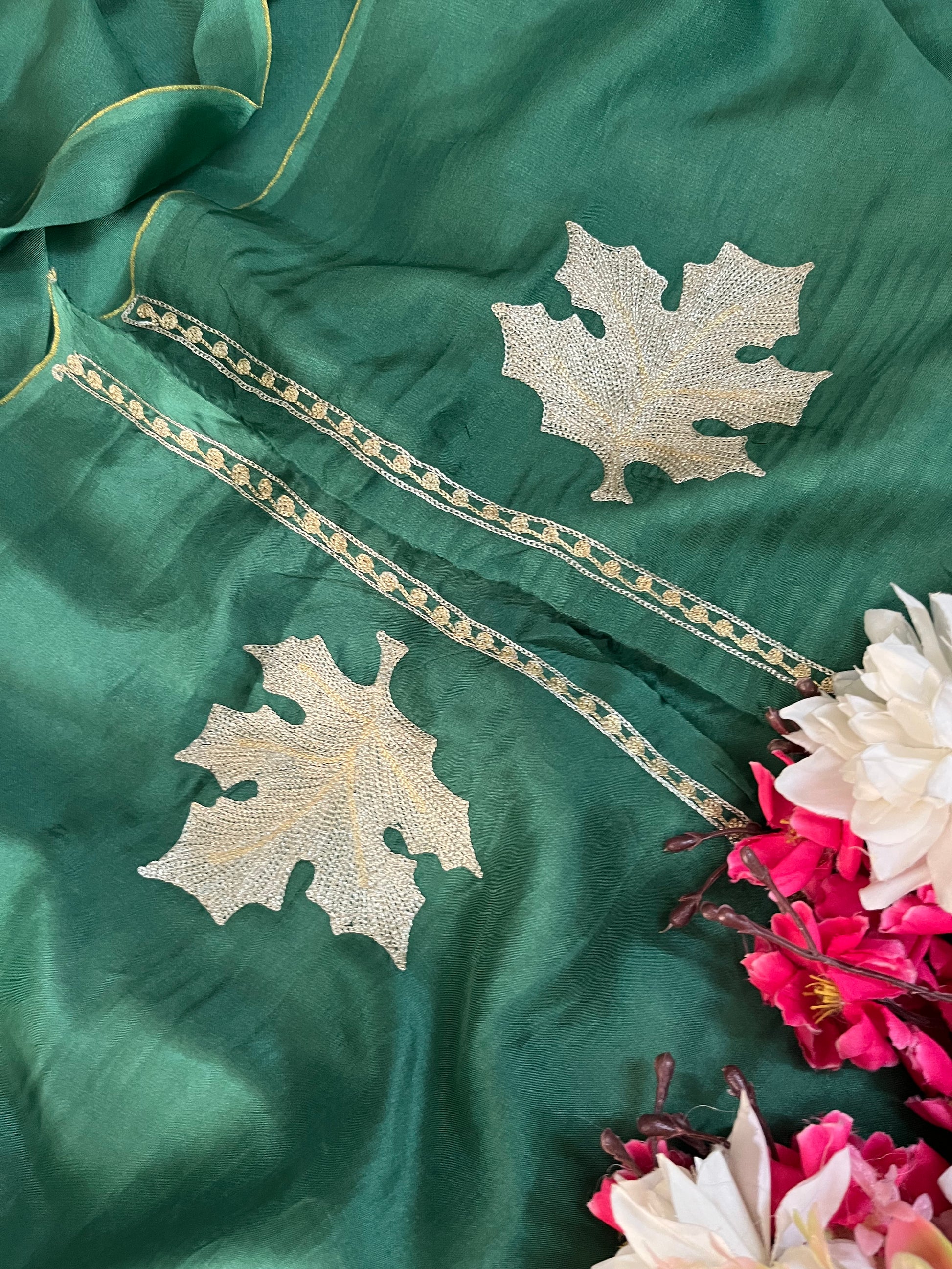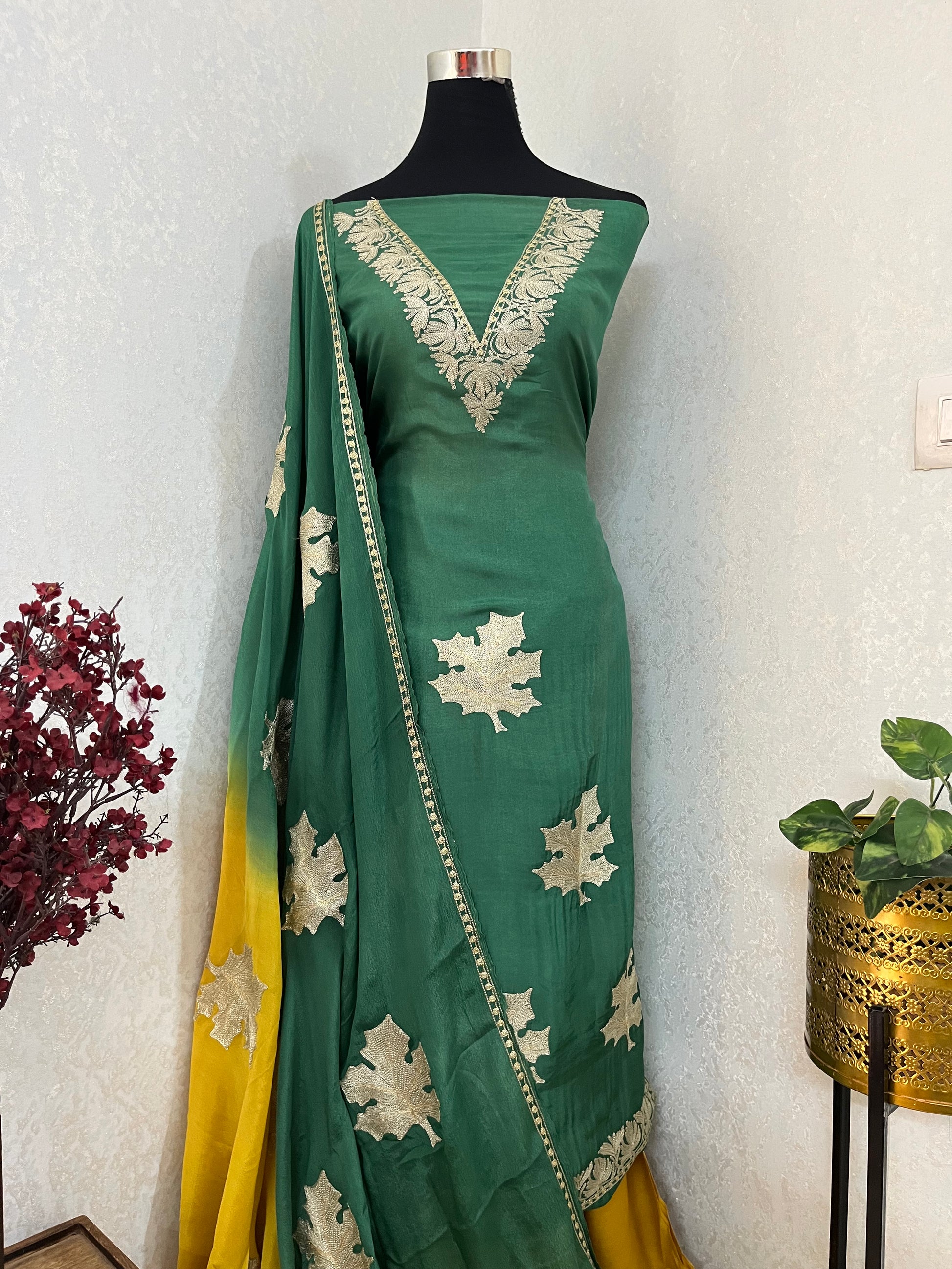 Elevate your elegance with our luxurious Silk Kashmiri Tilla Embroidered Suit, paired with a stunning double-shade Tabee Silk Dupatta.