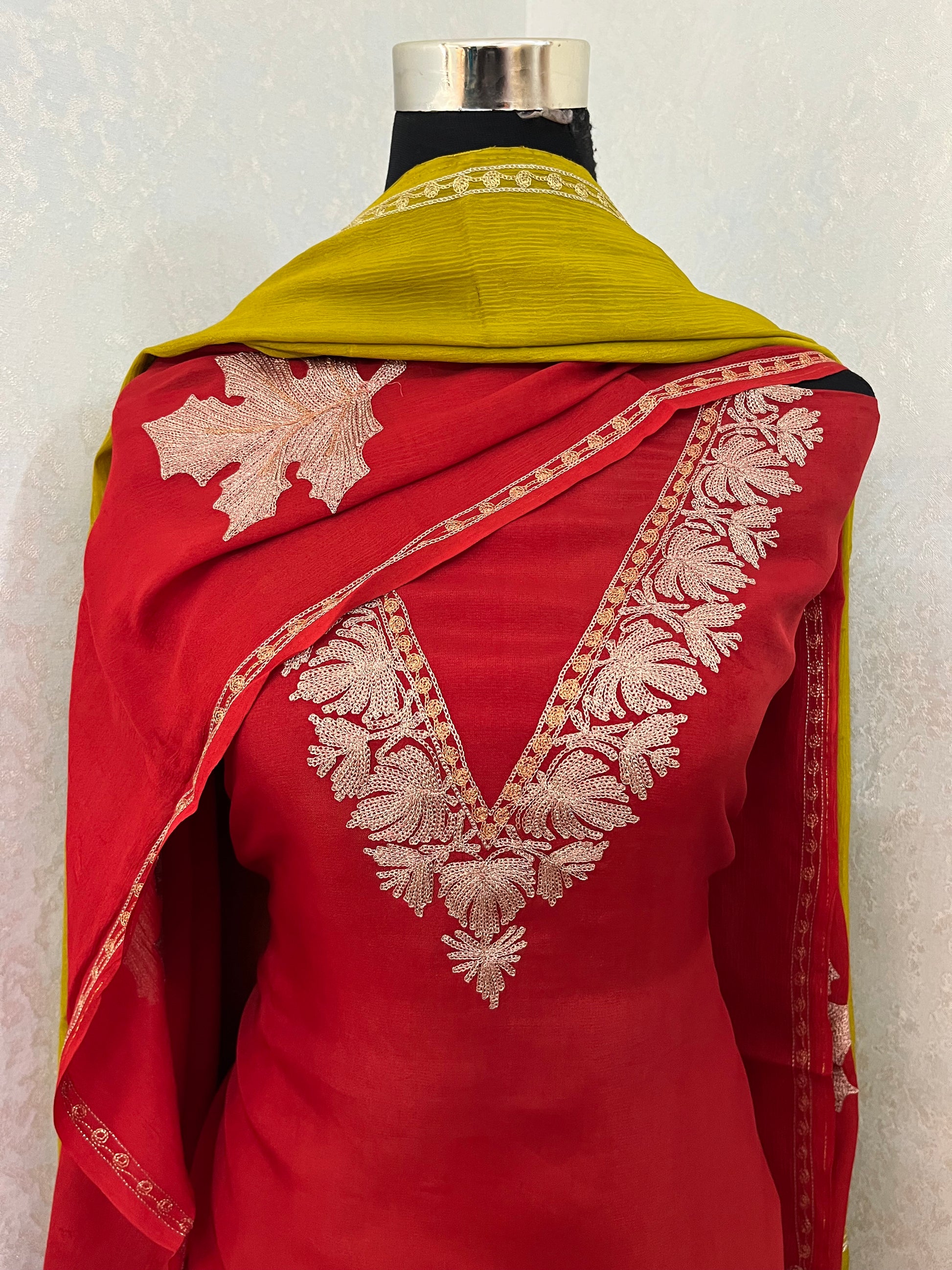 Elevate your elegance with our luxurious Silk Kashmiri Tilla Embroidered Suit, paired with a stunning double-shade Tabee Silk Dupatta.
